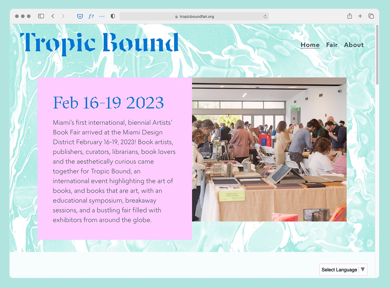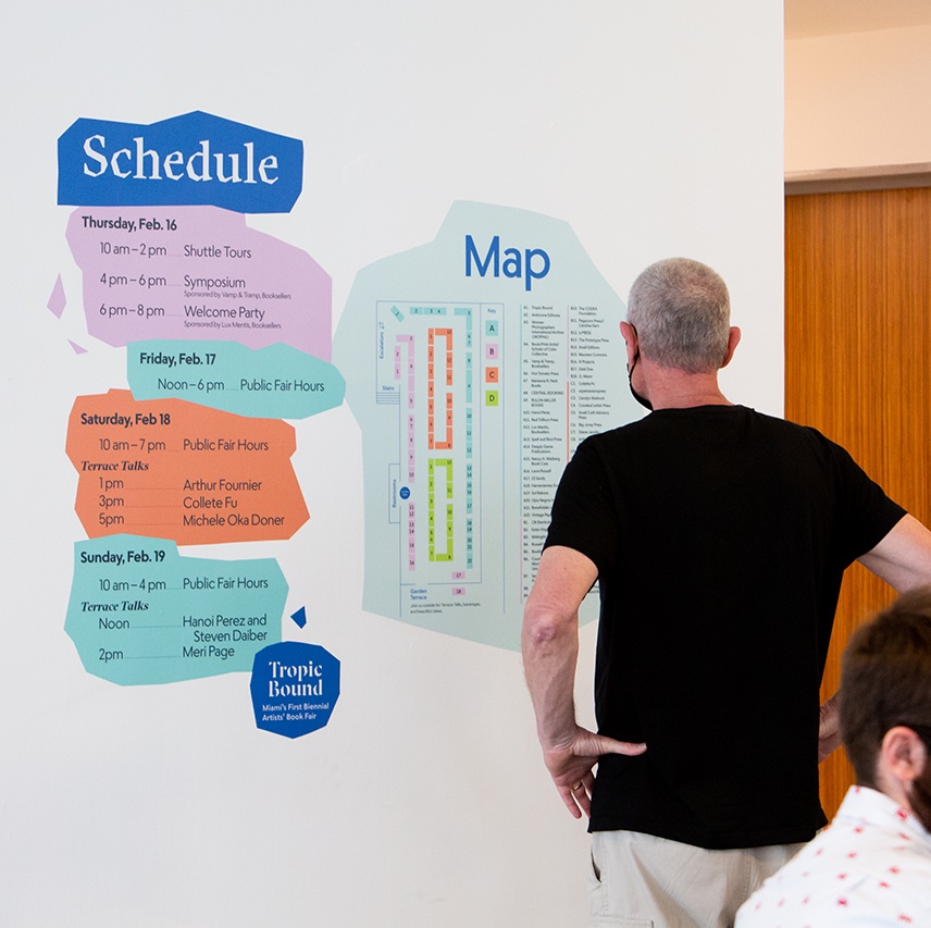 Tropic Bound is a biennial artists’ book fair led by Cristina Favretto, Sarah Michelle Rupert, and Ingrid Schindall. The inaugural 2023 fair featured book-centric tours through Miami, panel discussions, artist talks, and over 60 art book exhibitors.
