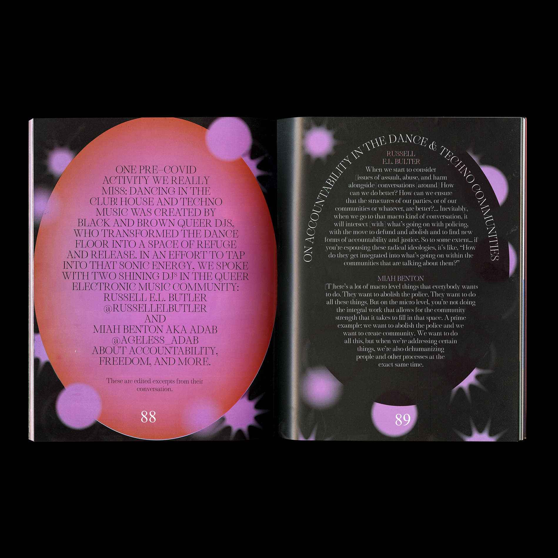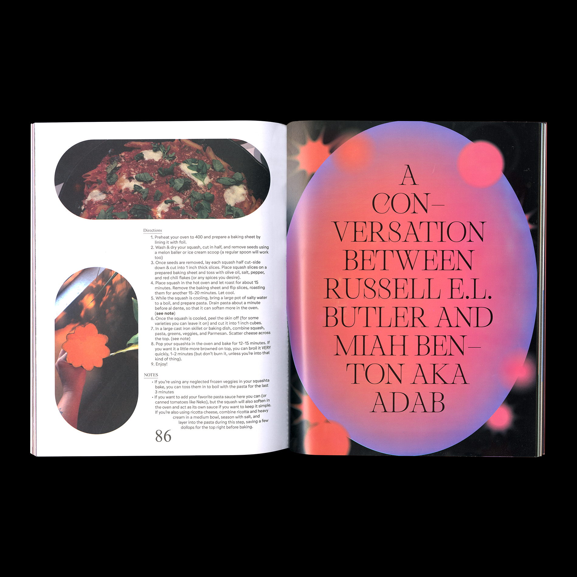 All fonts used for the typography are designed by women typedesigners. The magazine masthead is set in GlyphWorld Wasteland. In the interior, Gallique is used alongside Zorn. The sans serif used for the magazine cover is Jungka; the same typeface is used for the recipe, alongside Savon. Type marketplace Type Department supported the magazine by putting designer Mj Balvanera and project lead Salima Allen in touch with their women type designers.