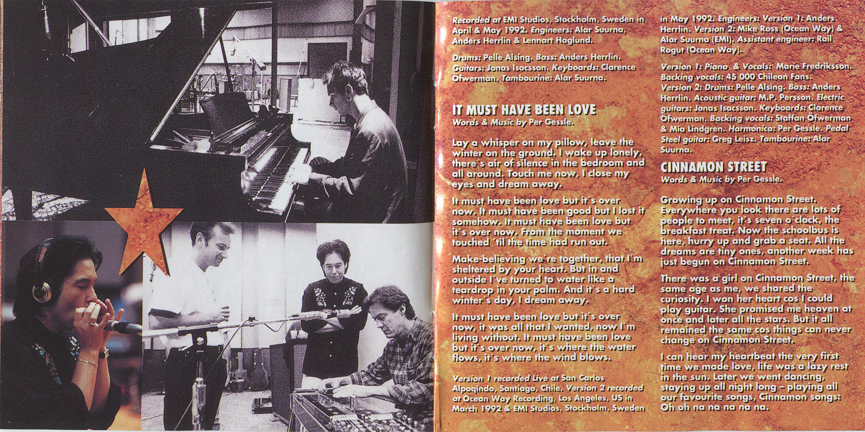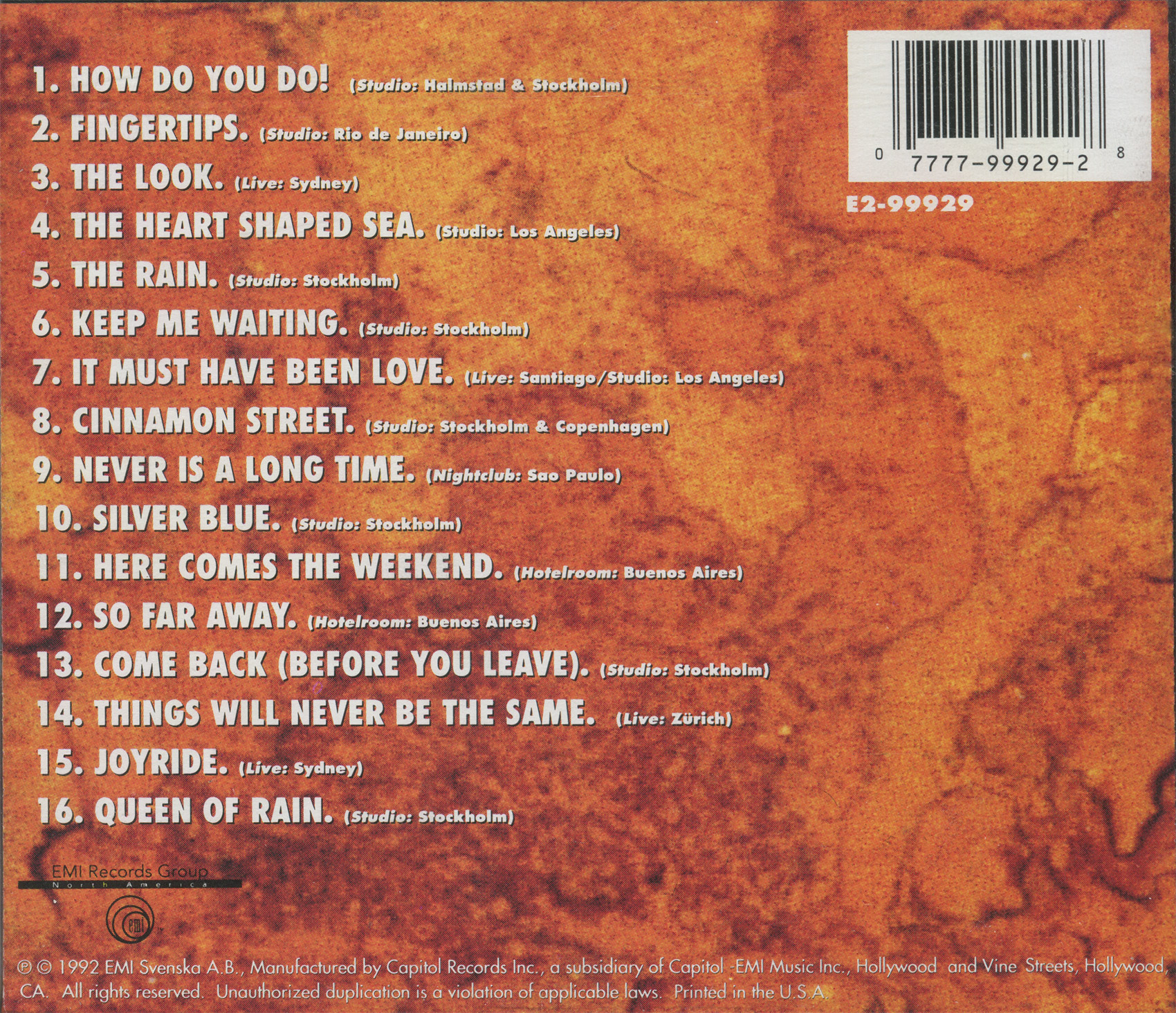 Roxette went on a major world tour in 1991–1992, Join the Joyride! During that tour they recorded songs, as they say on the sleeve – in “studios, stages, hotelrooms (sic) & other strange places”, among those the very famous Ocean Way Recording studio in Los Angeles where they cut a country version of their major hit “It Must Have Been Love”. Per asked the technician if they could have the piano sound like John Lennon’s in “Imagine”. The tech said yes, but why? It didn’t happen! Released on vinyl, CD, MC and MD.