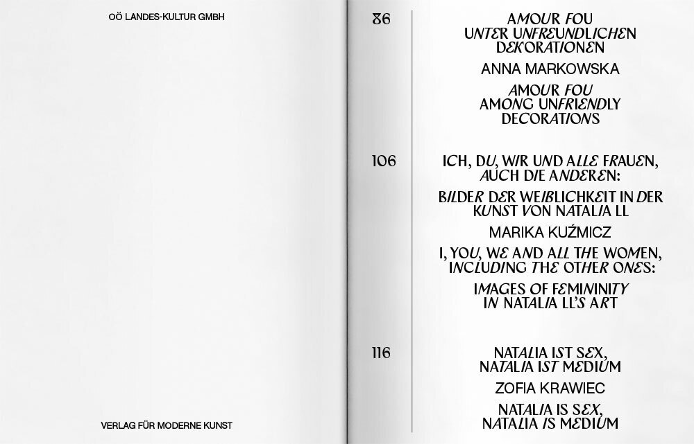 Bureau Est designed a catalogue accompanying Natalia LL’s retrospective The Mysterious World at Francisco Carolinum in Linz, Austria. The type palette features Zangezi Sans and Zangezi by Daria Cohen for titles, and AG Buch by Günter Gerhard Lange for running text.