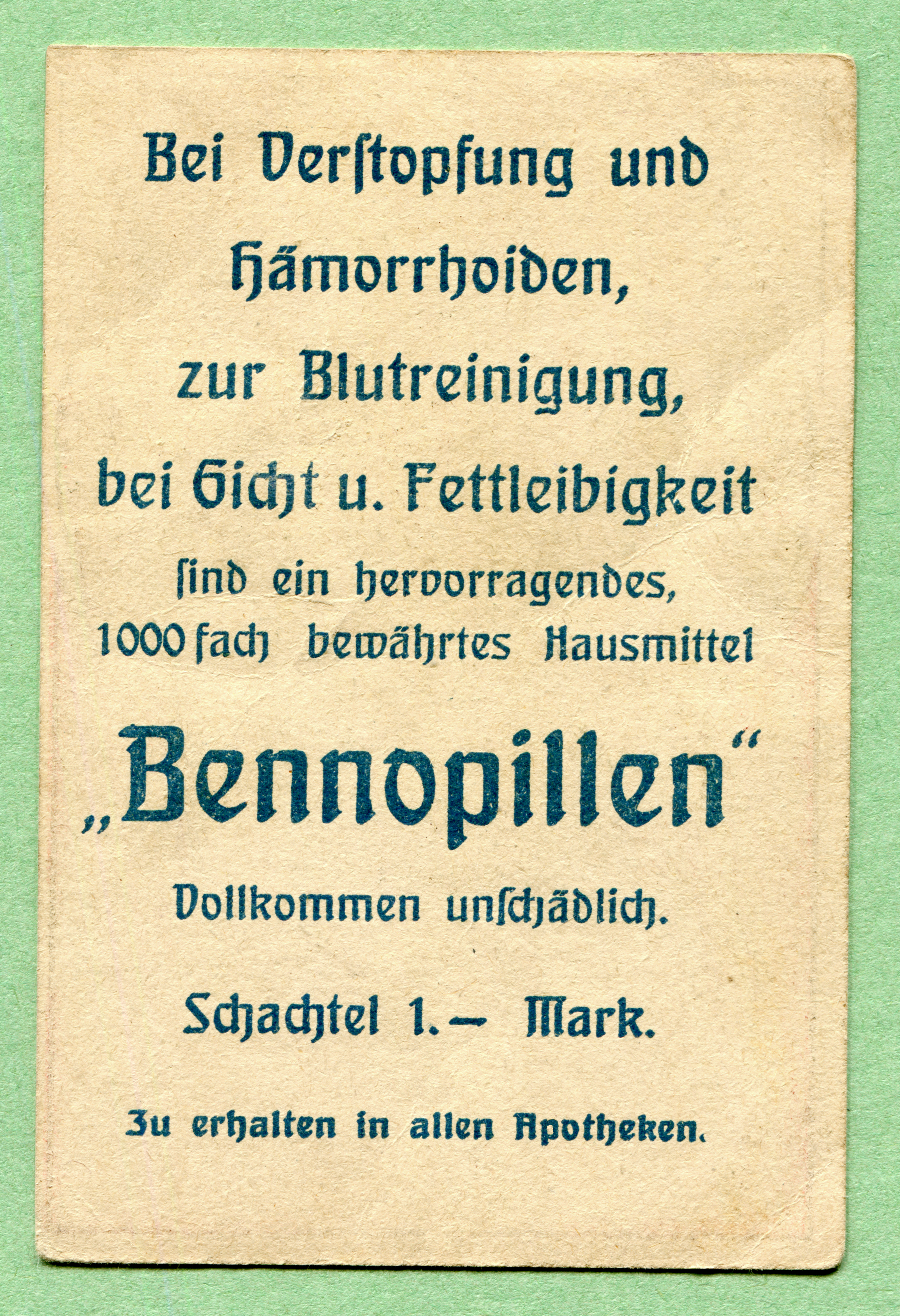 Behrens-Schrift (1901) in five different sizes, for an ad for “Bennopillen” on the back of a trading picture, probably from the first decade of the twentieth century. Bennopillen are praised a “excellent home remedy, proven thousands of times.” Produced by Voit & Comp. in Munich, they contained gentian and rhubarb as active ingredients. The drug was recommended for constipation and hemorrhoids, blood purification, gout and obesity.