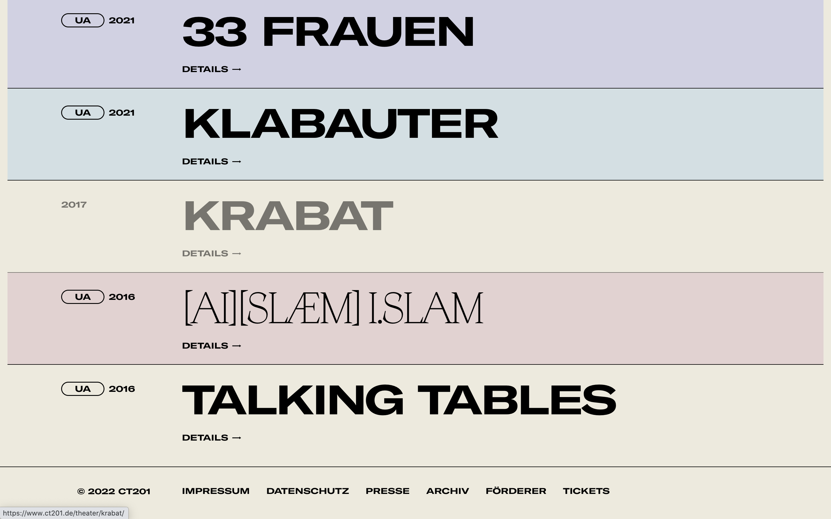 Since it was founded in 1993, ct201 has been producing unconventional theater productions that address socially relevant topics and provide various directors and theater professionals with the basis for their artistic work. The theater seeks and finds new ways to get in touch with the audience in order to produce communicative theater by always trying to take different perspectives and understand different attitudes. Their work is focused therefore on open, experimental, inclusive and topic-based work.