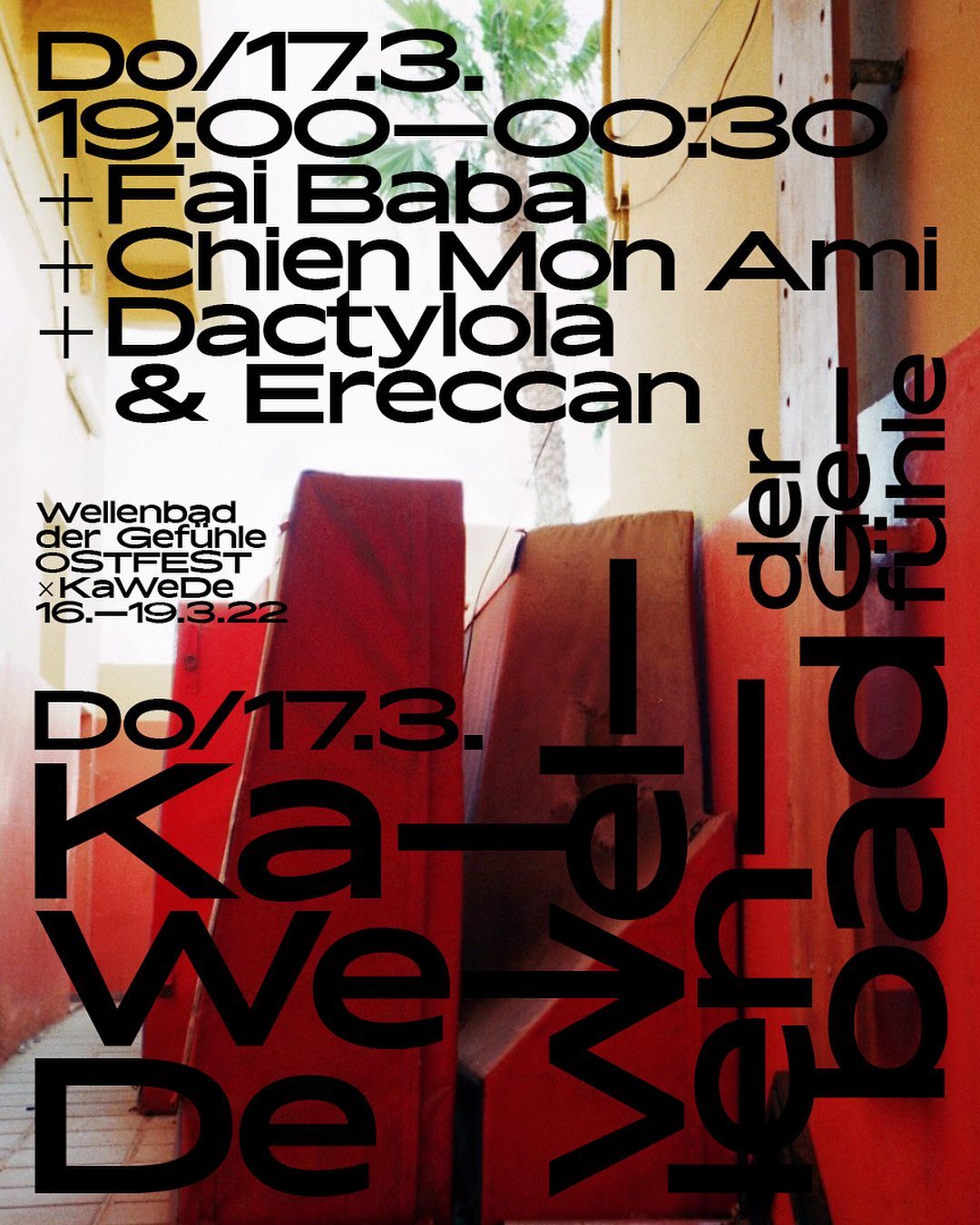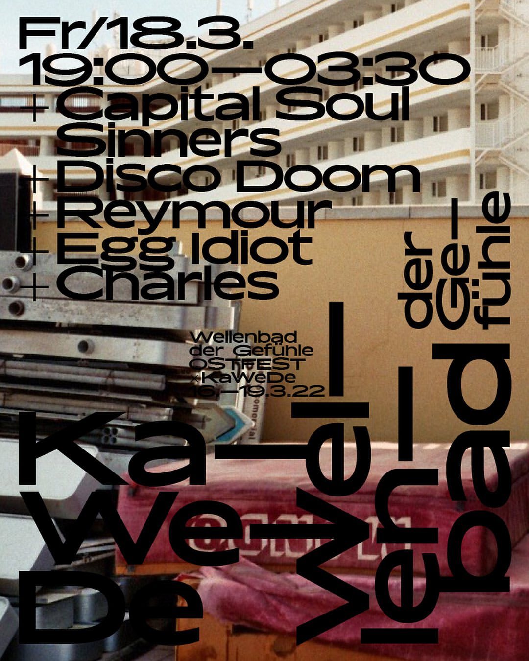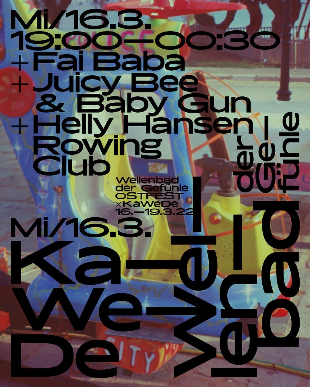 The Ostfest is back. Nearly. […] So let’s sing something together, you me, a kind of trauma management in five steps. Only works with music: almost forbidden, well-guarded, dialectical in dialect, stolen from farms, halls of mirrors and the Internet. Displacement, confrontation, drama, acceptance, coping and always happy to eat greasy food – we stay awake for four days in the KaWeDe frying kitchen, think hockey is ok and wash away old pains in the wave pool Do you feel it too?