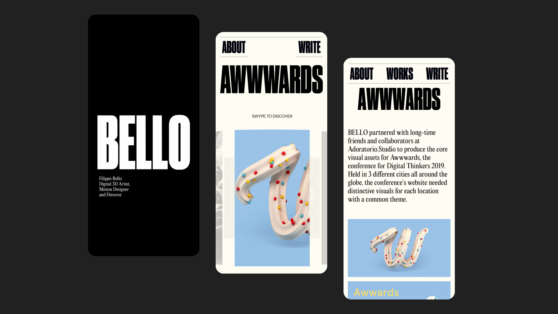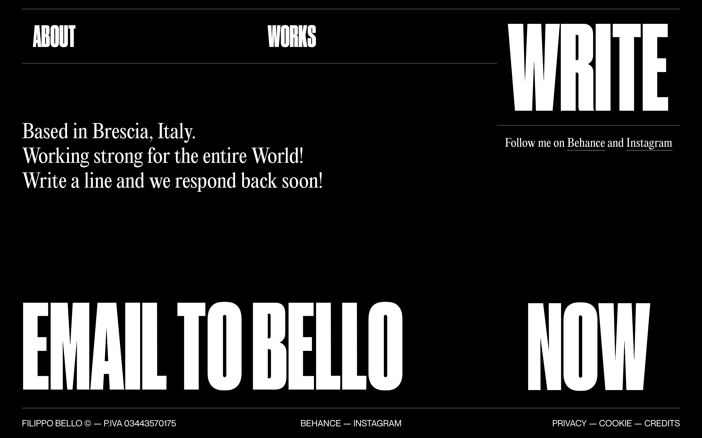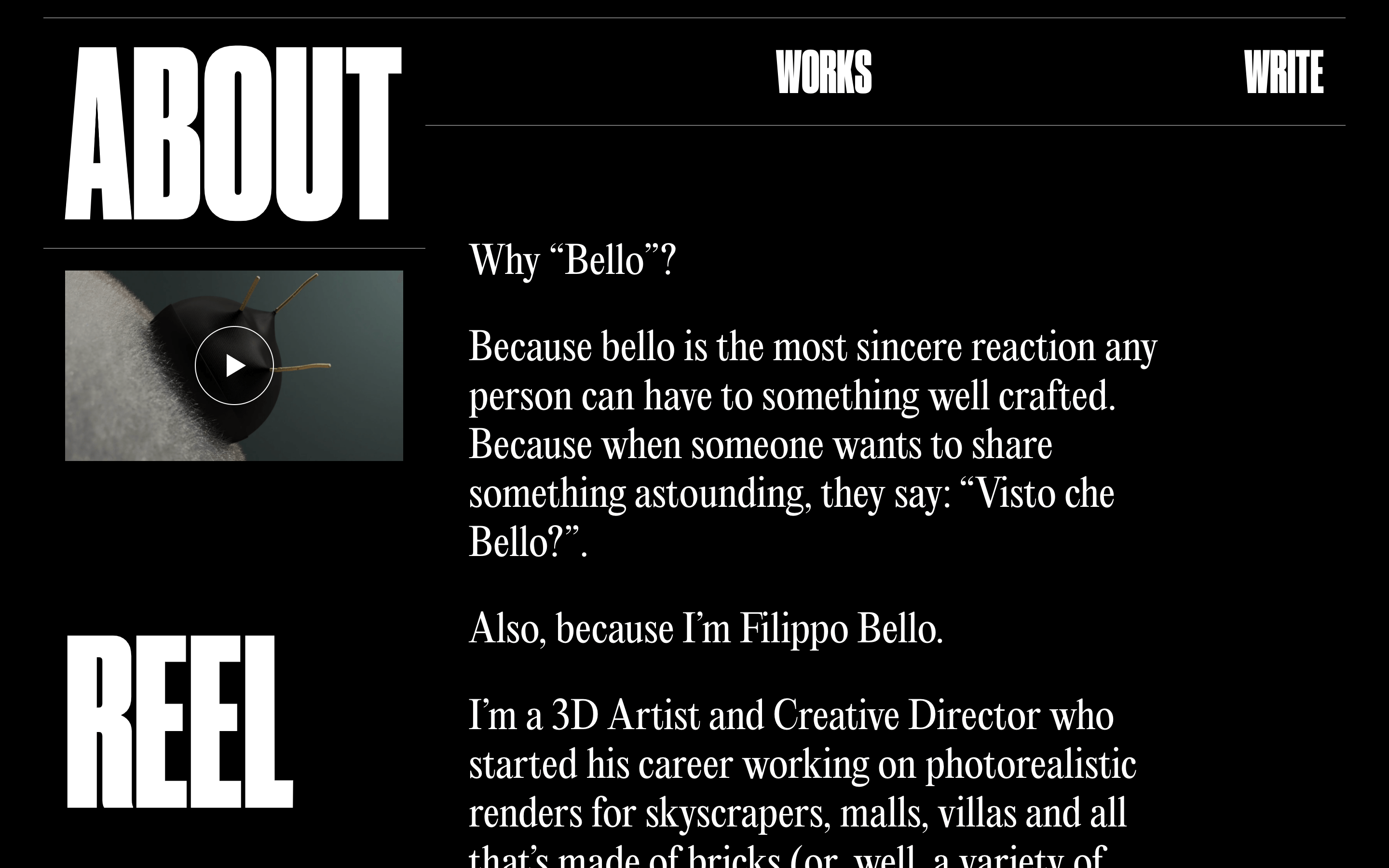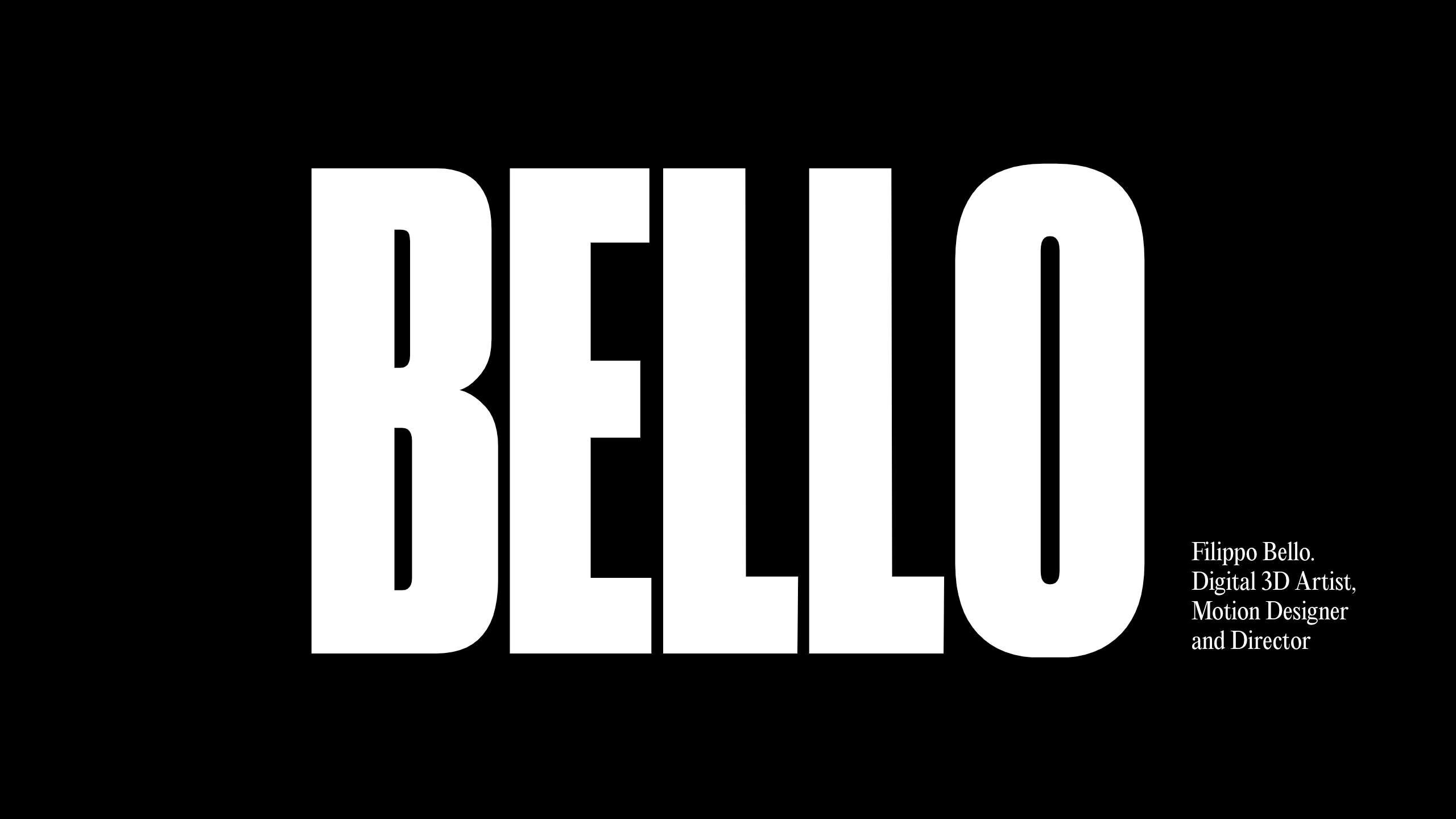 Filippo Bello is a 3D artist, motion designer and director. His projects fully reflects his clean, precise and dynamic work. We followed our instinct by using two fonts that spoke of his personality, bold, decisive, but at the same time elegant and clear.