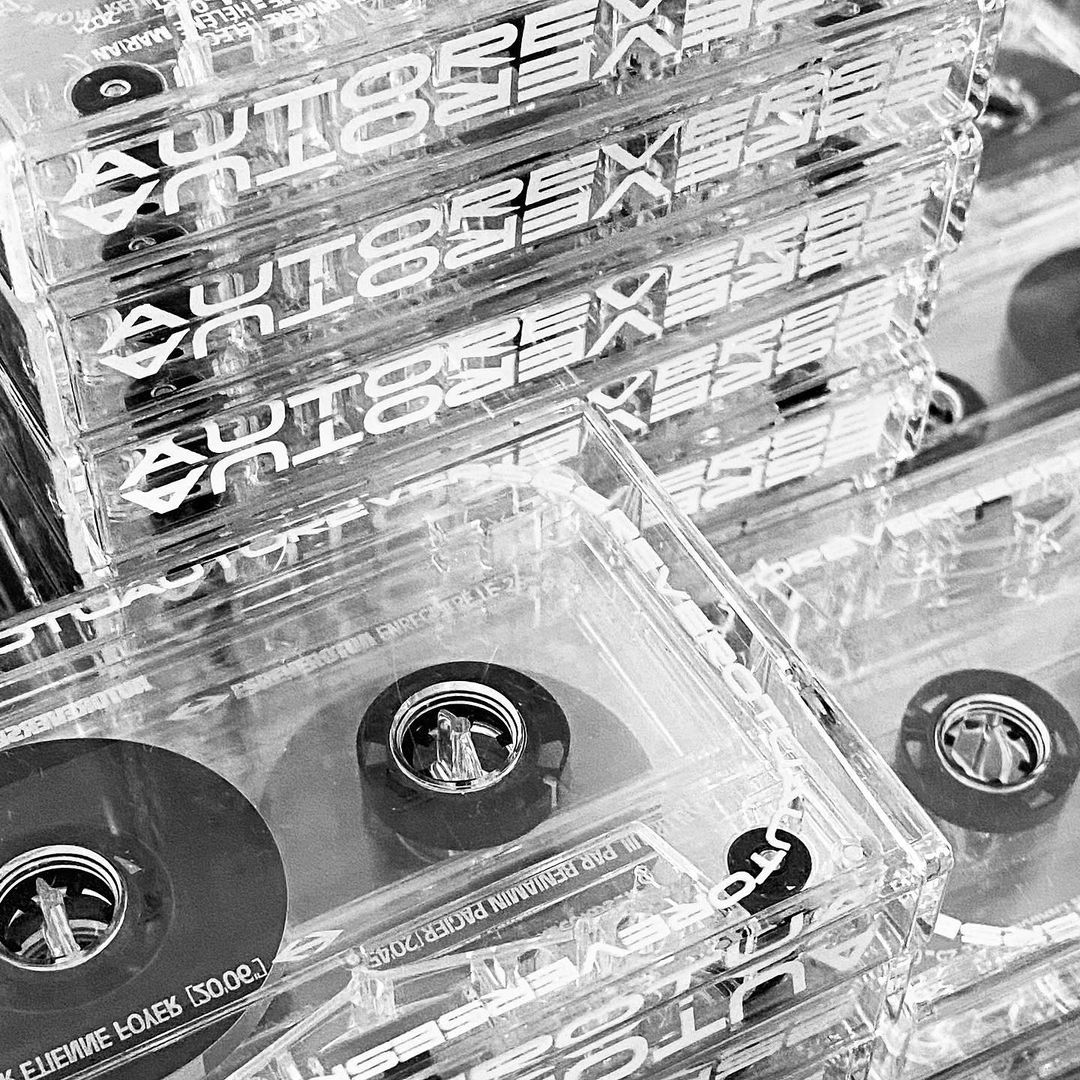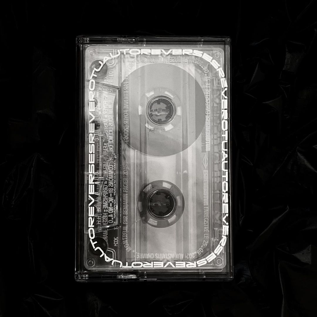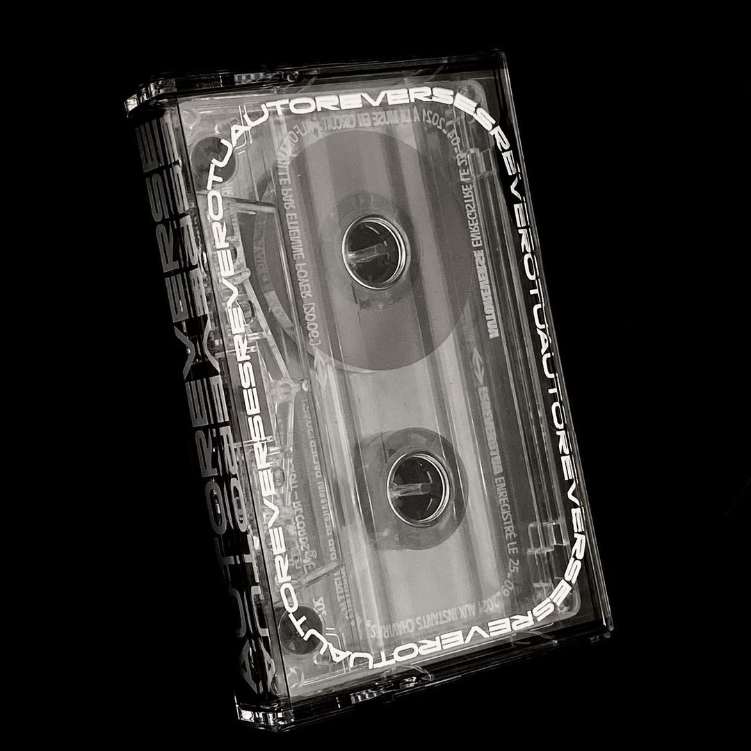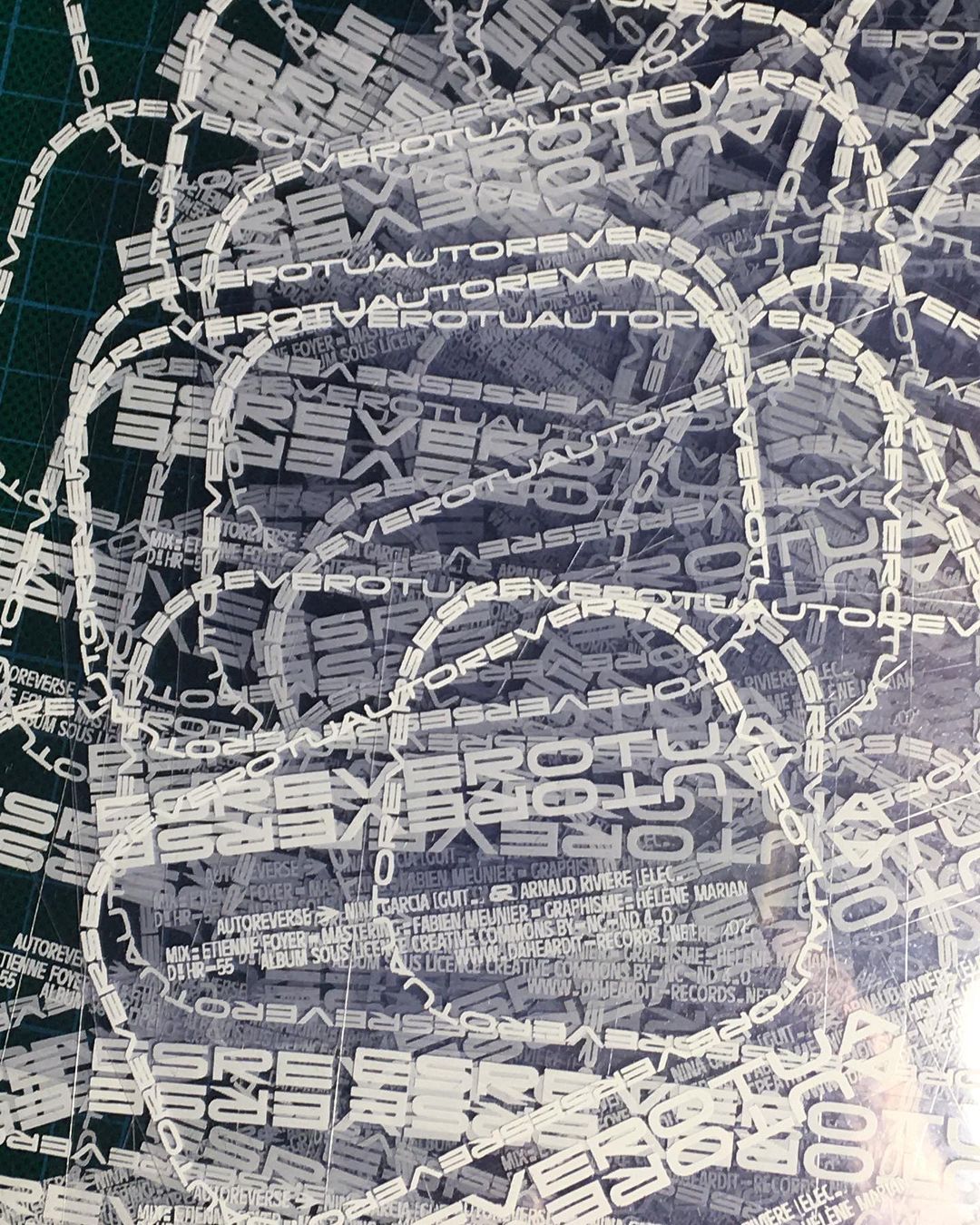 Here’s where Esreverotua becomes interesting on a visual level, too. Hélène Marian took care of the graphic design. Instead of creating the usual J-card, she came up with a solution that is as direct and unconventional as the music itself. The exclusively typographic design is printed right on the plastic case and the cassette itself, in white ink. Paris-based Institut Sérigraphique provided the screen printing. The fonts are Marian’s own: she combined several styles of her heterogeneous PVC series – the superwide Banner, the impactful Promo, and the economic Menu; the latter being her personal take on a typical French brush lettering style. All fonts are used in all caps. They are arranged in rhythmic sequences and loops that feed back into each other, with some words amplified in volume, aptly visualizing the sound of Autoreverse. Marian also made an animation to promote the release which picks up the motif of a winding tape, as well as a matching tour poster. PVC is available from Production Type.