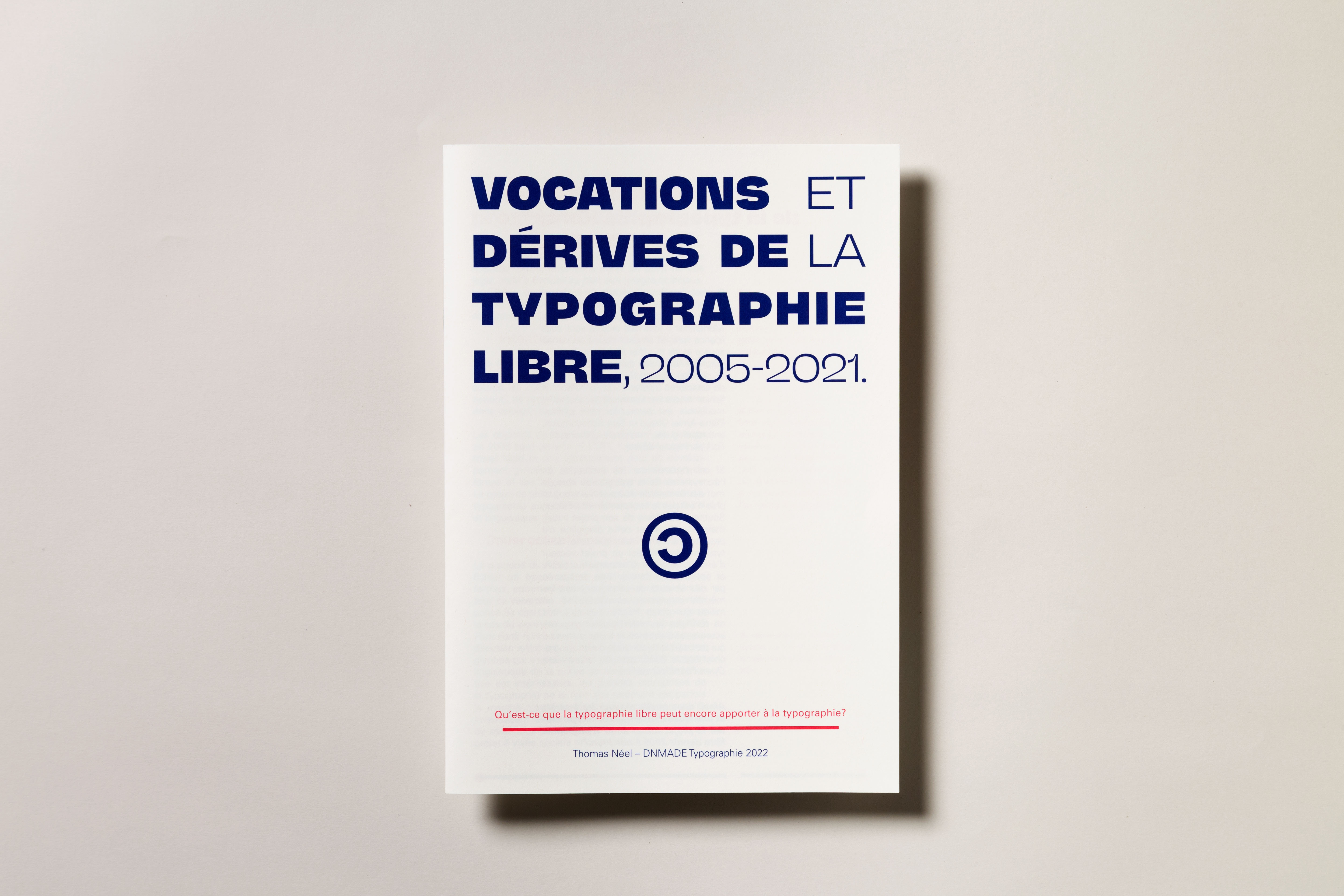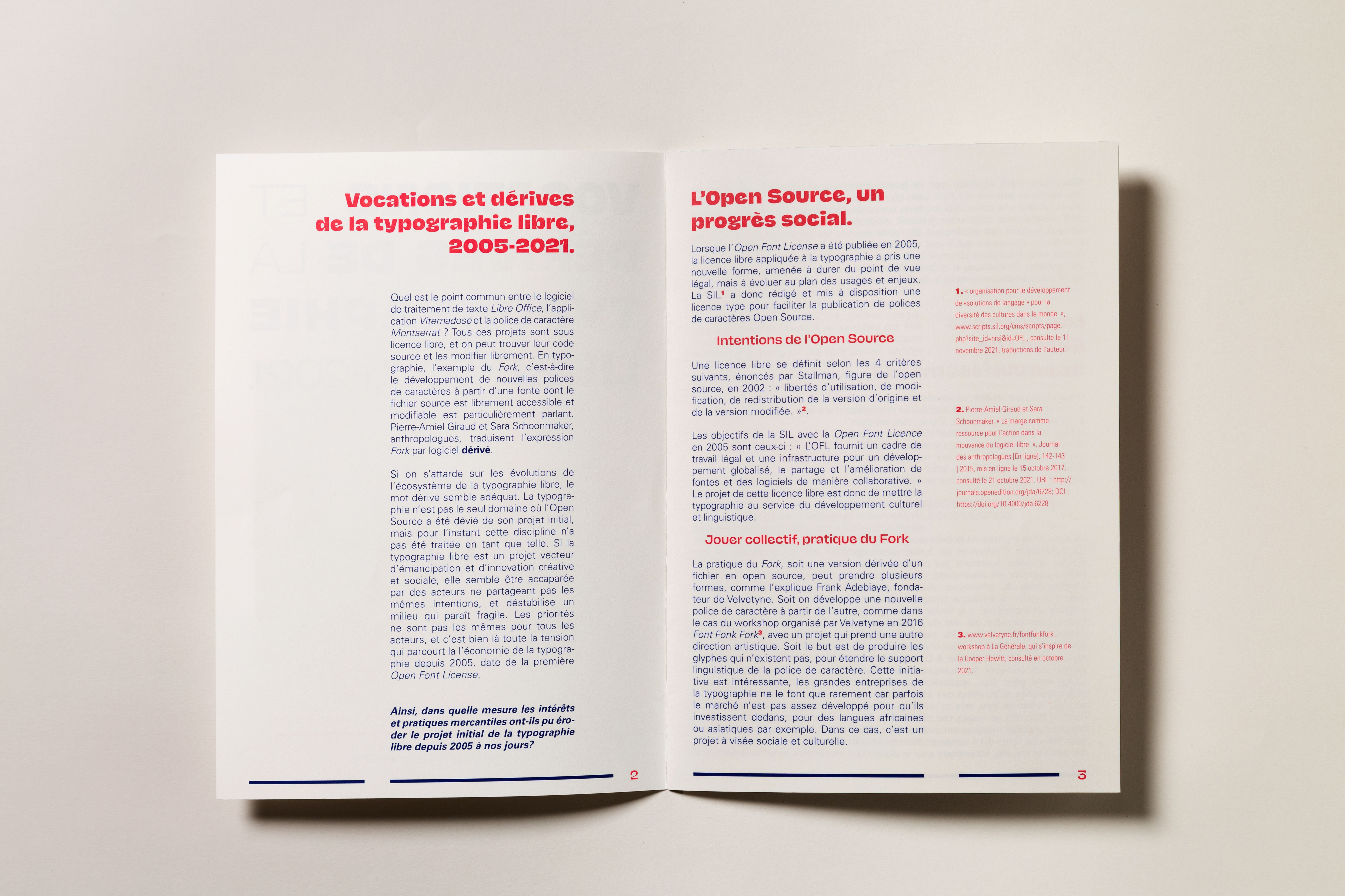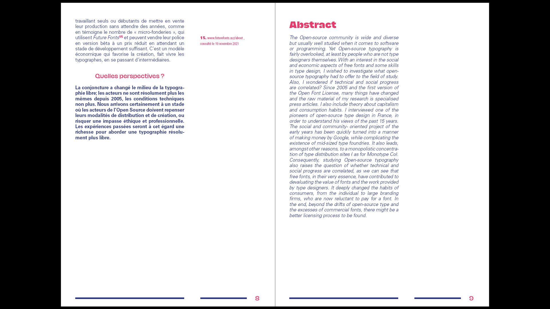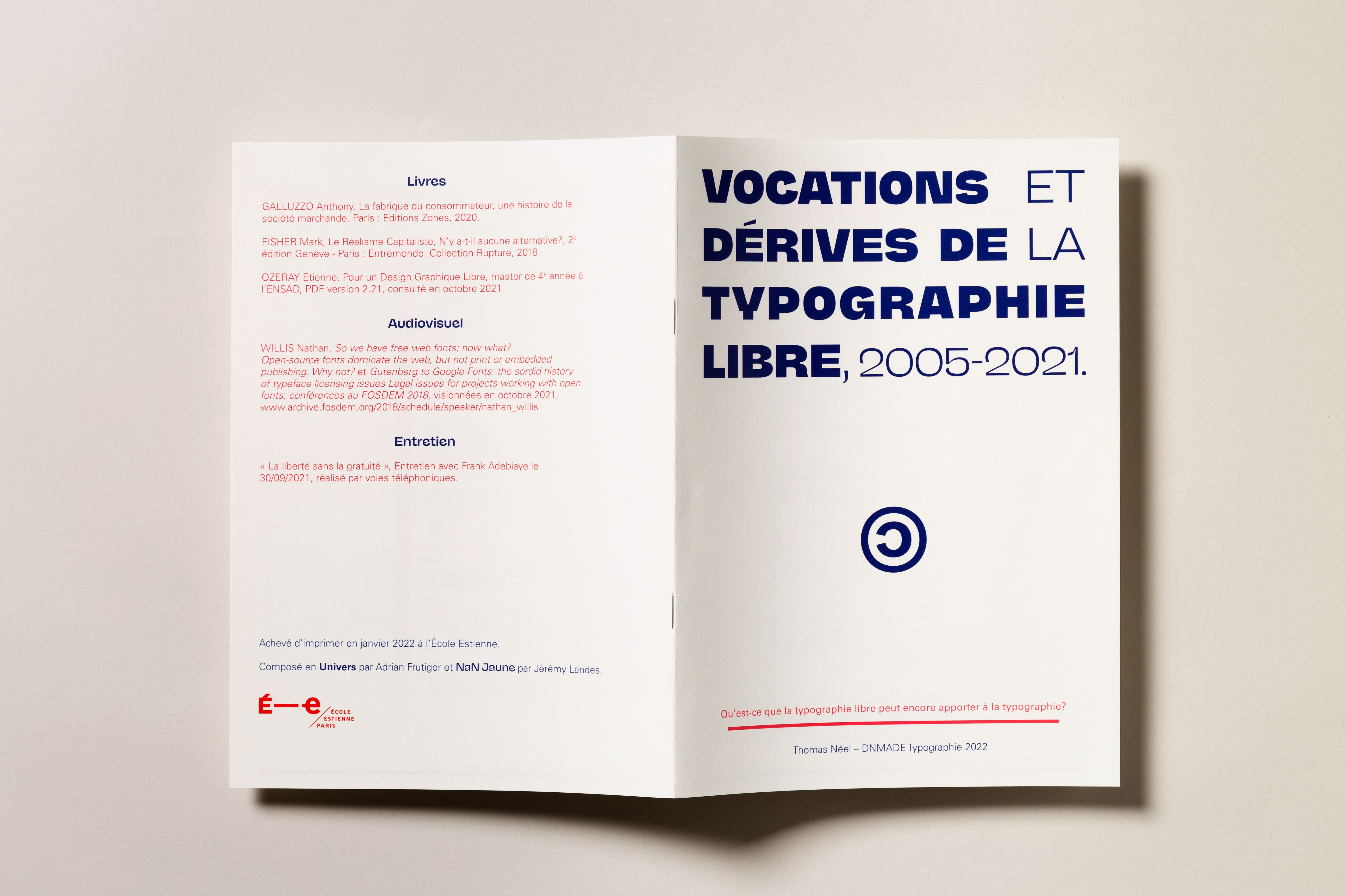 Vocations et dérives de la typographie libre, 2005–2021 is an essay about open source typography from 2005 to 2021, with a focus on what extent it influenced the font distribution process. It was written within the third year of my Bachelor studies in type design at École Estienne, then printed with school’s presses in January 2022.