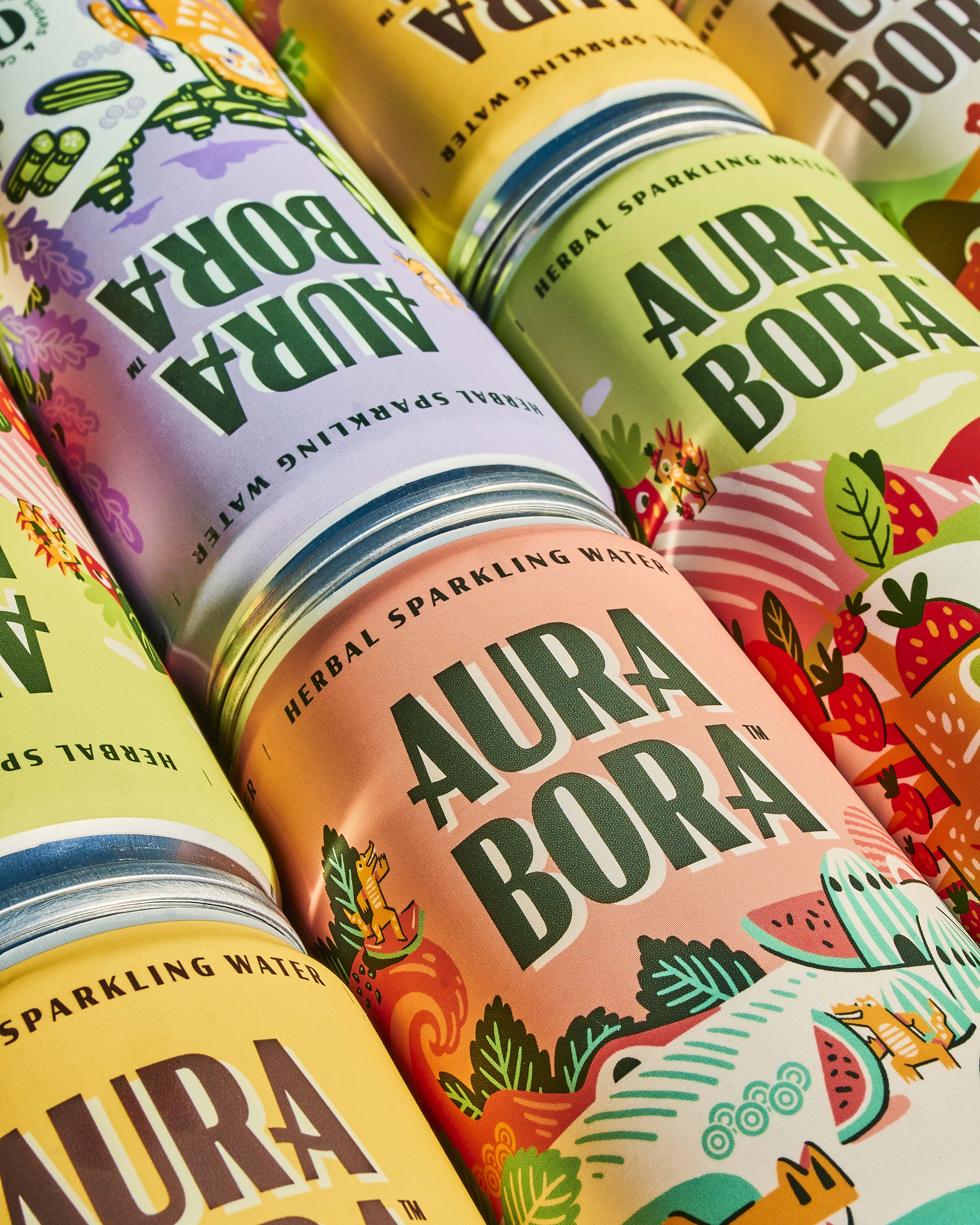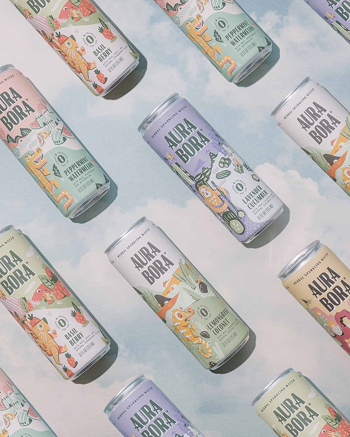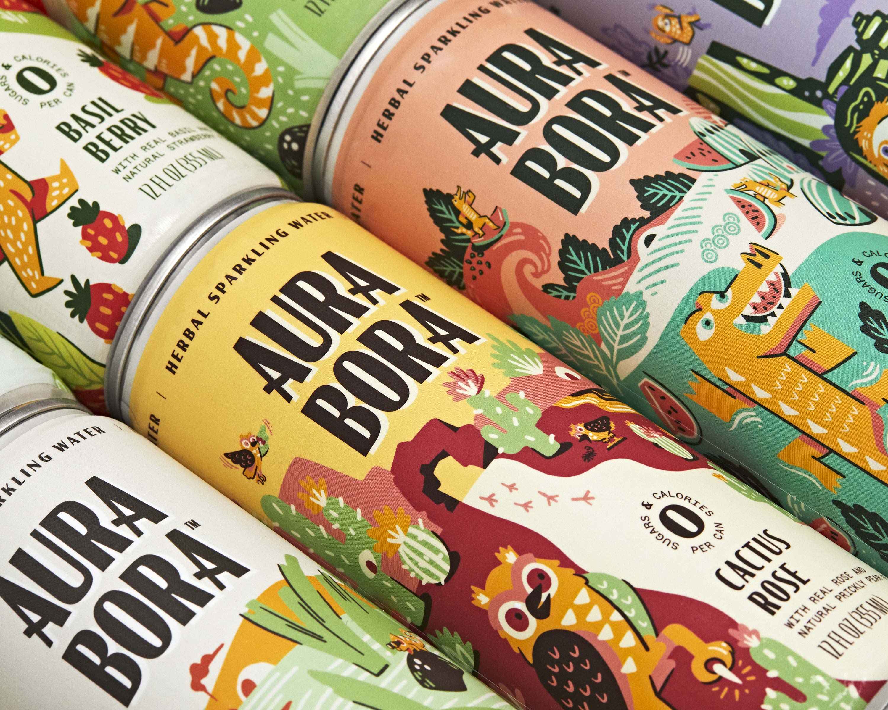 Aura Bora is a producer of uniquely flavored sparkling waters made from herbs, fruits, and flowers. Founded by Paul and Maddie Voge, Aura Bora’s beverages can be found at more than 3,000 retailers across the United States. They worked with branding agency Moxie Sozo to develop their playful brand and the designs of their cans.