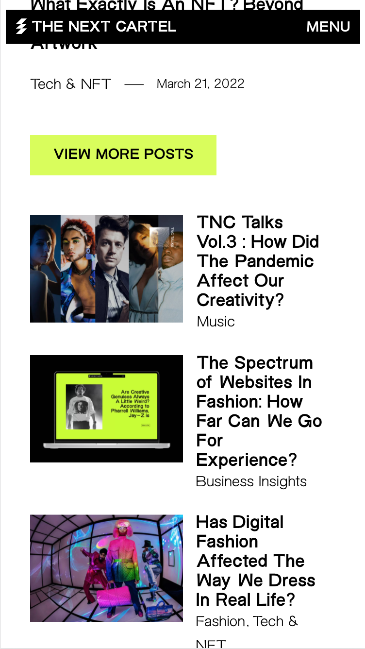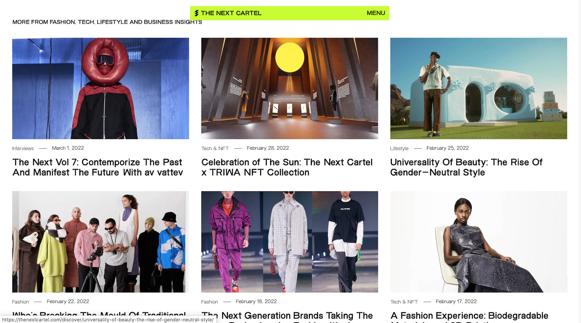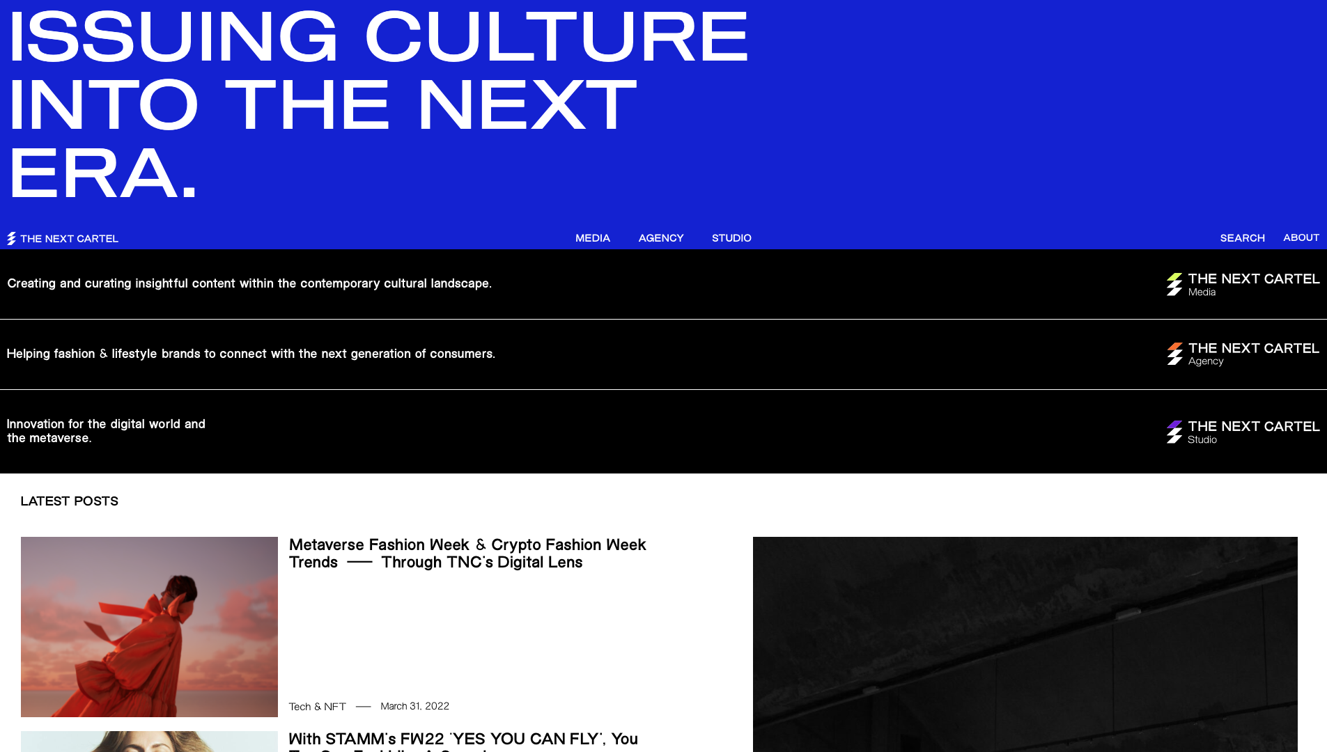 The Next Cartel is a multimedia organization, providing digital media, digital fashion, and agency services worldwide. Their logo and website are both set in Bastardo Grotesk, giving a sense of continuity and cohesion. The website follows the logo’s different colour versions, which are interchangeable and often even used at the same time. Sequel 100 Wideis used for the hero headlines on the website.