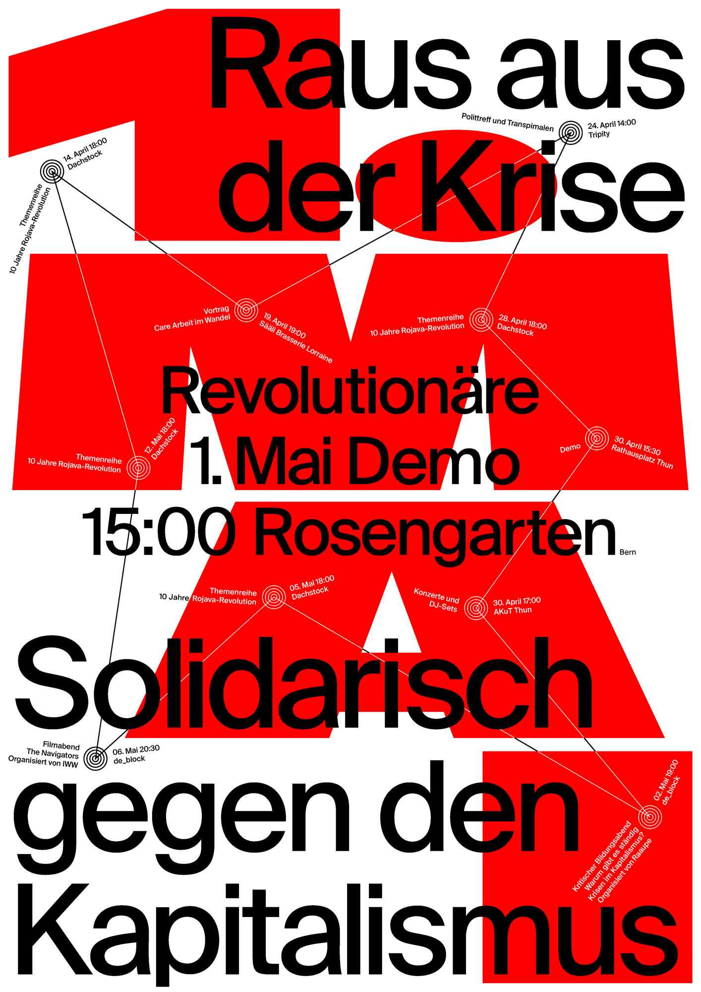 Poster for the revolutionary May Day demonstration that will that place on May 1, 2022 – the International Workers’ Day – in Bern, Switzerland. While “1. Mai” is set in extralarge red caps from ABC Ginto Nord, the slogans “Raus aus der Krise (“Get out of the crisis”) and “Solidarisch gegen den Kapitalismus” (“In solidarity against capitalism”) and all smaller text uses Suisse Int’l.