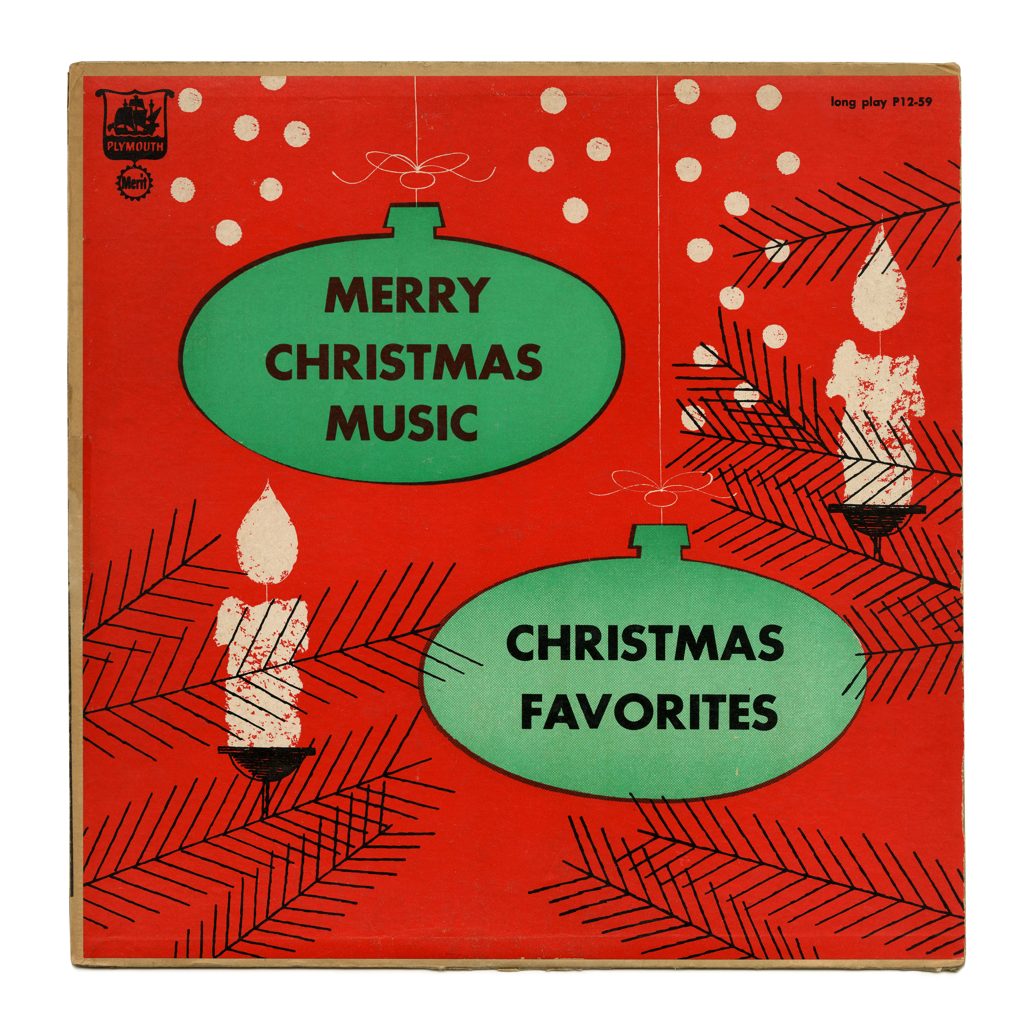 Little is known about this album with Christmas favorites; neither the artist nor the year it was released. The mid-century illustration is uncredited, too. What we do know is that it came out on Plymouth Records as P12–59, and that the typeface used for the text inside the baubles is all-caps Futura Bold.
