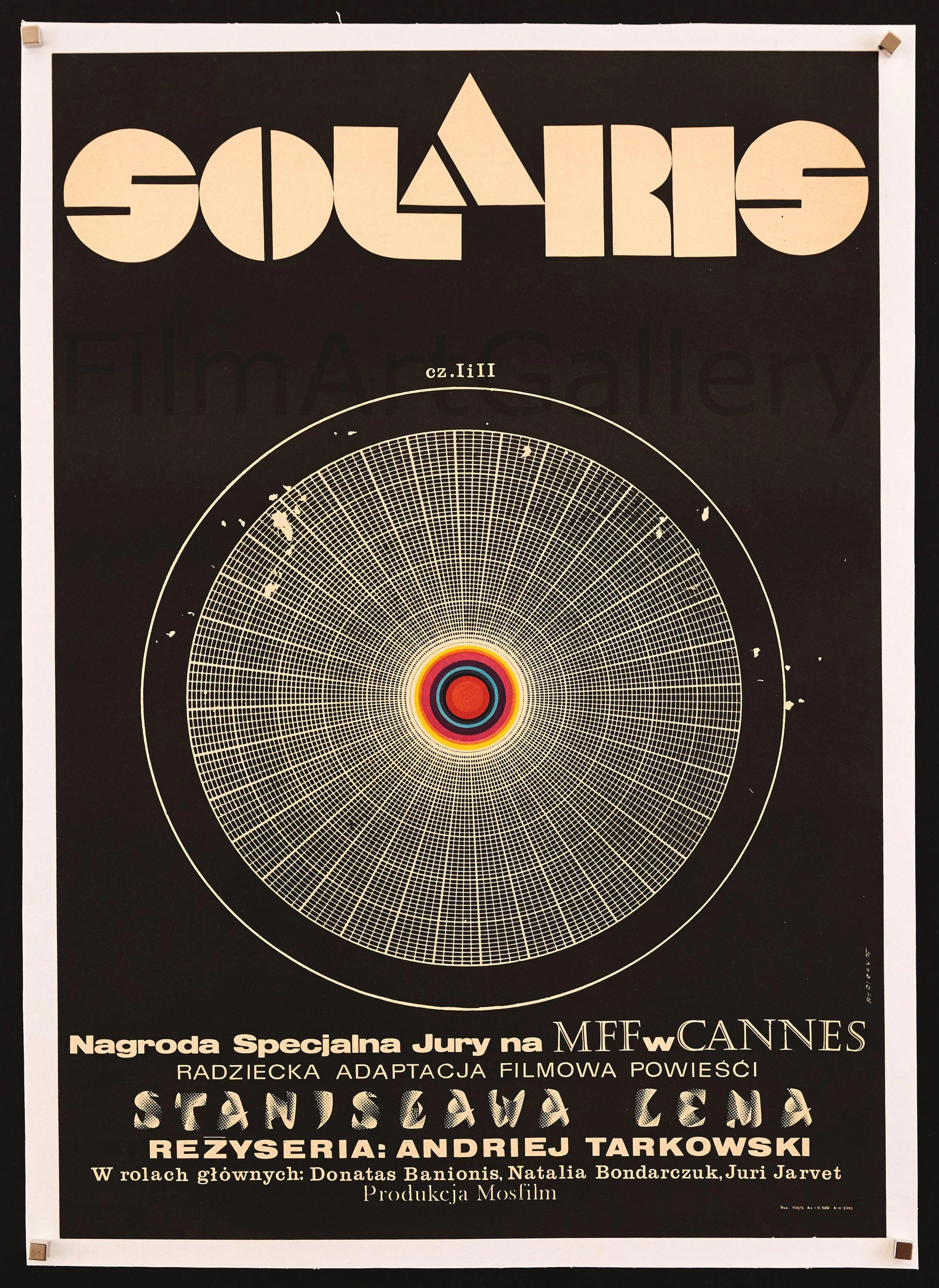 Polish movie poster for Soviet sci-fi art film Solaris (1972), designed by Andrzej Bertrandt. The film title “Solaris” is set in Disco (with a custom A). “Stanisław Lem”, the author of the 1961 novel from which the film is based, is set in Calypso. The director’s name, “Andrei Tarkovsky”, is set in Helvetica Black Extended. Castellar is used for “MFF” and “Cannes”. Additional fonts include Univers 53 Extended, Clarendon Medium, and Baskerville Old Face Regular.