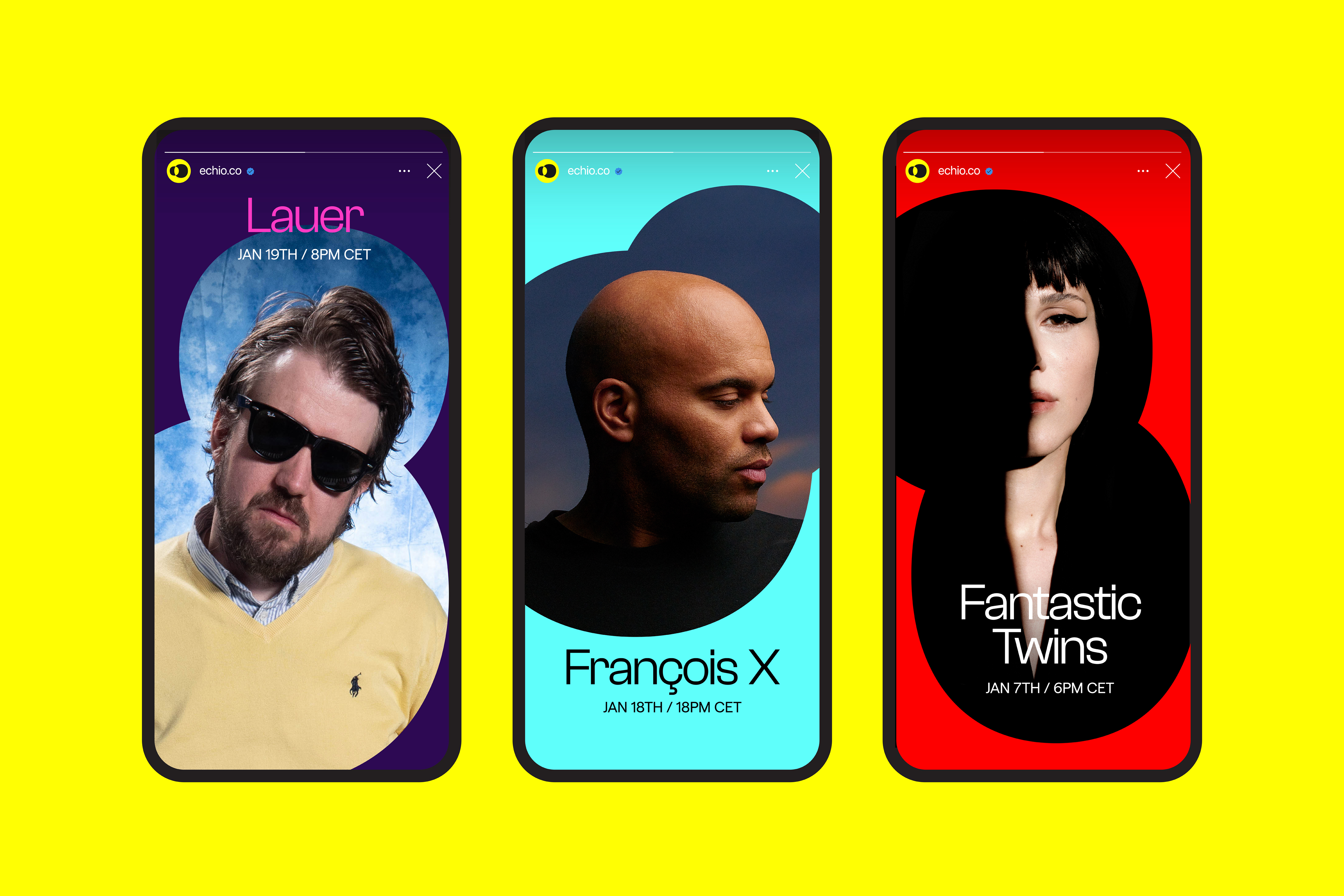 Echio’s visual identity was developed at Decimal Studios (decimal_studios) is inspired by the connection and the exchange between artists and fans. It also communicates how knowledge is propagated through the platform, mirroring how echo is propagating sound. We wanted the design to be fun, dynamic and bold.