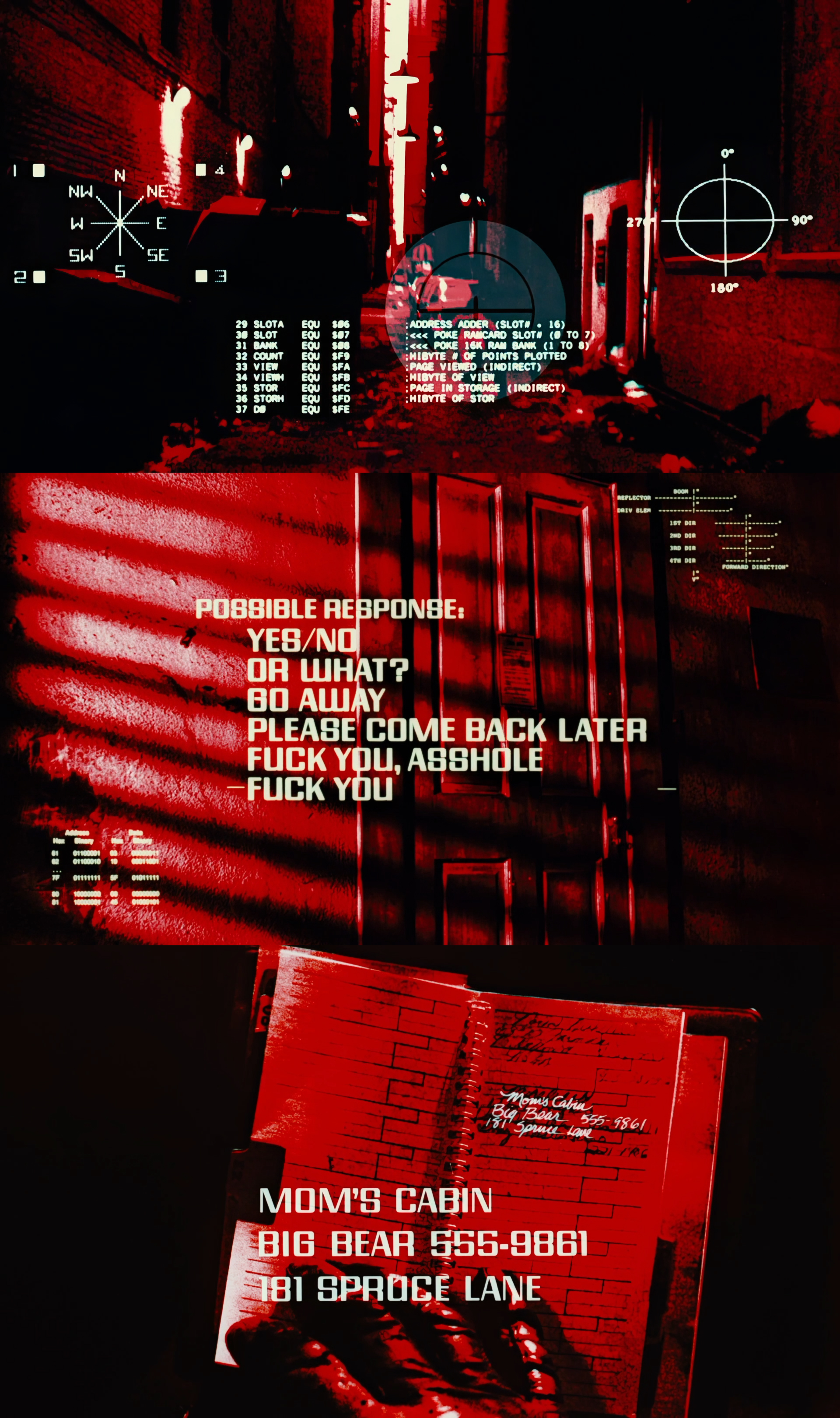 As mentioned here and previosuly elsewhere, most of the code and other technical readouts featured in the Termovision sequences can be found in Nibble Magazine. It’s possible parts of these elements may be using bitmap fonts, potentially from an Apple II or IBM PC system. The following portions are from Vol. 5, Issue 9, September, 1984: