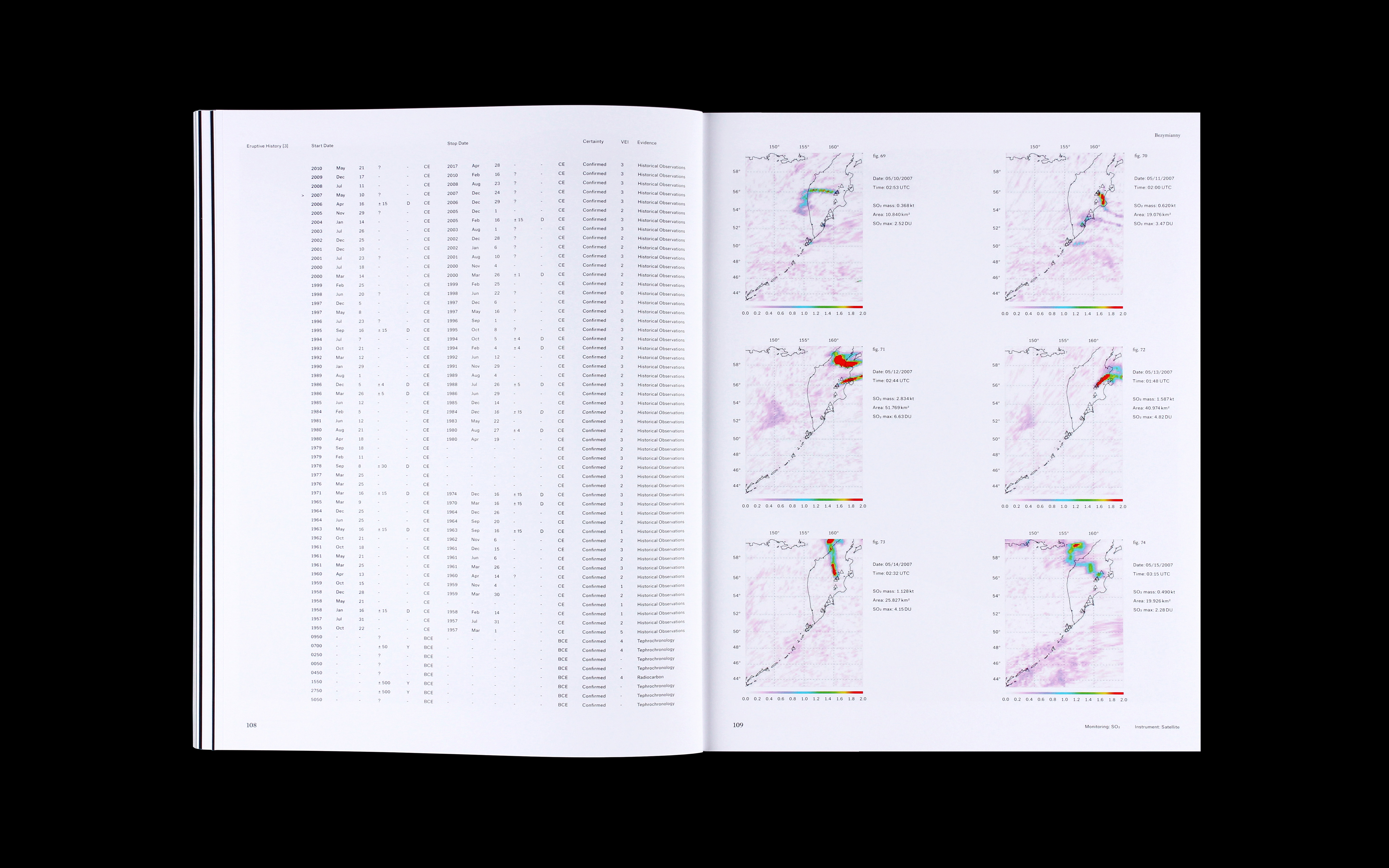 As a conceptual disruption and visual reference to contour lines, spreads with white ink on black paper – an alphabetical list of all active volcanoes at this time – break the layout on a regular basis.