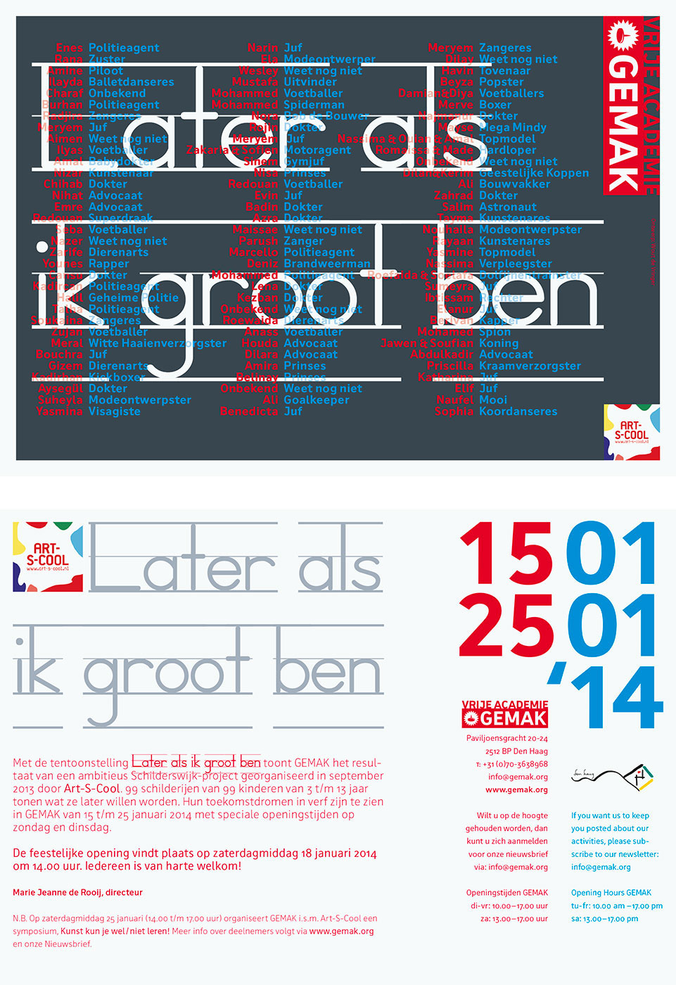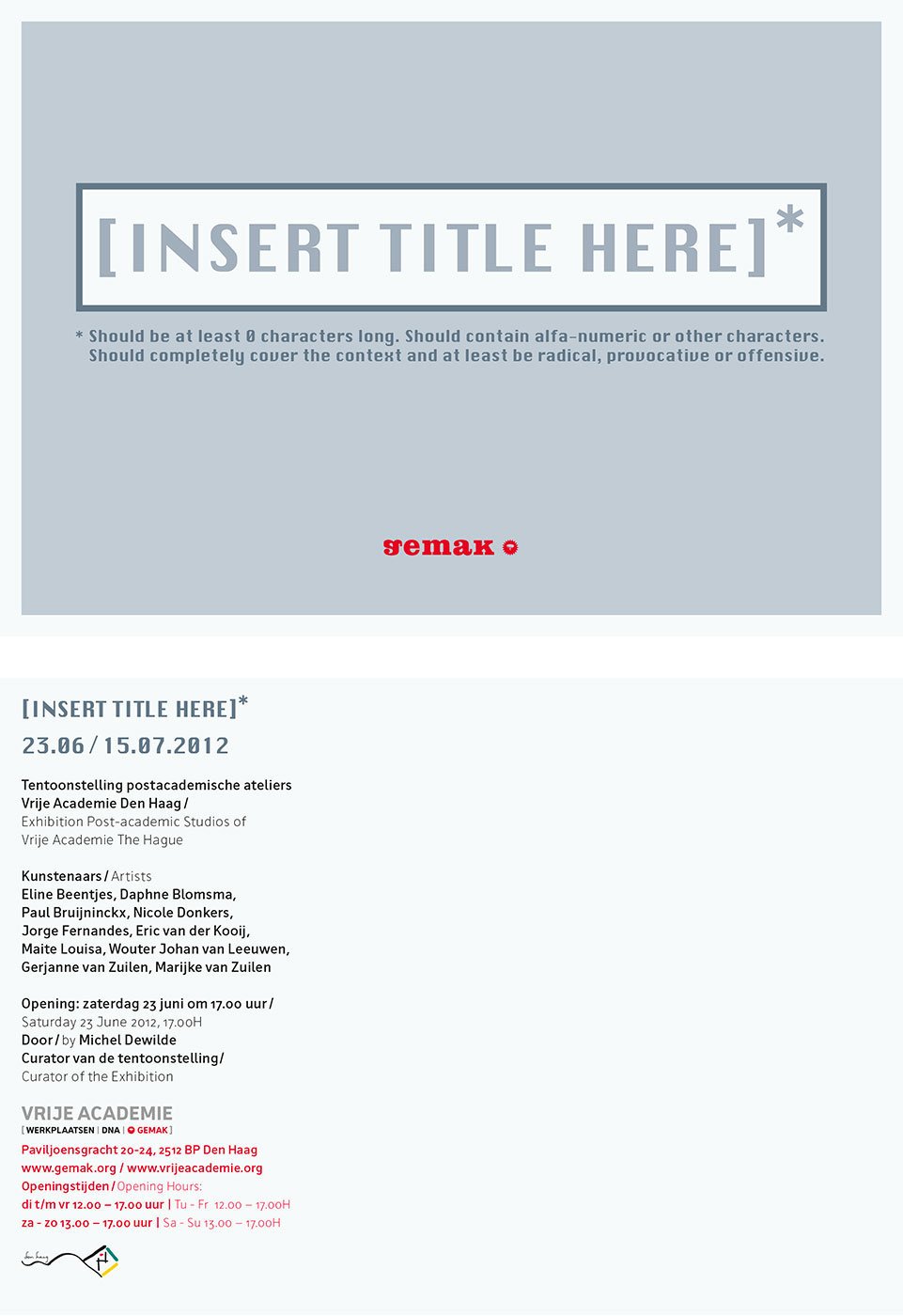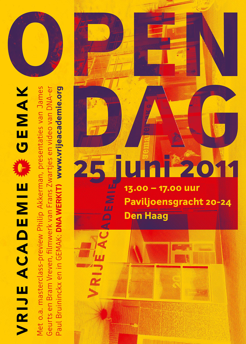 It was GEMAK’s ambition to present contemporary and controversial themes in art, politics and society; inquisitive, curious, evaluative and challenging and to challenge audiences to experience art as a starting point for artistically ground breaking discussions, lectures and debates. On 4 December 2015 GEMAK had to close its doors. In doing so, the Vrije Academie Foundation also ceased to exist.