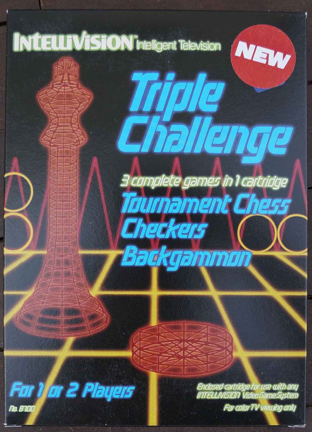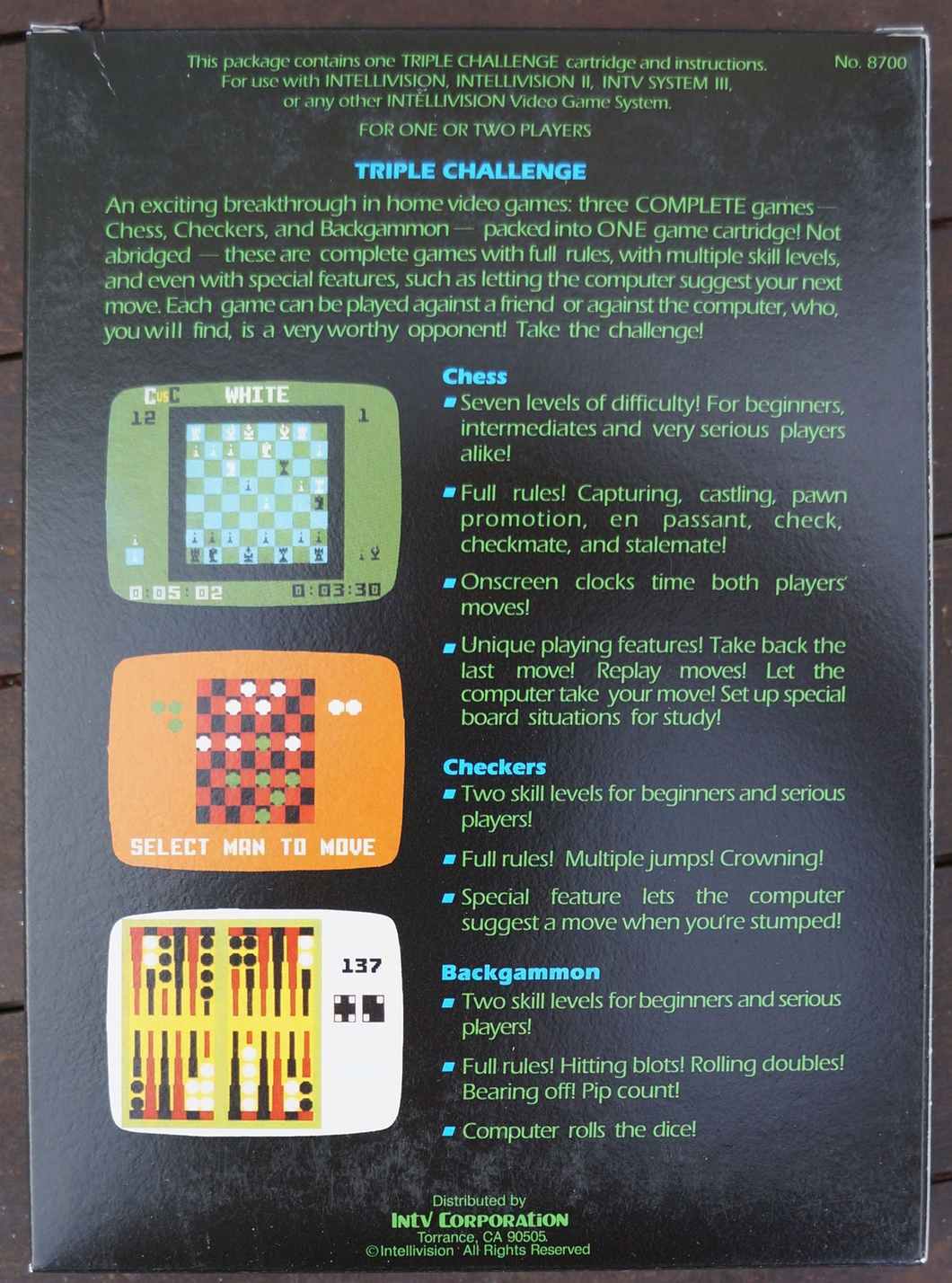 The front cover of Triple Challenge, an Intellivision game released in 1986 that comes with three games: Tournament Chess, Backgammon, and Checkers. The typeface used here is Broken English, which had been released by Chartpak the same year. Designed by Steven Fabian, it came in three weights.