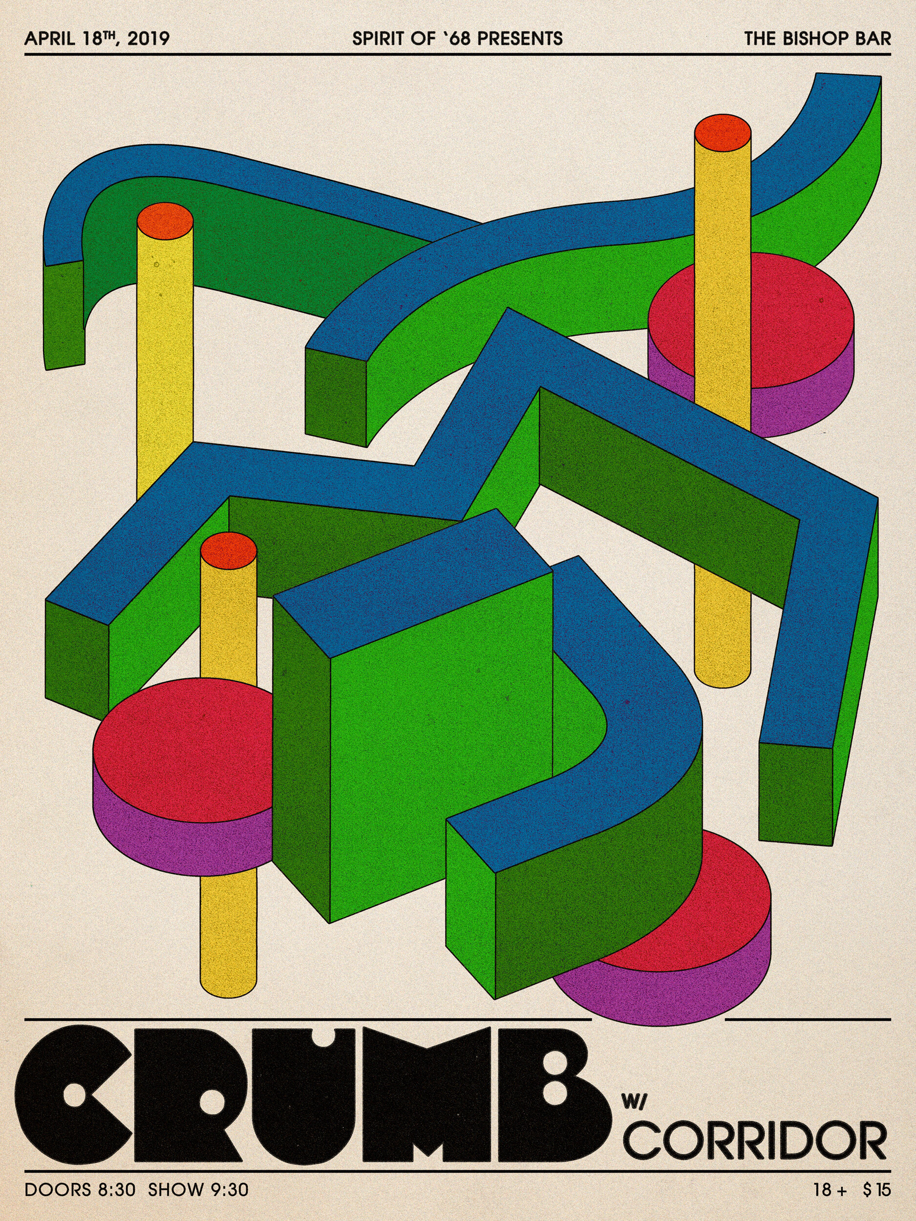 Crumb at The Bishop Bar concert poster Contributed by Bryson Stohr on Apr 21st, 2022. Artwork published in 2019. Source: aaronlowelldenton.com Aaron Lowell Denton. License: All Rights Reserved. Poster for the gig of psychedelic rock band Crumb at The Bishop Bar in Bloomington, Indiana in April 2019, supported by Corridor. “Crumb” is set in Shotgun, with the rest of the text in all-caps ITC Avant Garde Gothic. Typefaces More about ShotgunGet ShotgunMore about ITC Avant Garde GothicGet ITC Avant Garde Gothic Formats Posters/Flyers (5637) Topics Event (3137) Music (6206) Designers/Agencies Aaron Lowell Denton (8) Tagged withconcert & gig posters (504)Crumb (band) (1)Corridor (band) (1)The Bishop Bar (1)all caps (7390)borders and rules (1084) Artwork location United States (9754) Bloomington (11) Indiana (26) In SetsColossal Combinations (Jay Mellor) (2126)CHUNKY (Annika Phillips) (16)posterx (Leonardo de la Fuente) (42)Funky (Serena Ho) (34)Colors (Lucas Bevilaqua) (808)Abstract (Lucas Bevilaqua) (255)Music (Lucas Bevilaqua) (291)Posters (Lucas Bevilaqua) (377)Combination (Luana Fonts InUse) (4)Poster (Luana Fonts InUse) (48)Poster (Juan Ortega) (123)slouch (Adnan Shihabi) (14) Post a comment Name Email – will not be published Website Your response Submit Comment More Shotgun in use Four Los Angeles Artists exhibition poster1975Cris GianakosContributed by Herb Lubalin Study Center Staff Pick Odd Jobs: The World of Deviant Work by Gale Miller1978unknownContributed by Florian Hardwig Staff Pick Blatter joinery, BrienzunknownContributed by Chris Corrado Sponsor More in Music La Montgolfière2018Brand BrothersContributed by Brand Brothers Abbey Road Masters2019PolytechnicContributed by Stephen Coles Staff Pick King Sonic Cassette Tape 60 insertc. 1975unknownContributed by Florian Hardwig Royce Da 5′9″ – Build & Destroy cover art2003Trouble RecordsContributed by Nikolai More in Posters/Flyers Hedera Helix at SULK Chicago exhibition flyer2023Virginia WatersContributed by VW Admin El Morito y su Grupo at Restaurant Bar Los Cardenales concert flyerPhoto(s) by Make It Old on Flickr. Lollapalooza Berlin 20152014unknownContributed by Florian Hardwig Staff Pick Passport Power Rank2019êkhô studioContributed by êkhô studio More Fonts In Use Yr Skull a Cathedral / Psychic Arpeggiator by Param Anand Singh2018Param Anand SinghContributed by Param Anand Singh Staff Pick Les Ateliers Vortex2024Atelier Tout va bienContributed by Électro Bibliothèque Staff Pick Press Press Campionario, issue 01: “Brush Folder 2014–2019”2020Michele GalluzzoContributed by Michele Galluzzo Staff Pick Tolstói & Tolstaia2022Vitor CarvalhoContributed by Vitor Carvalho Staff Pick
