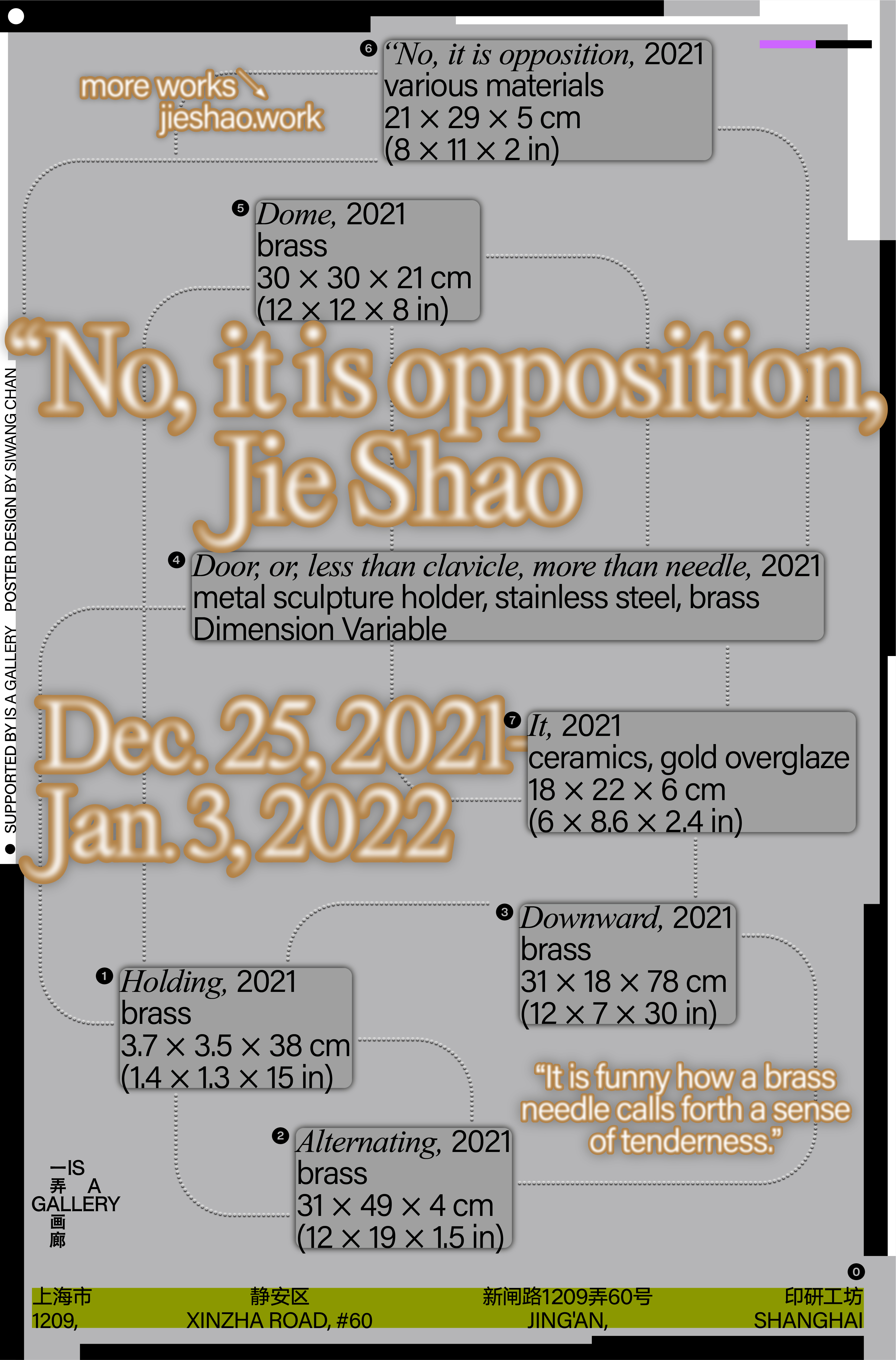 Jie Shao (____jieshao) works in brass, stainless steel, gold, and ceramic for No, it is opposition. This pop-up exhibition, part of the Is A Show series, was presented through January 3, 2022 at Is A Gallery, Shanghai.