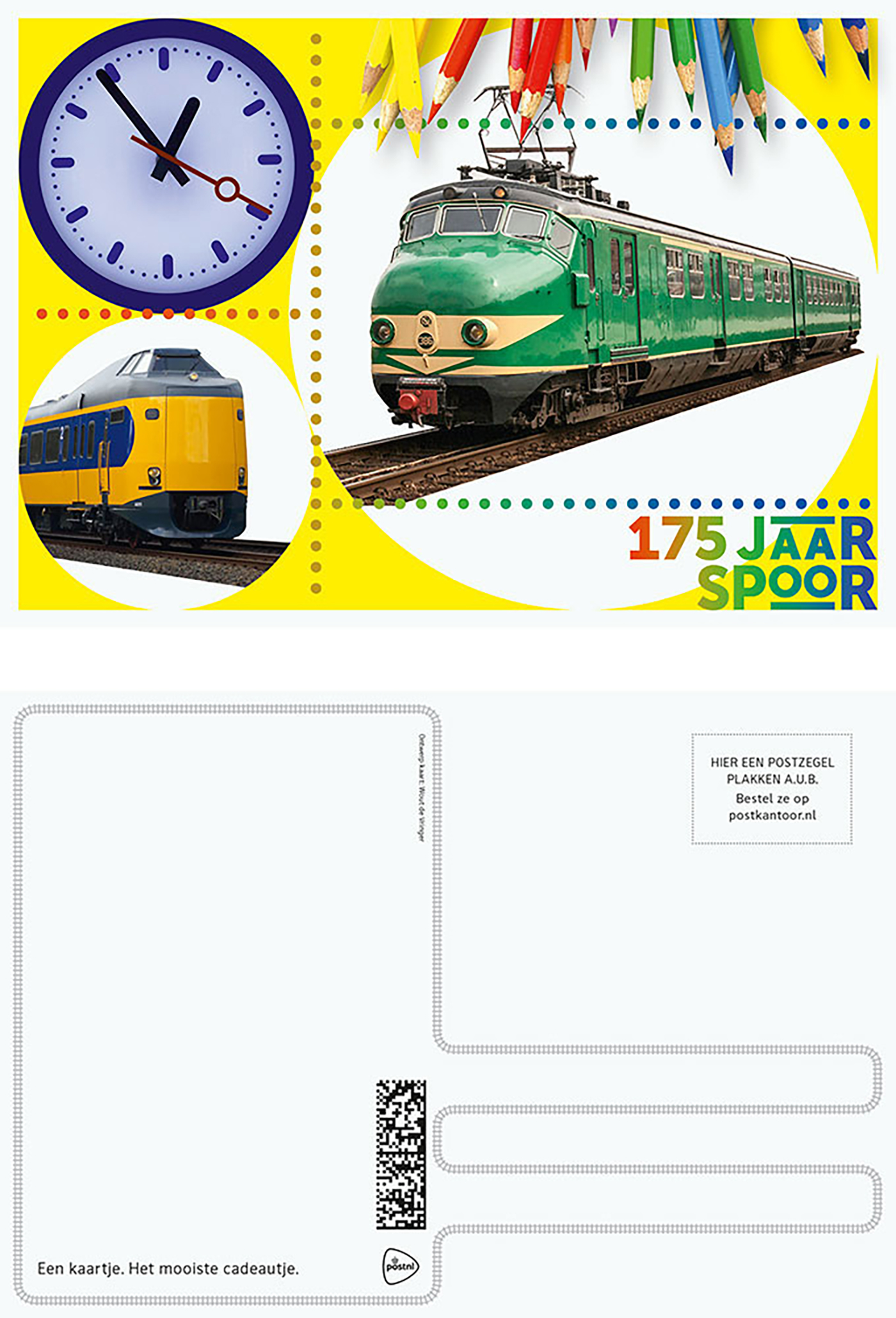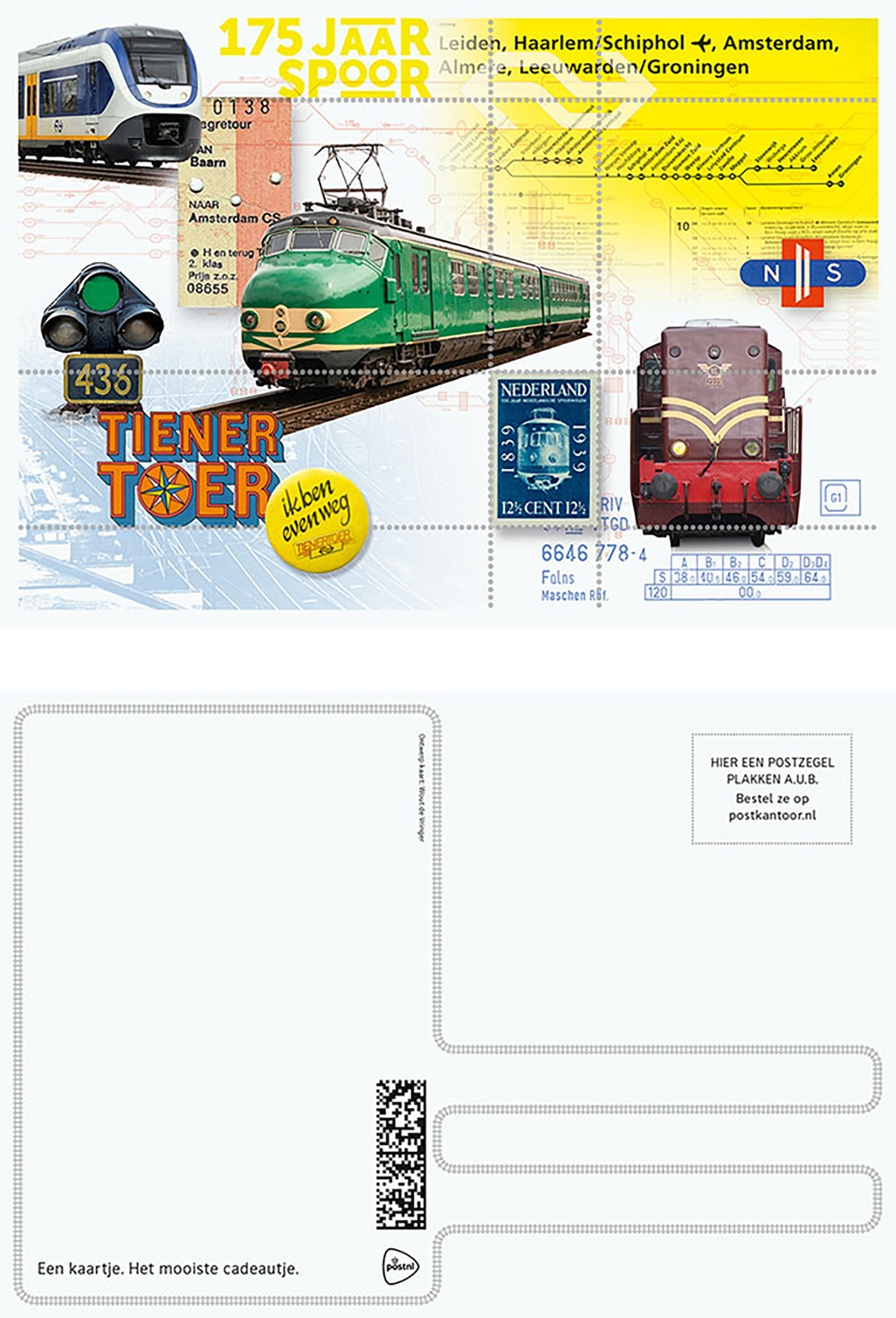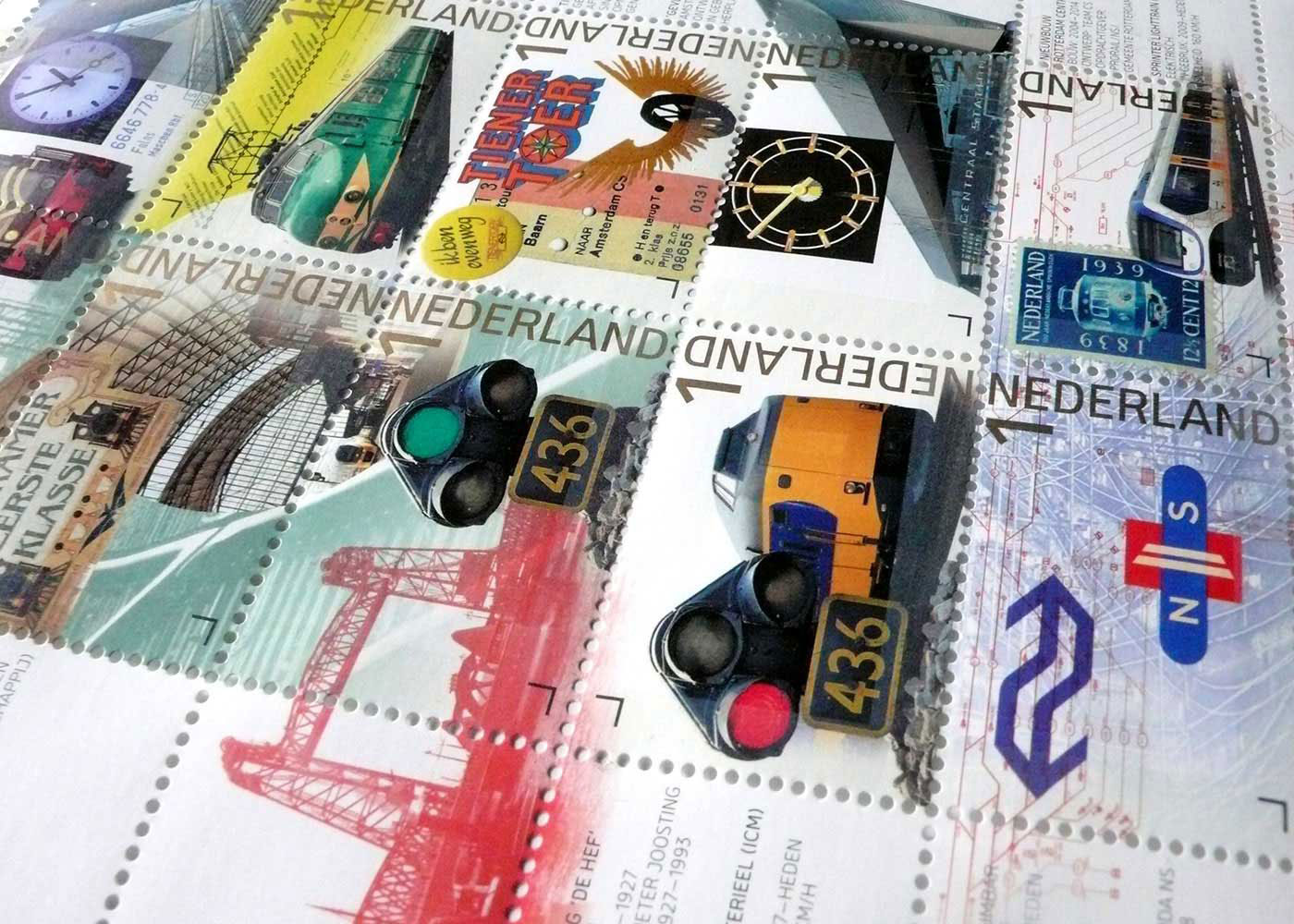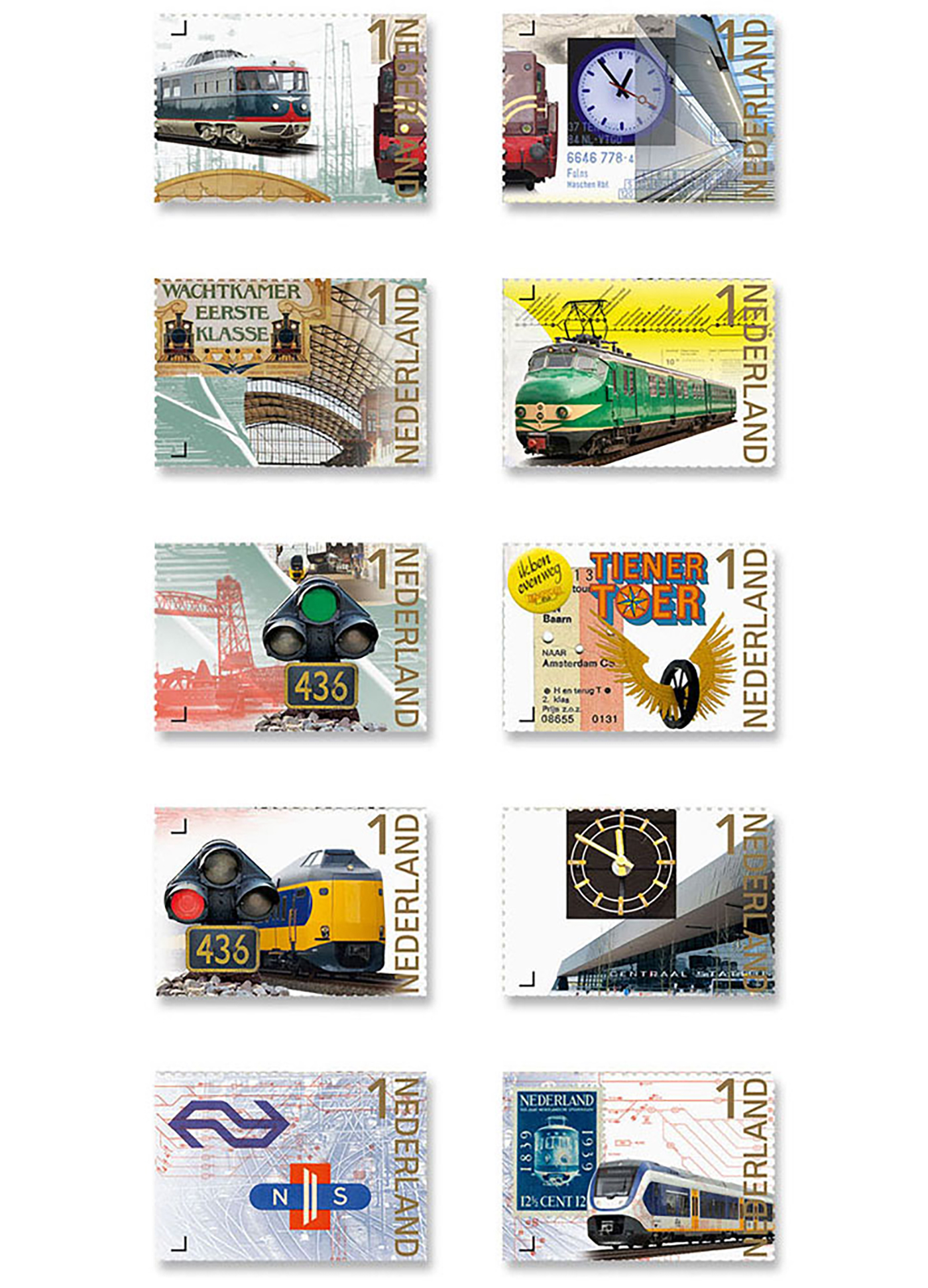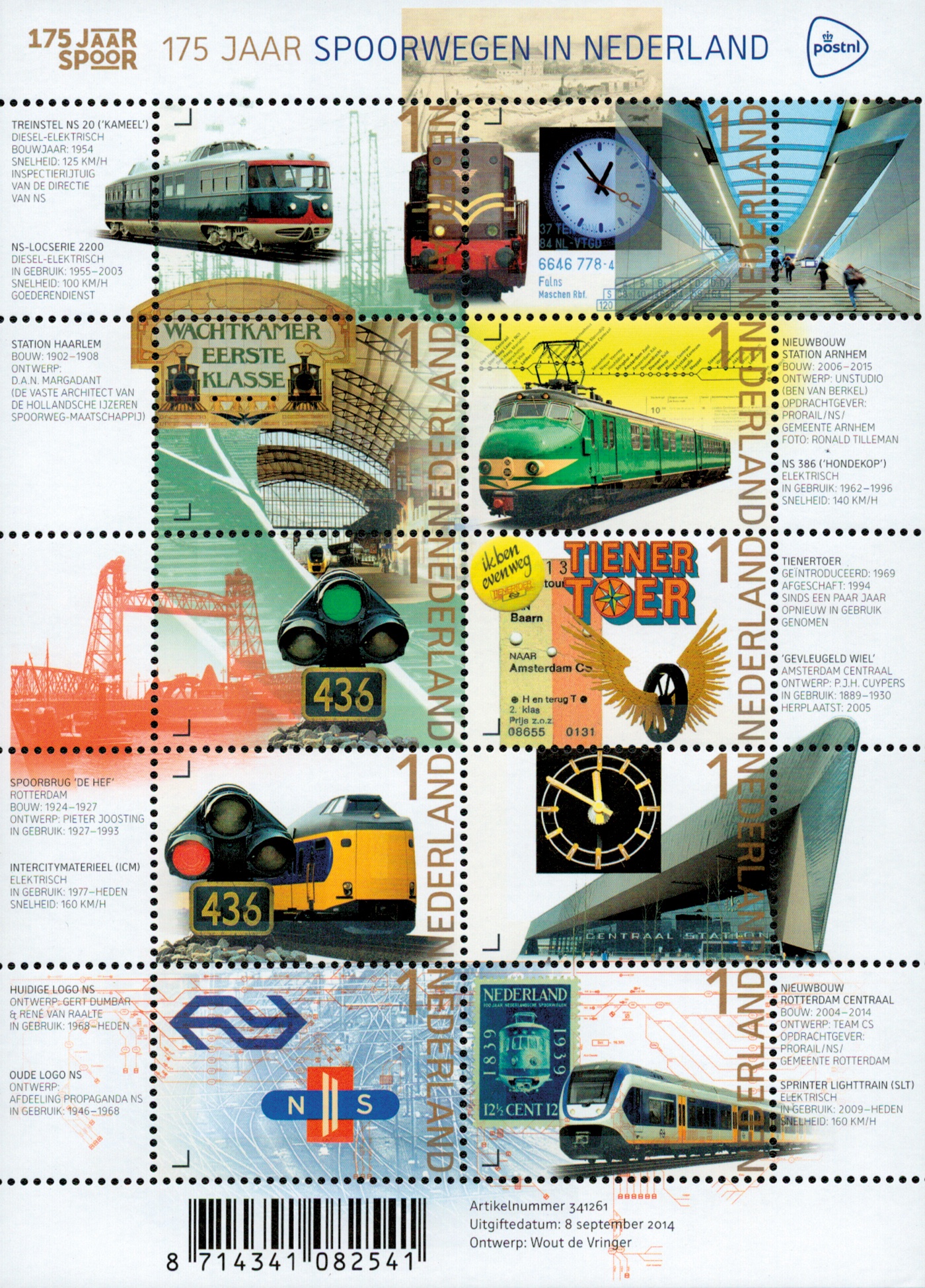 In September 2014 PostNL published ten unique stamps to commemorate 175 years of railways in the Netherlands. According to Simone Bel, Corporate Communications director at PostNL, it is an important accomplishment that PostNL has now immortalised the train and the railway as iconic elements in Dutch society. “I am convinced that these stamps will evoke warm and happy memories of railways for many people.” The stamps portray the rich history of railways in the Netherlands. The ‘175 years of Dutch railways’ stamps comprise a collage of images including trains, locomotives, old and new NS logos, station clocks and old and new railway stations. Each individual stamp is a collage of several images. History, future and dynamic development are key. The stamps were chosen as the most beautiful Dutch stamps of 2014.