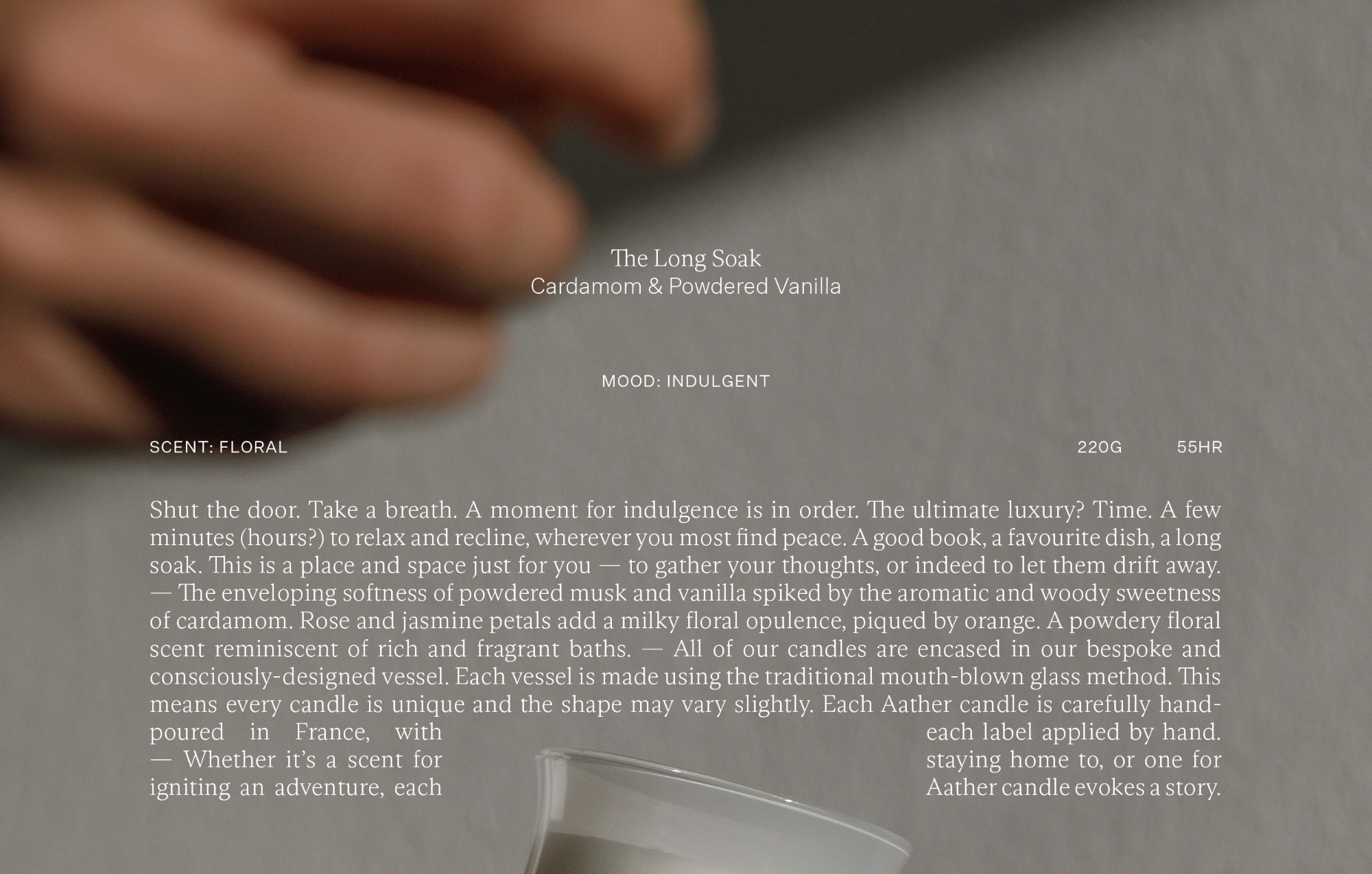 Aather is a manufacturer of scented candles. Aather’s brand world is steeped in the heritage of twentieth-century design. From the mid-century influences that informed the distinctive silhouette of their hand-blown glassware, to a system of brand shapes that borrows from the uncompromising geometry of brutalist architecture.
