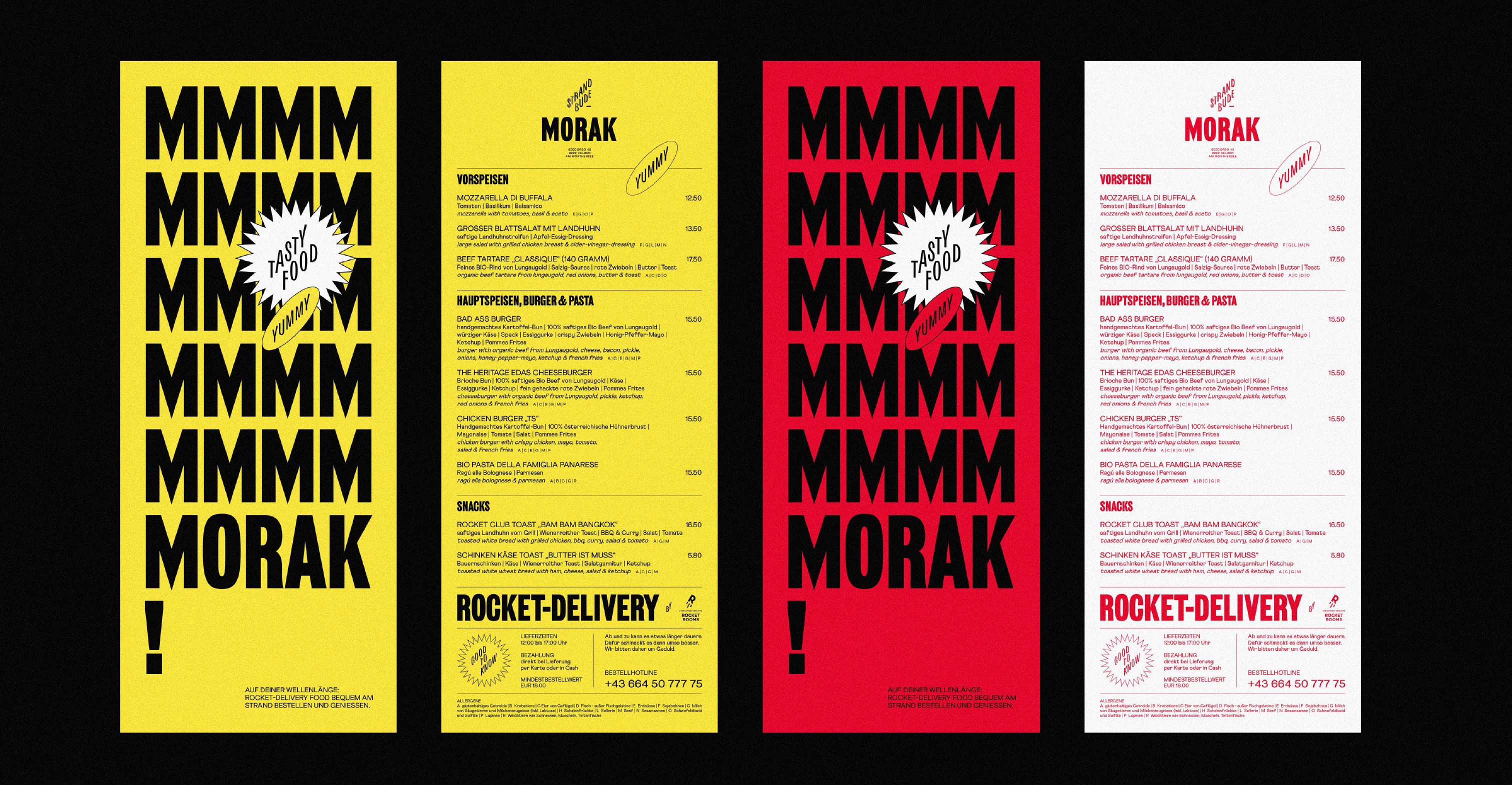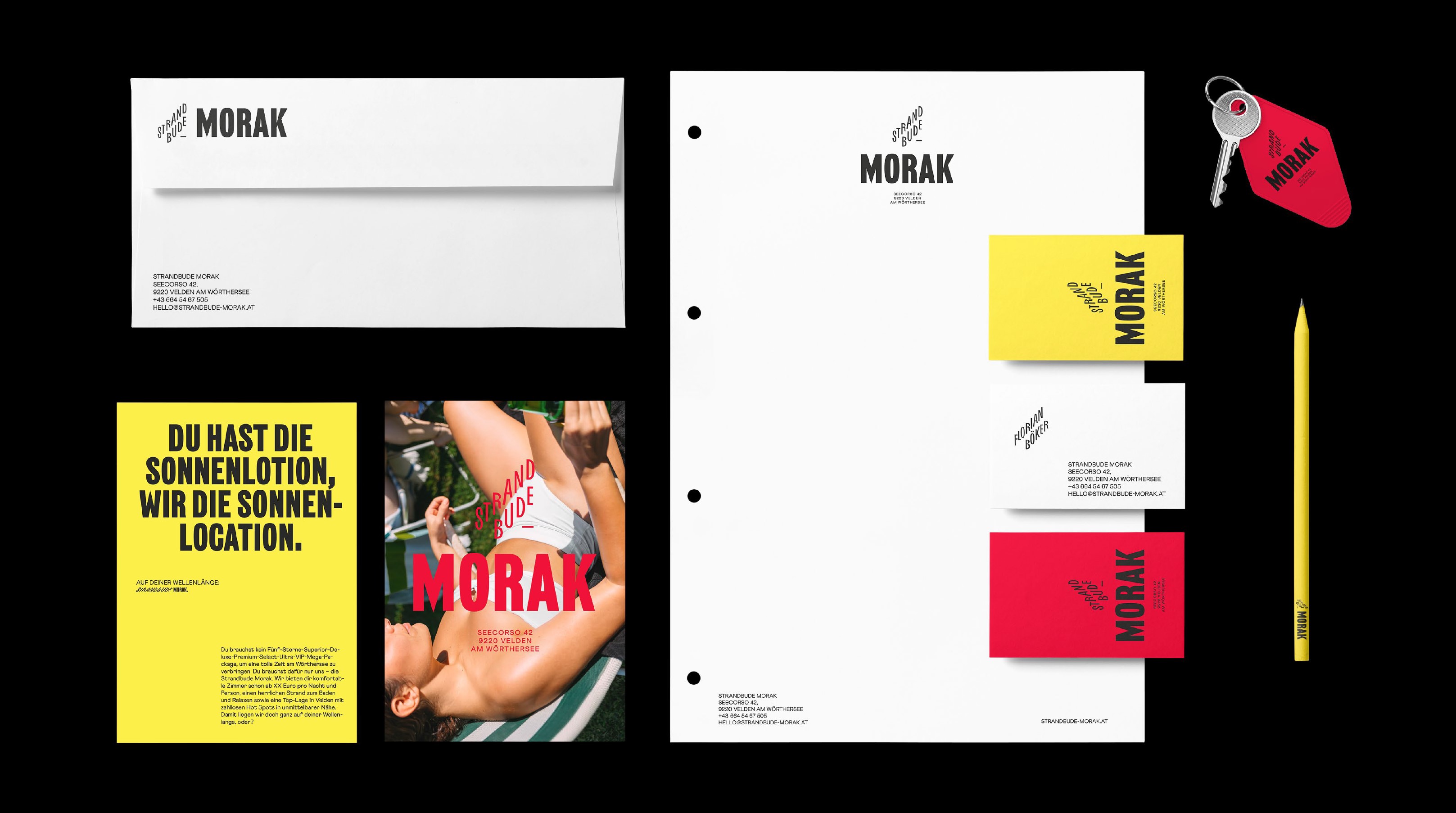 Agentur Lux developed an upbeat and loud visual identity for Strandbude Morak, using bright colours and Farmacia by Nguyen Gobber in combination with Bourrasque 45 Ouest by Bureau Brut for the logo. The diagonally positioned “Strandbude” refers to the stairs that lead into the water. In addition to the aforementioned typefaces, the website uses Athletics from Family Type.