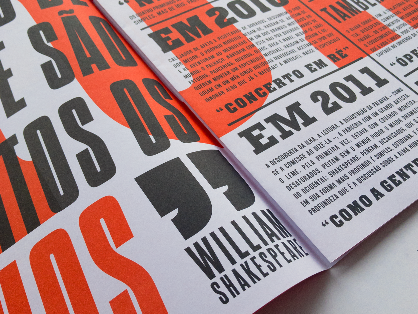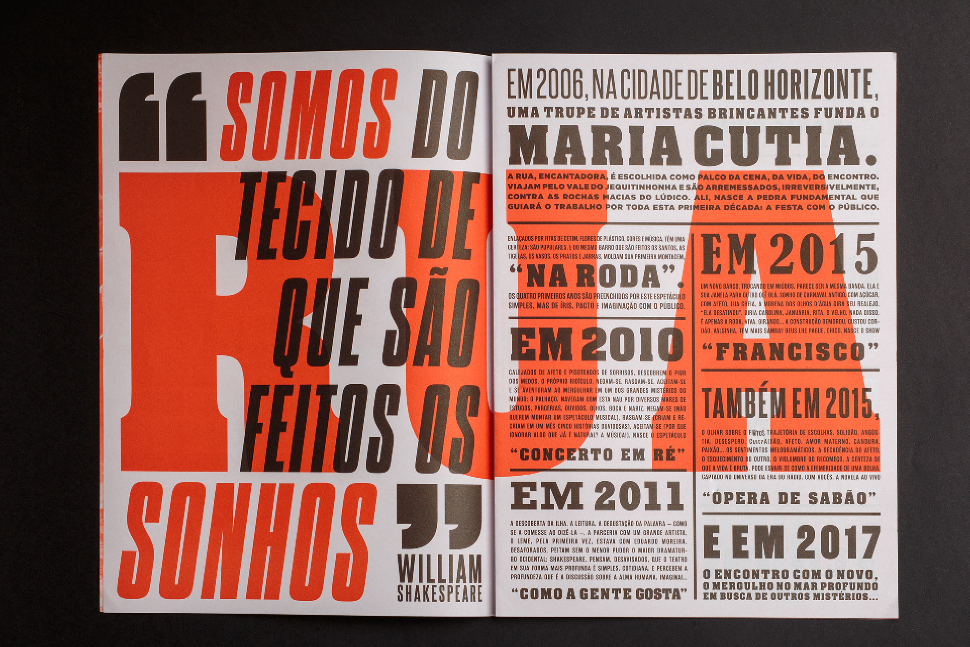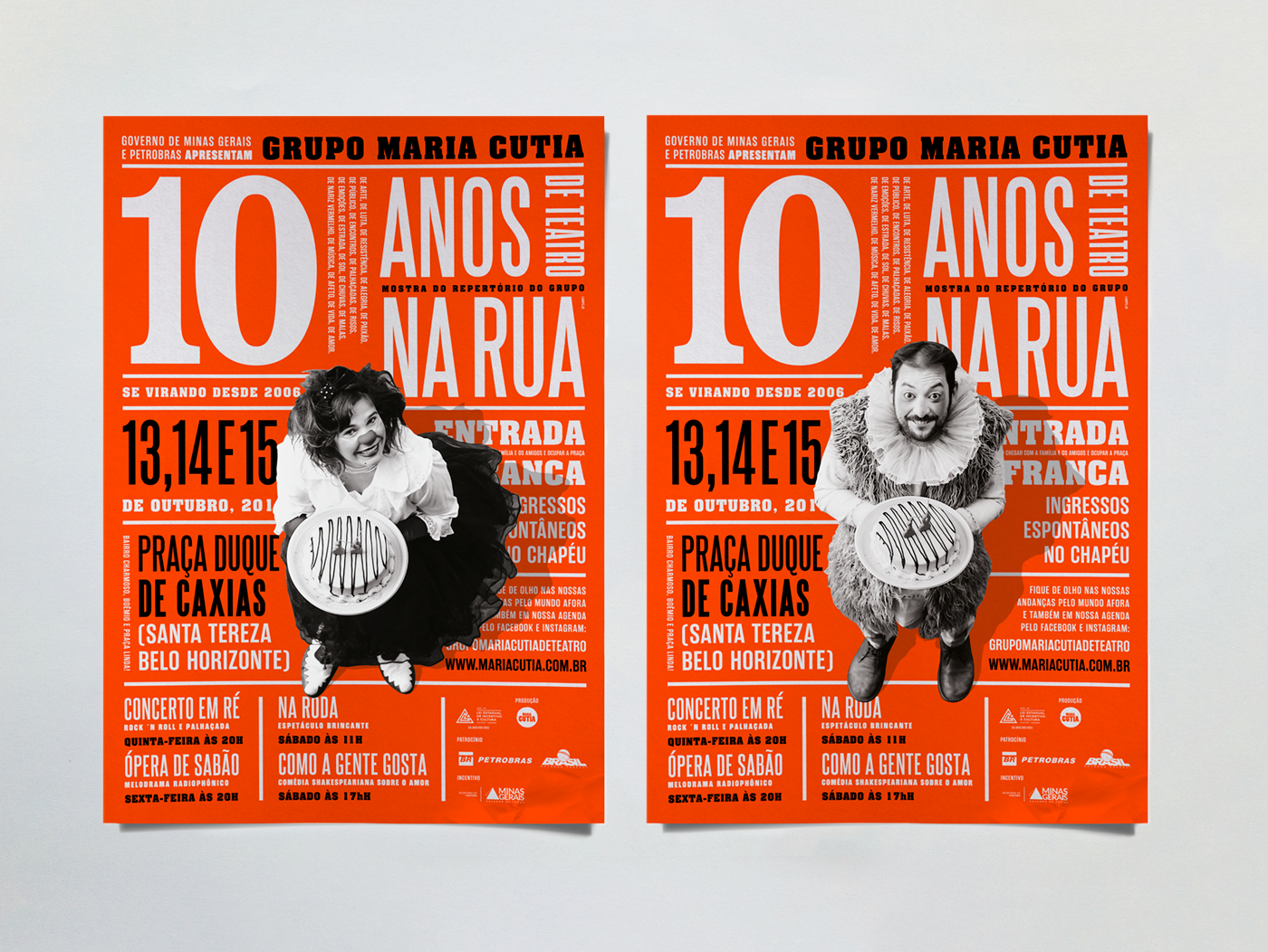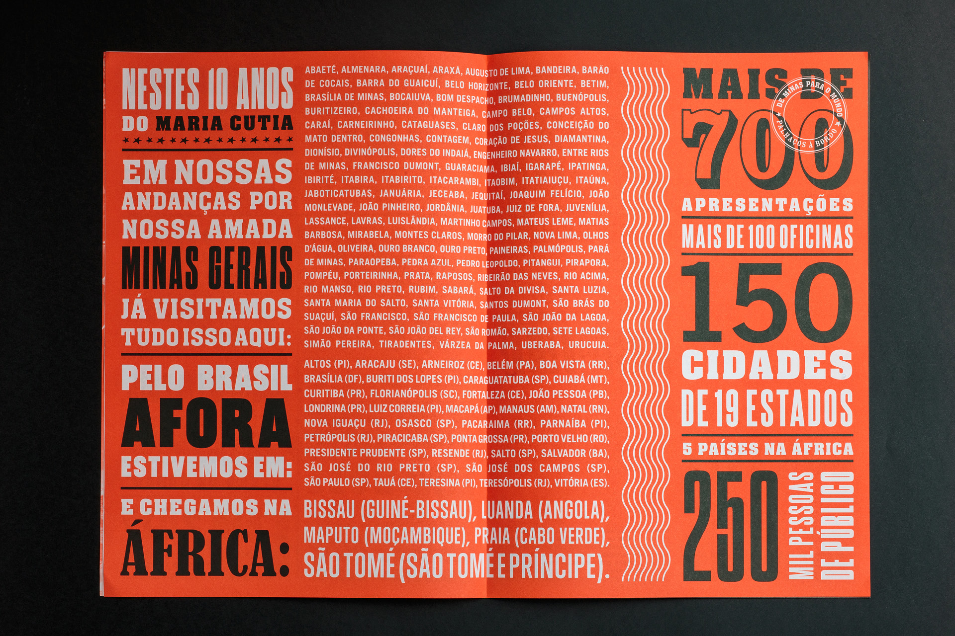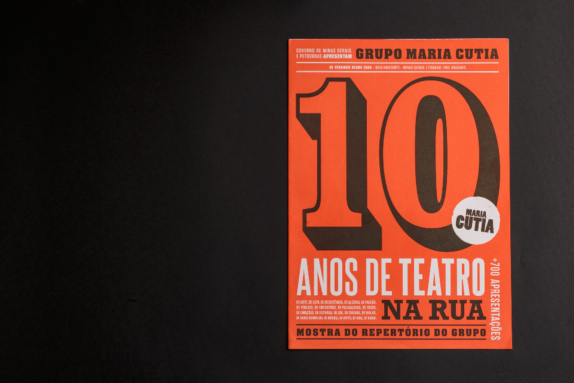 Since 2006, the Grupo Maria Cutia is based in Belo Horizonte and is dedicated to research on street theater. To celebrate the group’s 10th anniversary, we created a visual identity inspired by popular urban posters. Similar to these media, the work consisted of a diverse typographic composition, creating a texture of juxtaposed information.