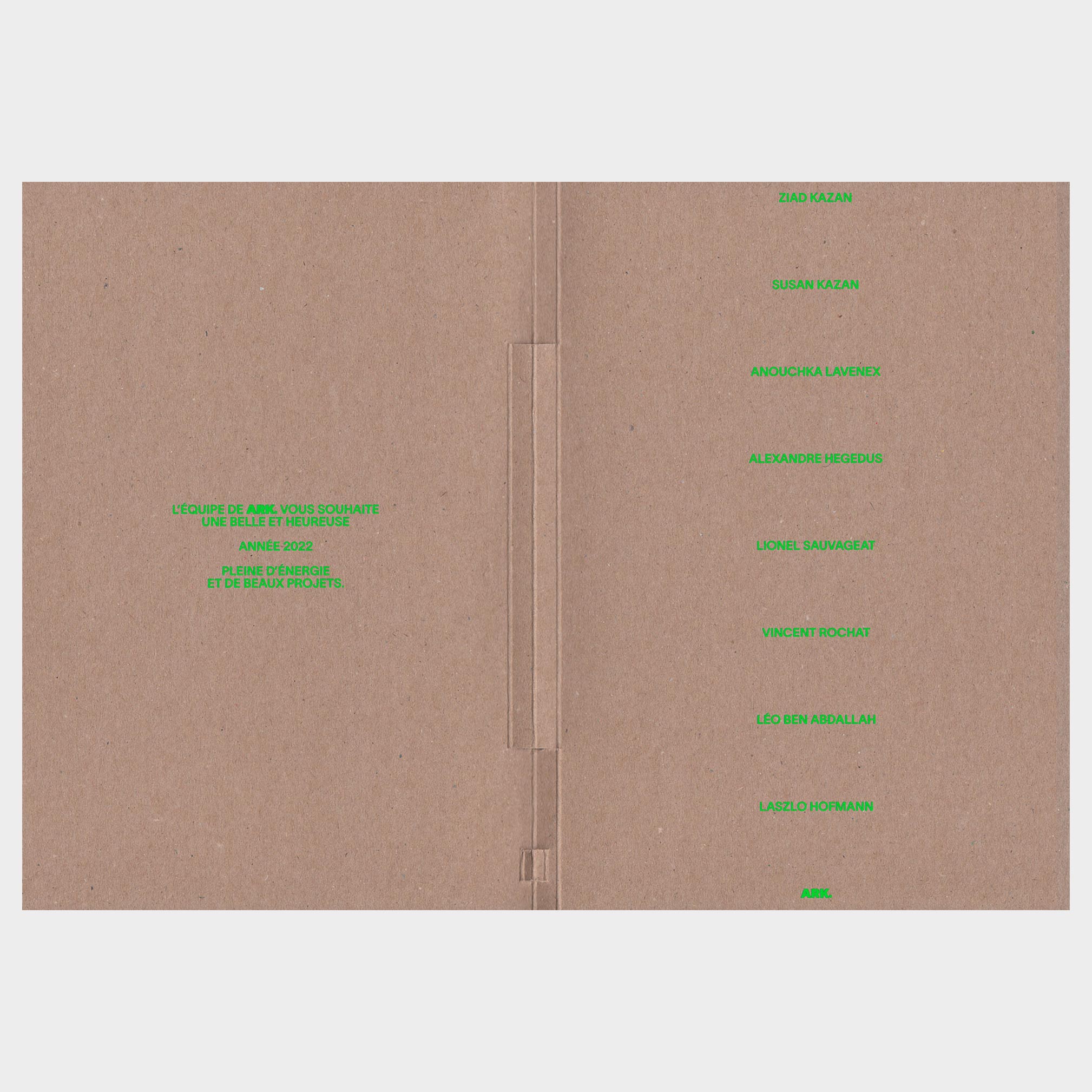 In the continuity and as every year, the architectural office ARK. starts the year by offering to its clients, presentees, partners and friends a worked attention. In addition to a message, each project must contain an additional object that could be kept and use all year. The 2022 card was designed around the pencil it was to carry. As every year, the choice of materials is crucial. It must reflect the ephemeral function of a greeting card. Ideally it can be recycled, recyclable or/and reusable. Visual identity and card designed by NIZAR KAZAN + CO. In use on this card: Millionaire (by Raphaël Verona) and Lausanne (by Nizar Kazan)