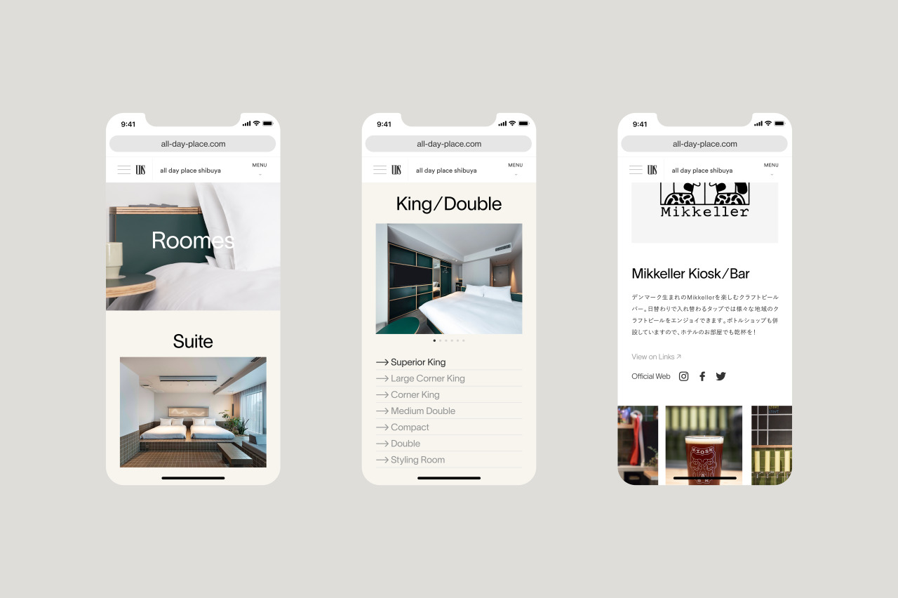 Visual identity and art direction by Sitoh Inc. for all day place shibuya, a hotel located in the Shibuya Ward district of Tokyo. Lausanne (by Nizar Kazan) is the font in use for all English language communication. The Japanese counterpart uses Yu Gothic.