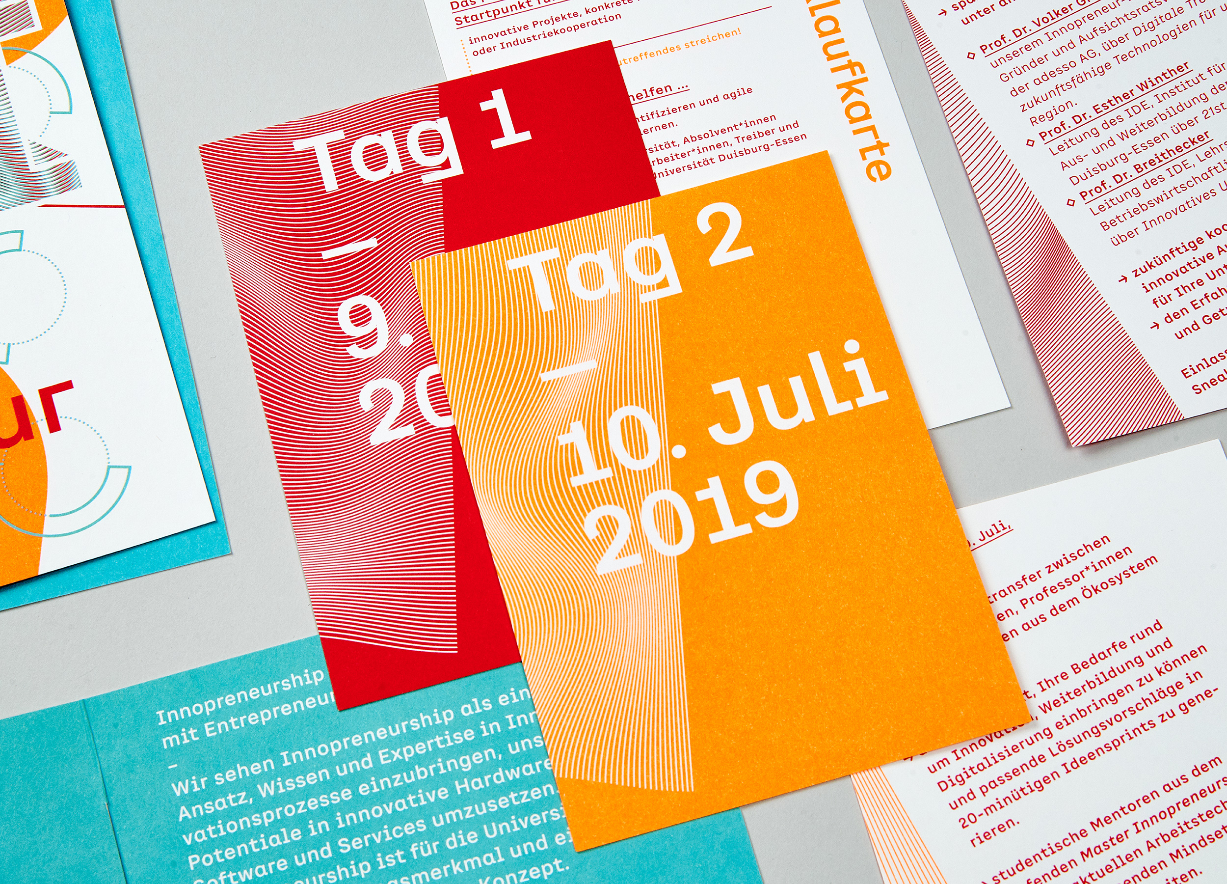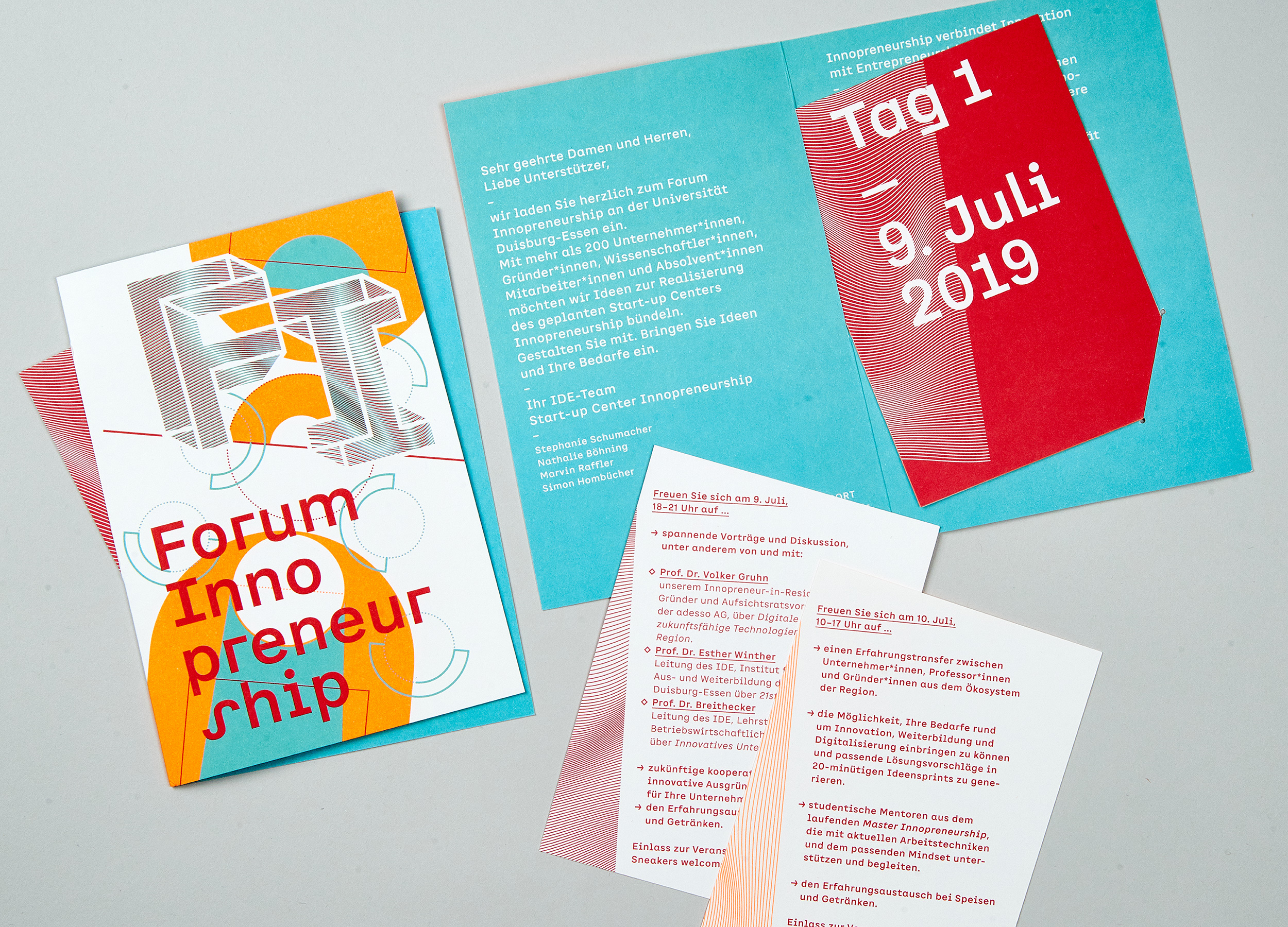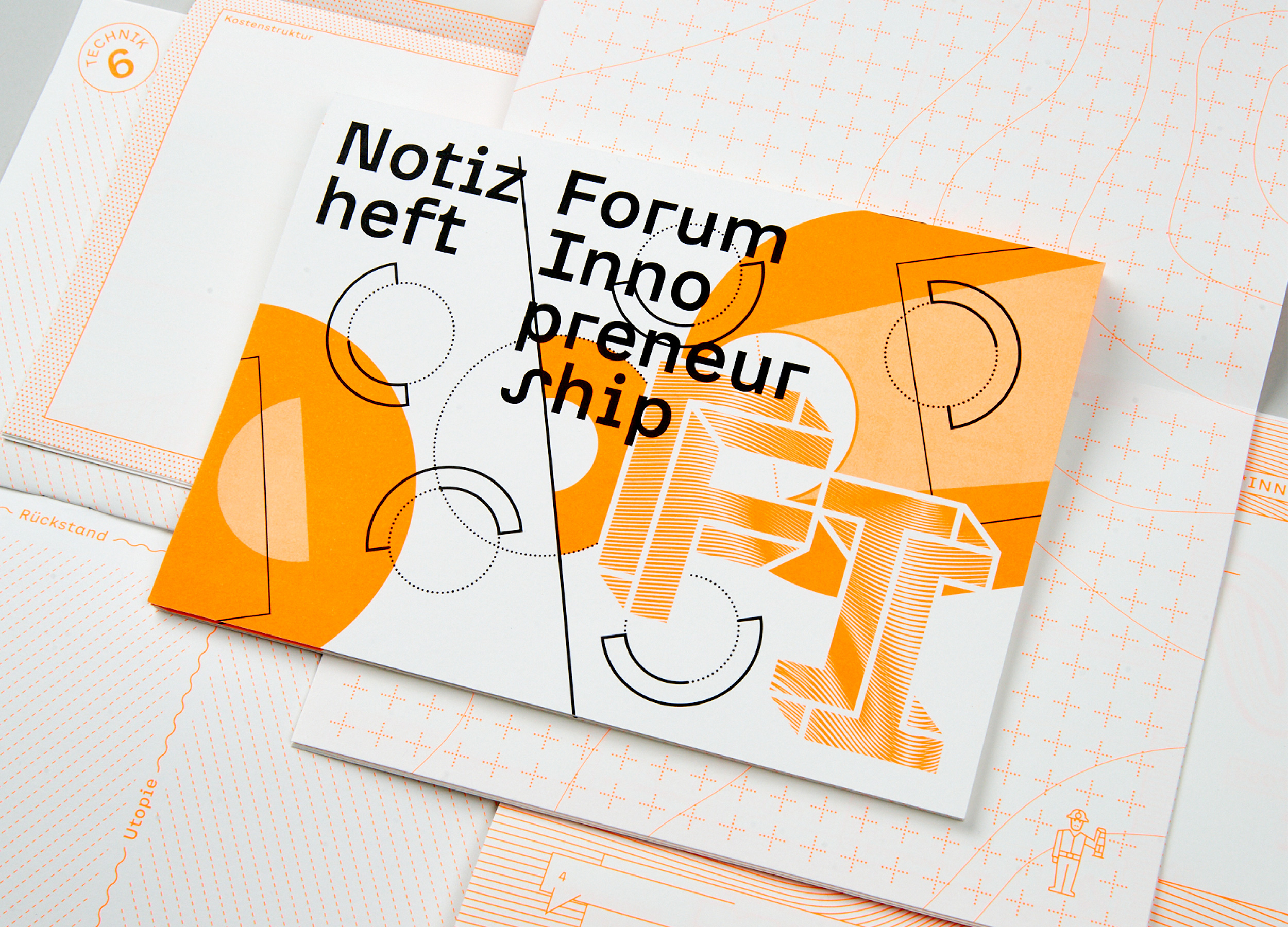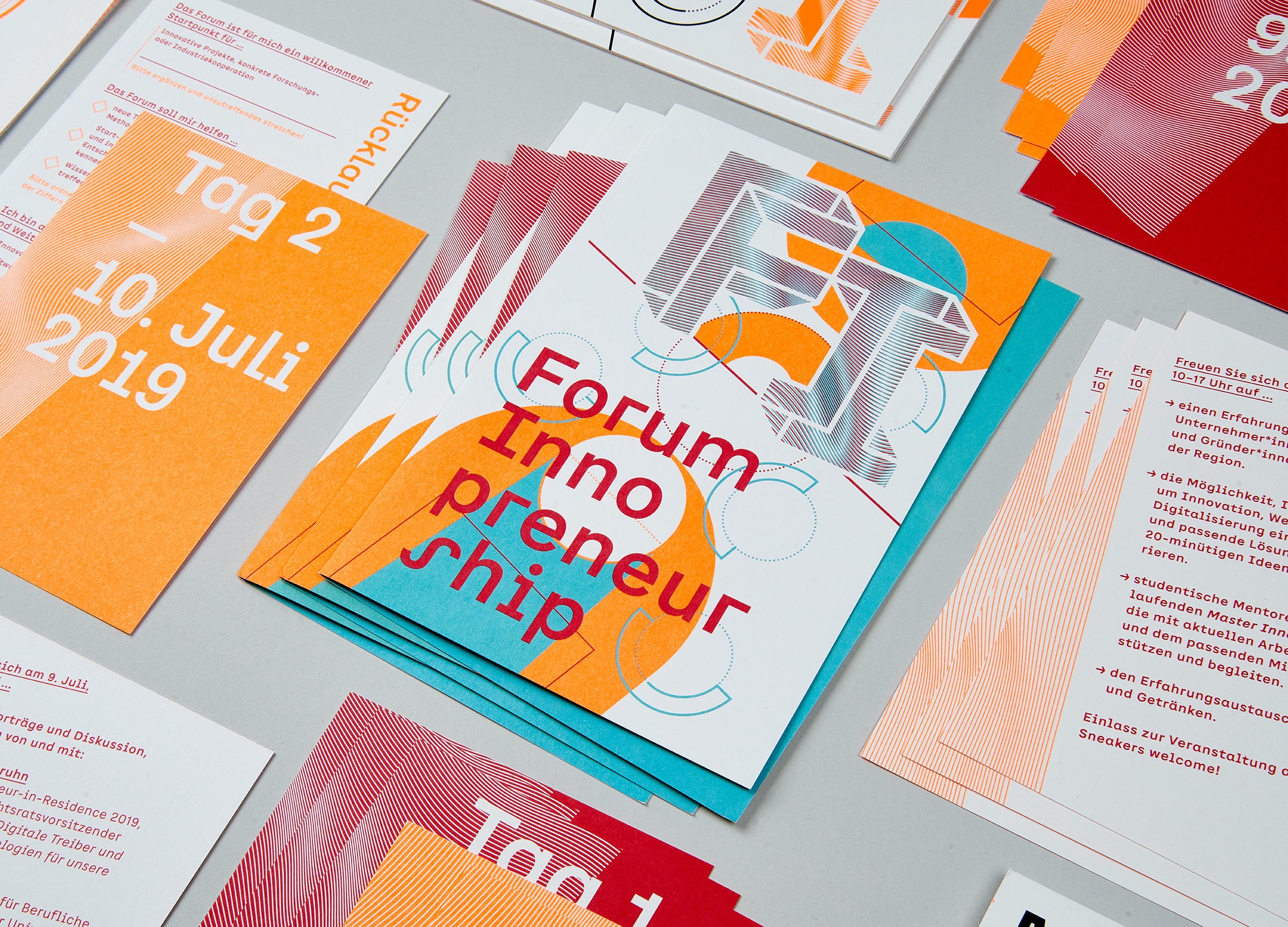 The appearance represents the dynamic approach of the Forum Innopreneurship through a very flexible design. With a mixture of permanent and changeable parts, a design with a high recognition value is created, which at the same time leaves room for new, complementary and supplementary design elements. An incomplete set of shapes and graphic elements invites ever new combinations. The playfully dynamic approach, the typography and the signet are unifying elements.