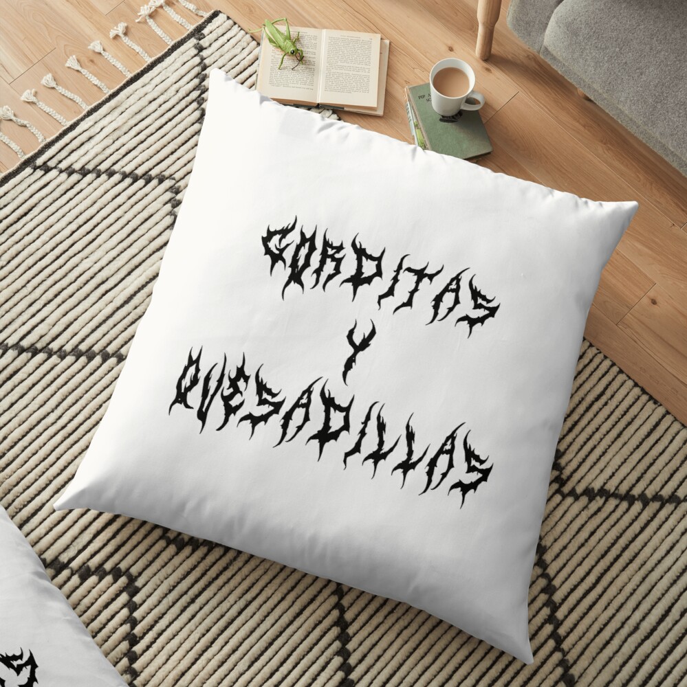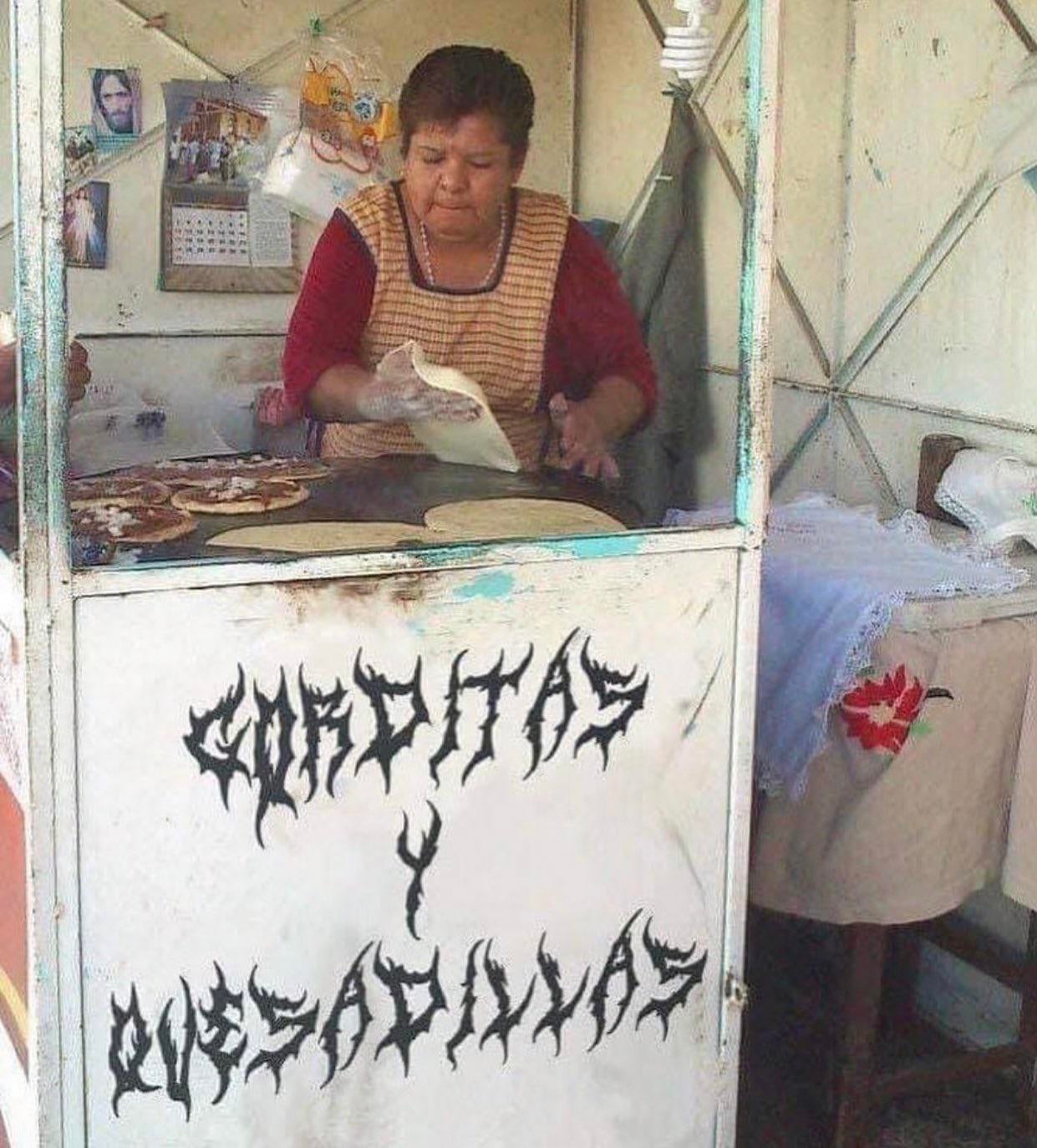 In June 2018, a photo was posted on Don Mamastroso’s Tumblr, captioned “No sé si pedir mi gordita con salsa verde o con la sangre de mis enemigos” (Dunno whether to order my gordita with green salsa or with the blood of my enemies.”). It was further popularized in September 2021 by Twitter user @buddy_ferrara, here with the comment “what if we kissed at the death metal gorditas y quesadillas stand”. The rest is internet history, and now one can buy T-shirts, throw pillows (see below) and other merch exploiting this meme.