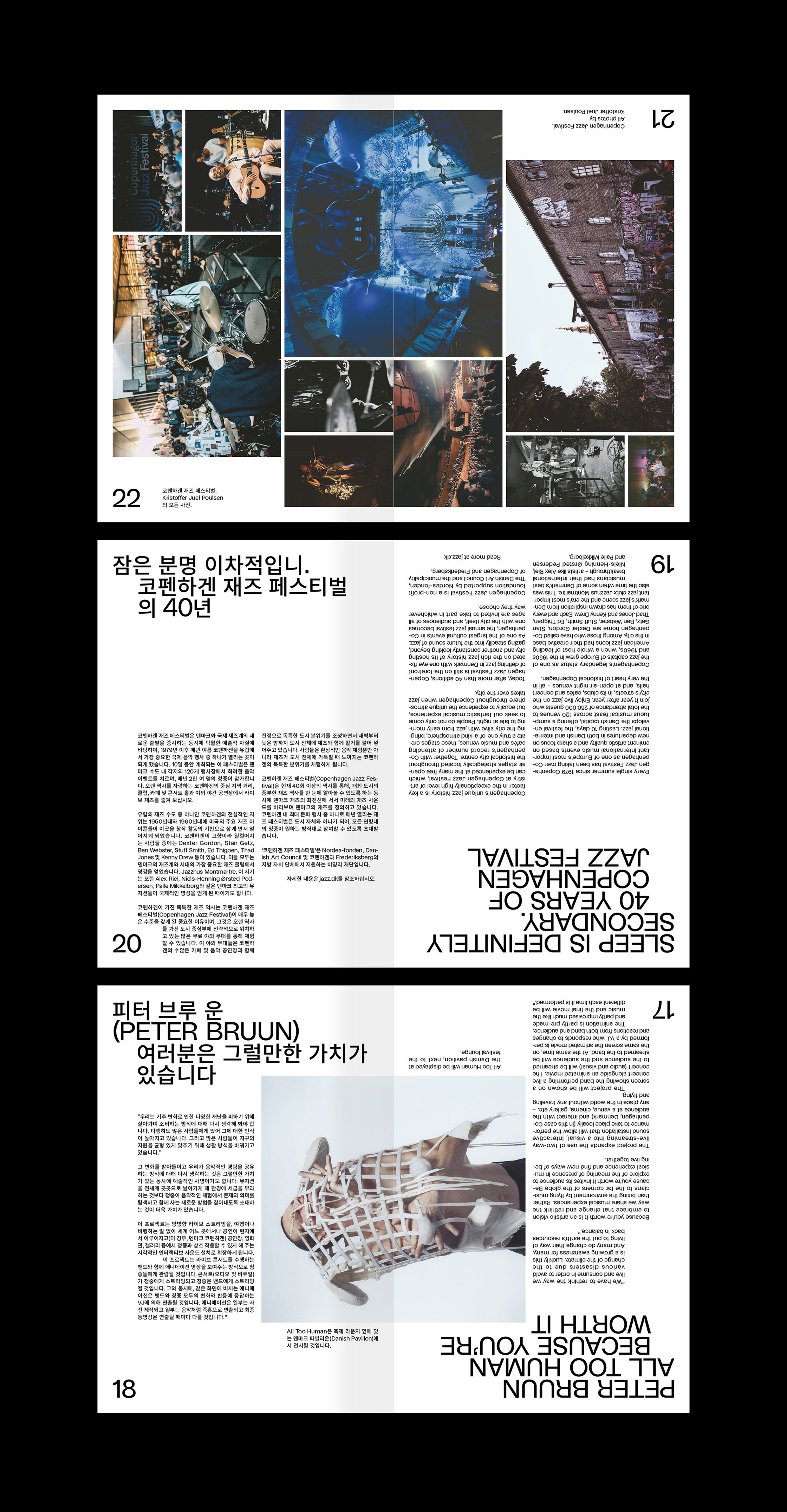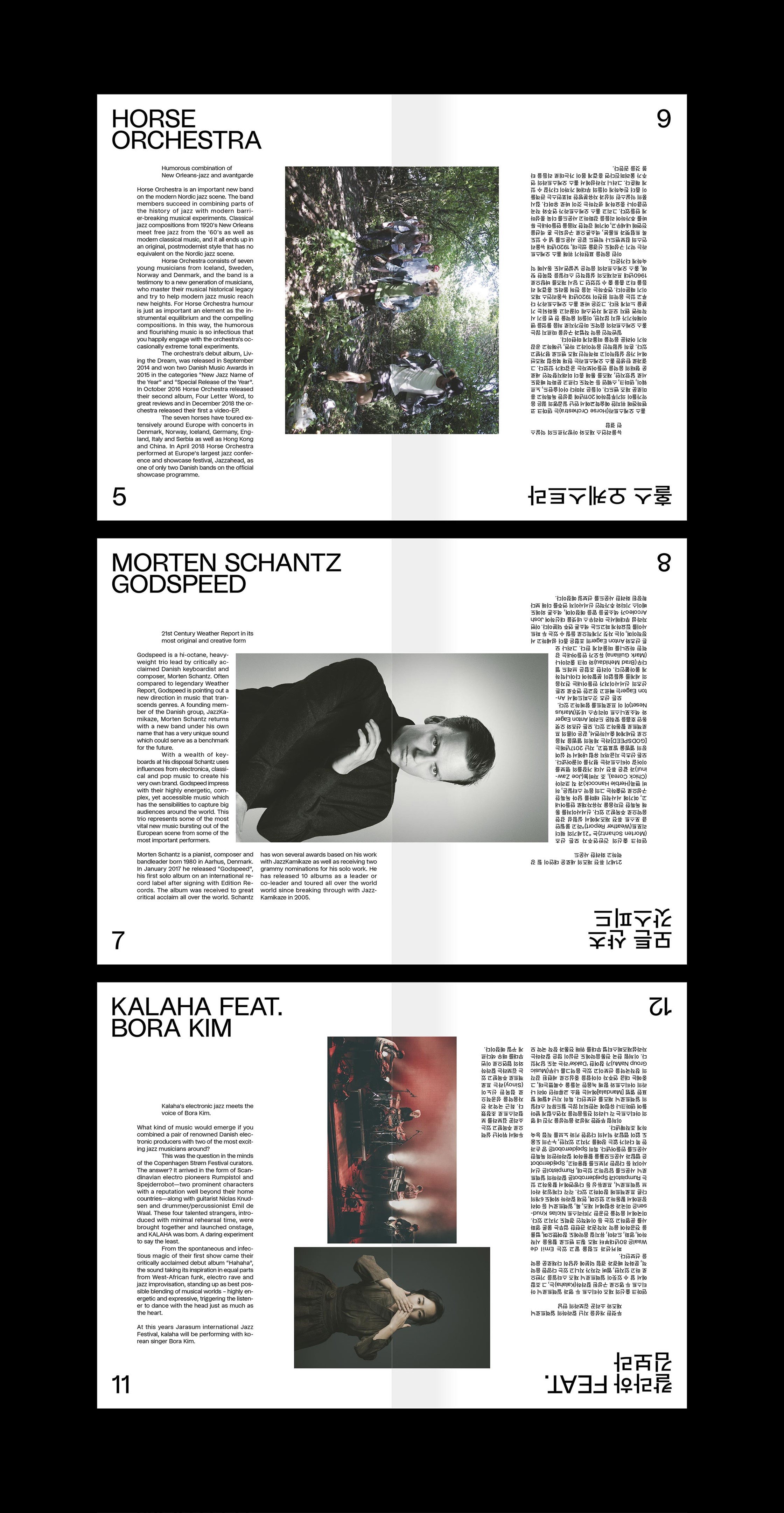 The end result is an all together bilingual design solution, where the two primary languages English and Korean, using Studio 6 by Playtype, are made fully legible from two different directions at once throughout the layouts. Turning to the center of the paper, the center spread was designed as a 2-in-1 concept featuring both newspaper and festival poster.