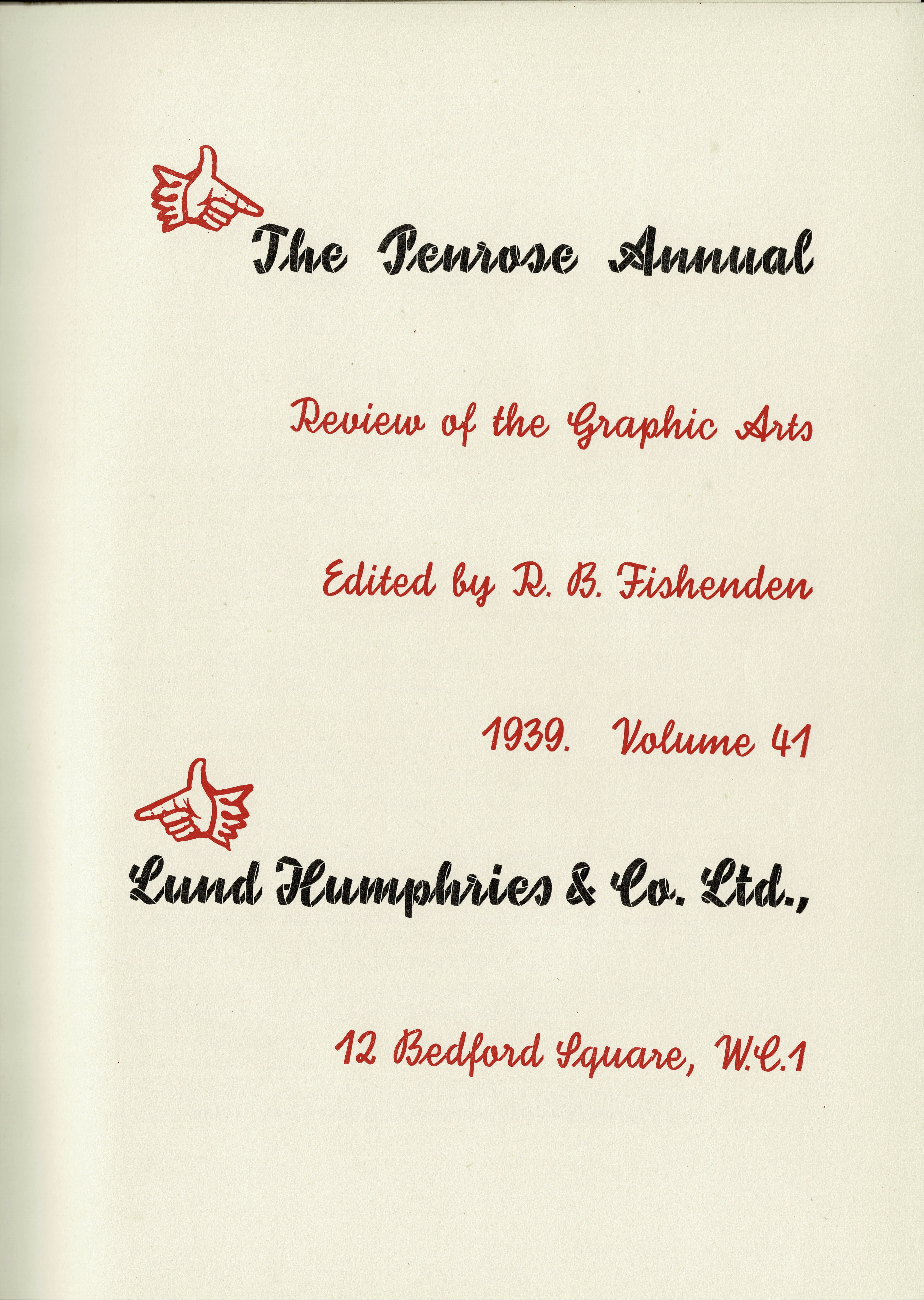 The title page to the 1939 Penrose Annual, Volume 41 in the annual series of the publication that charted developments in printing and the graphic arts. Published by Lund Humphries of London and Bradford, West Yorkshire, the typography and binding was designed by Francis Meynell and the script lettering used for headings came from Caslon, Monotype, and Soldans.