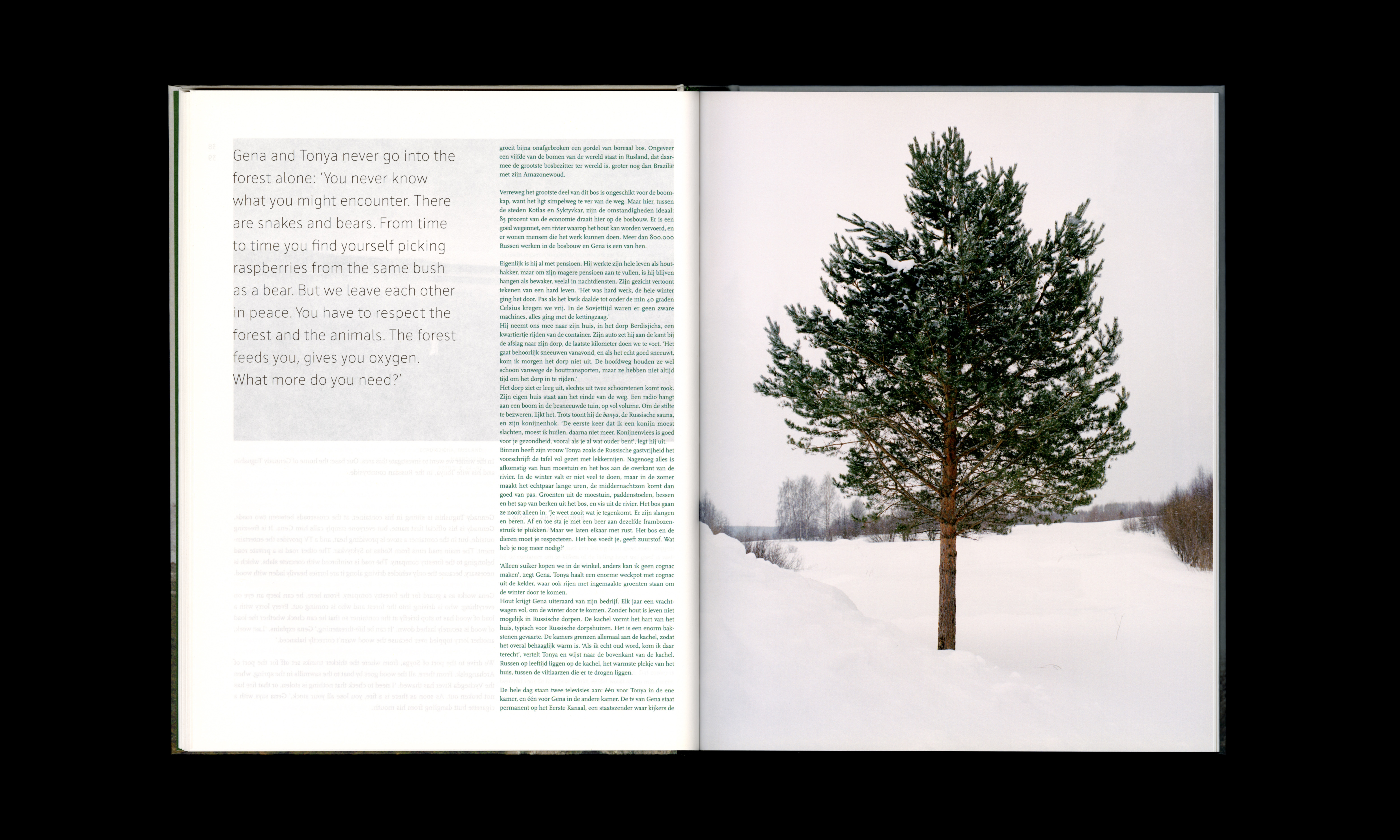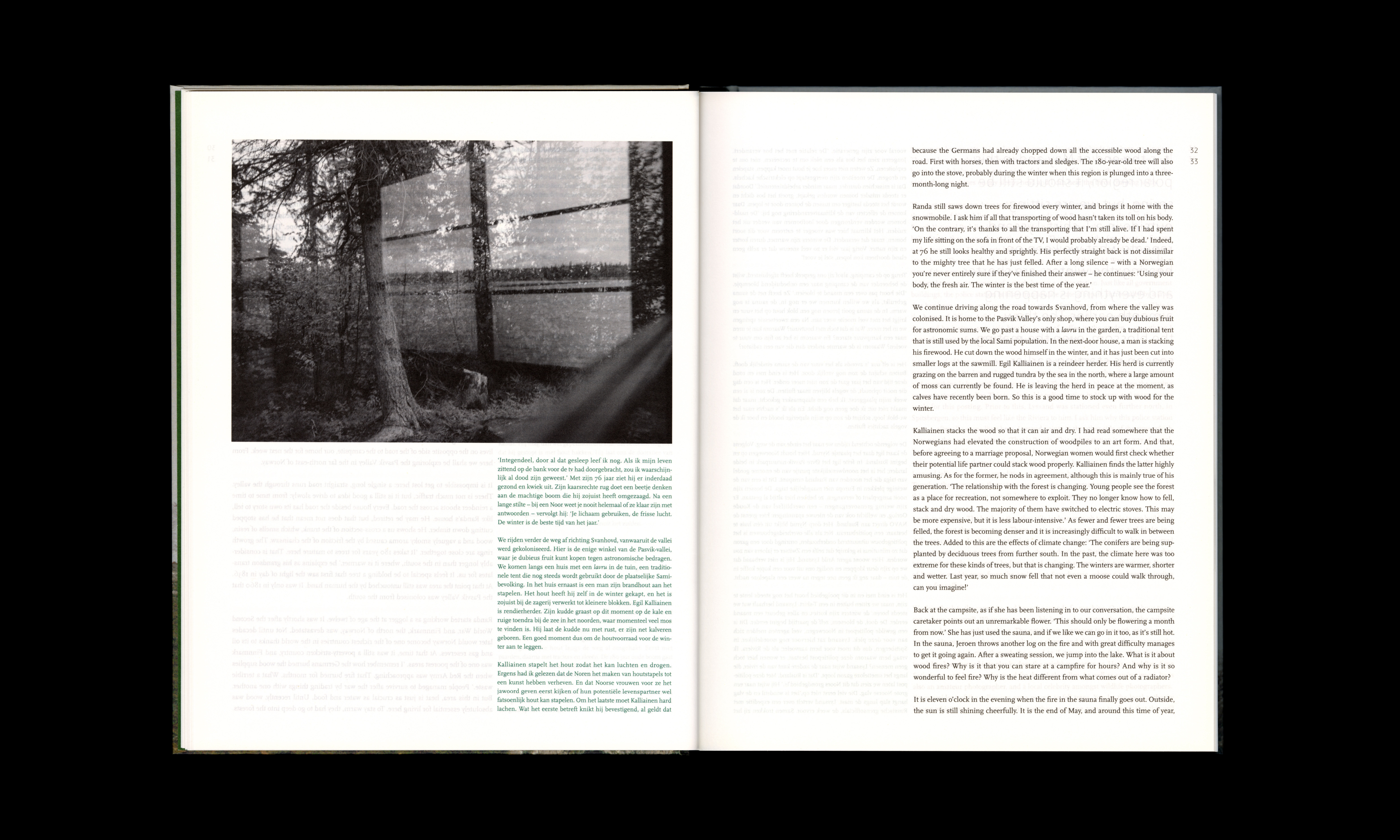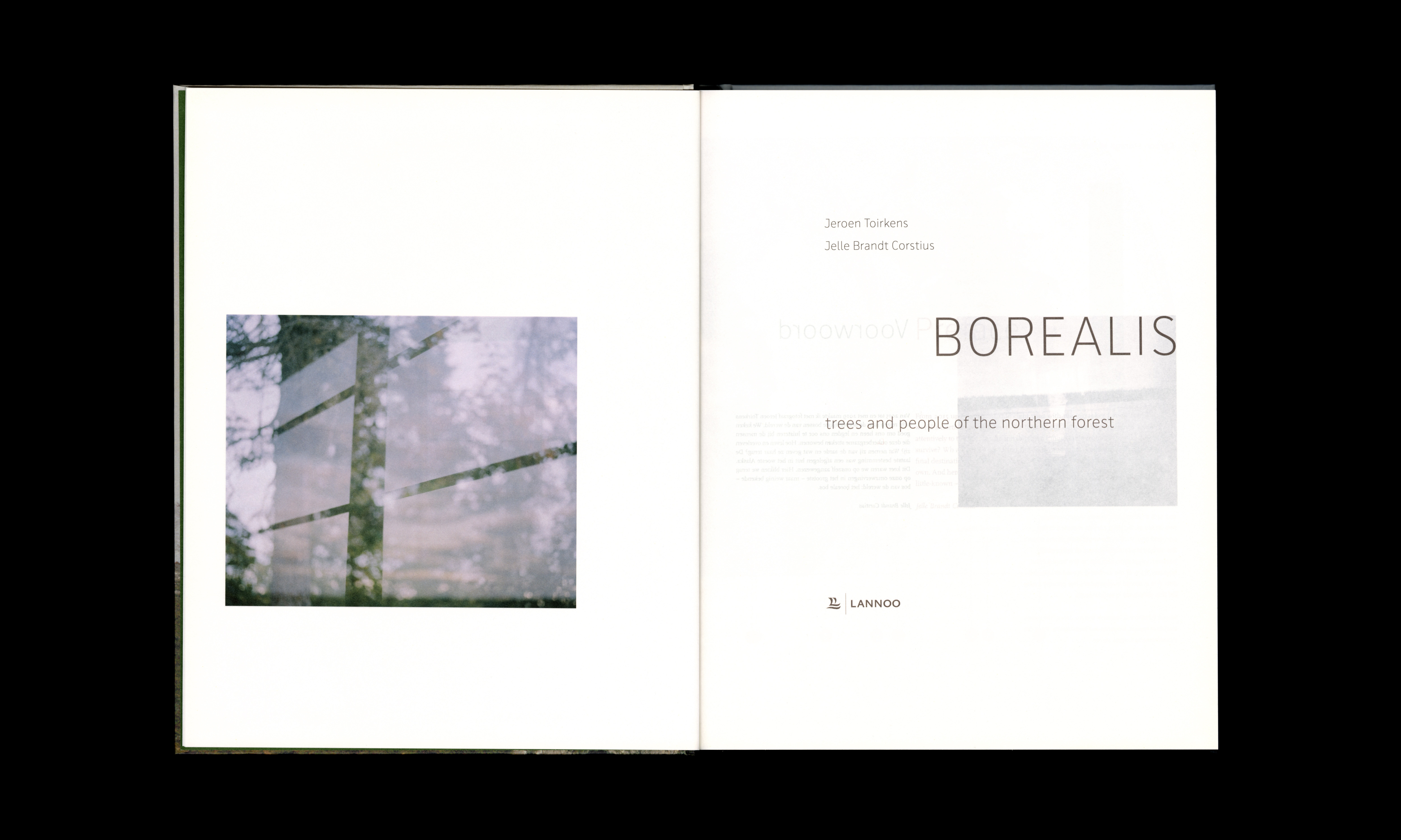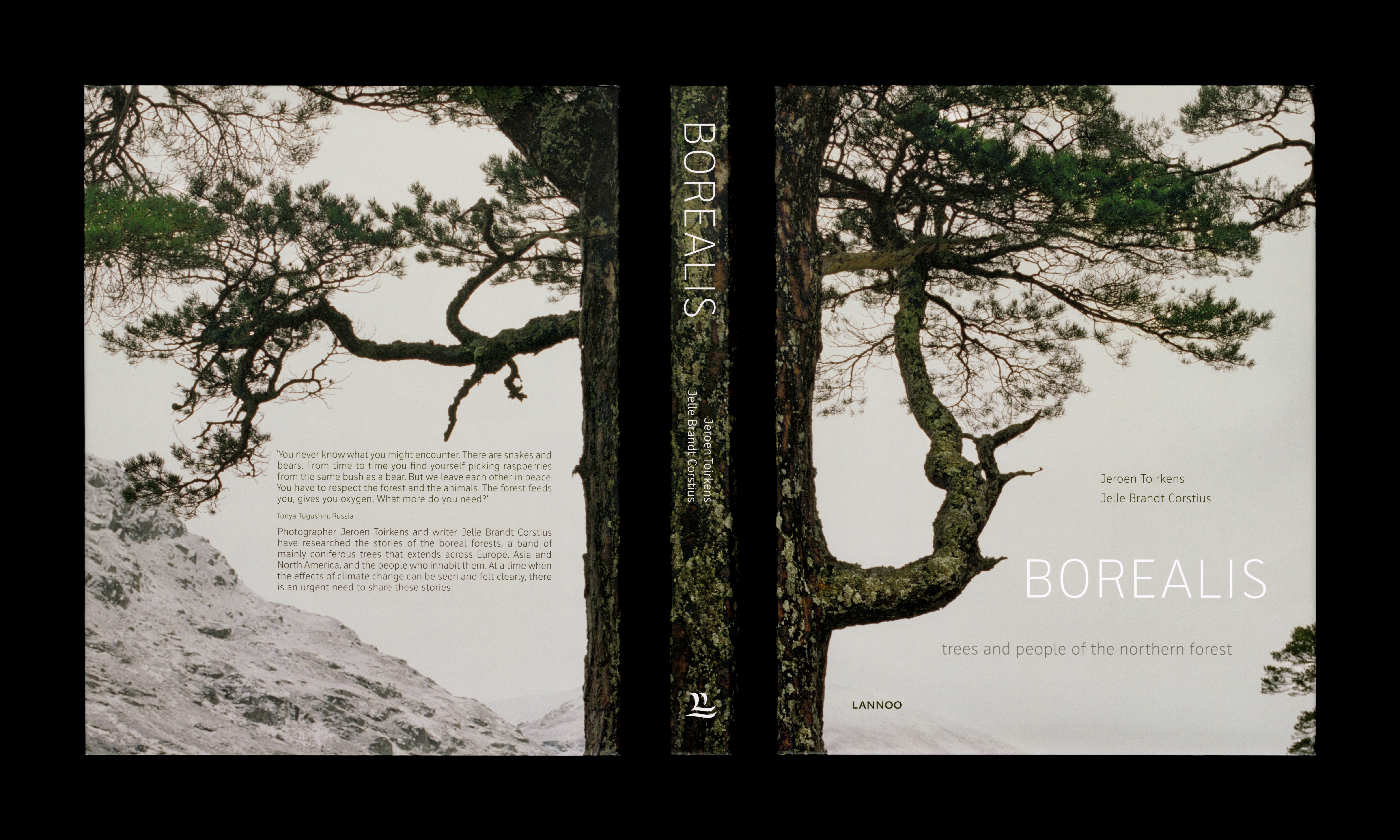 In 2020, Wout de Vringer handled the book design for Borealis: trees and people of the northern forest. The project was initiated by photographer Jeroen Toirkens and journalist Jelle Brandt Corstius, who travelled to these forests, looking for the stories of the people living there. Their mission turned into eight very different journeys, to Norway, Scotland, Canada, Japan, Alaska, and Russia. The book was published in conjunction with the exhibitions Borealis, life in the woods at Fotomuseum Den Haag, the Netherlands, and Anchorage Museum, Alaska, United States. A limited cassette edition was produced as a crowdfunding project.