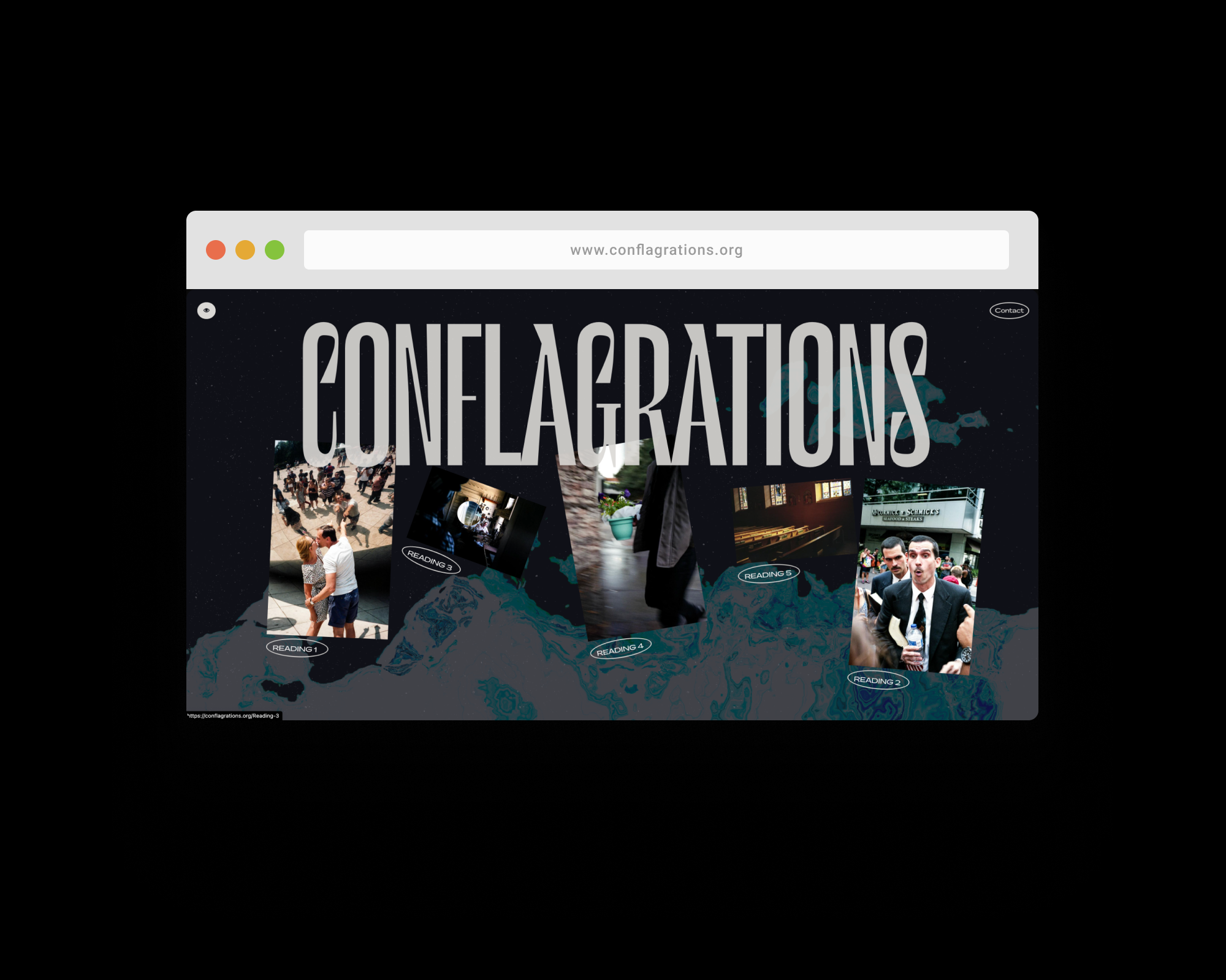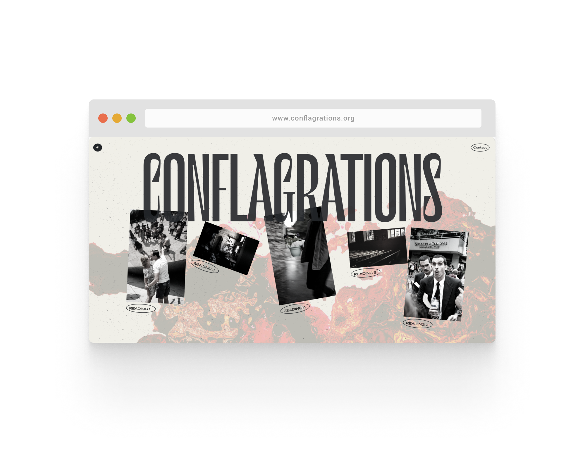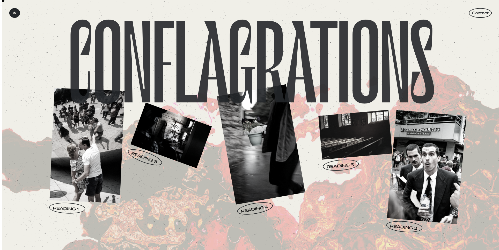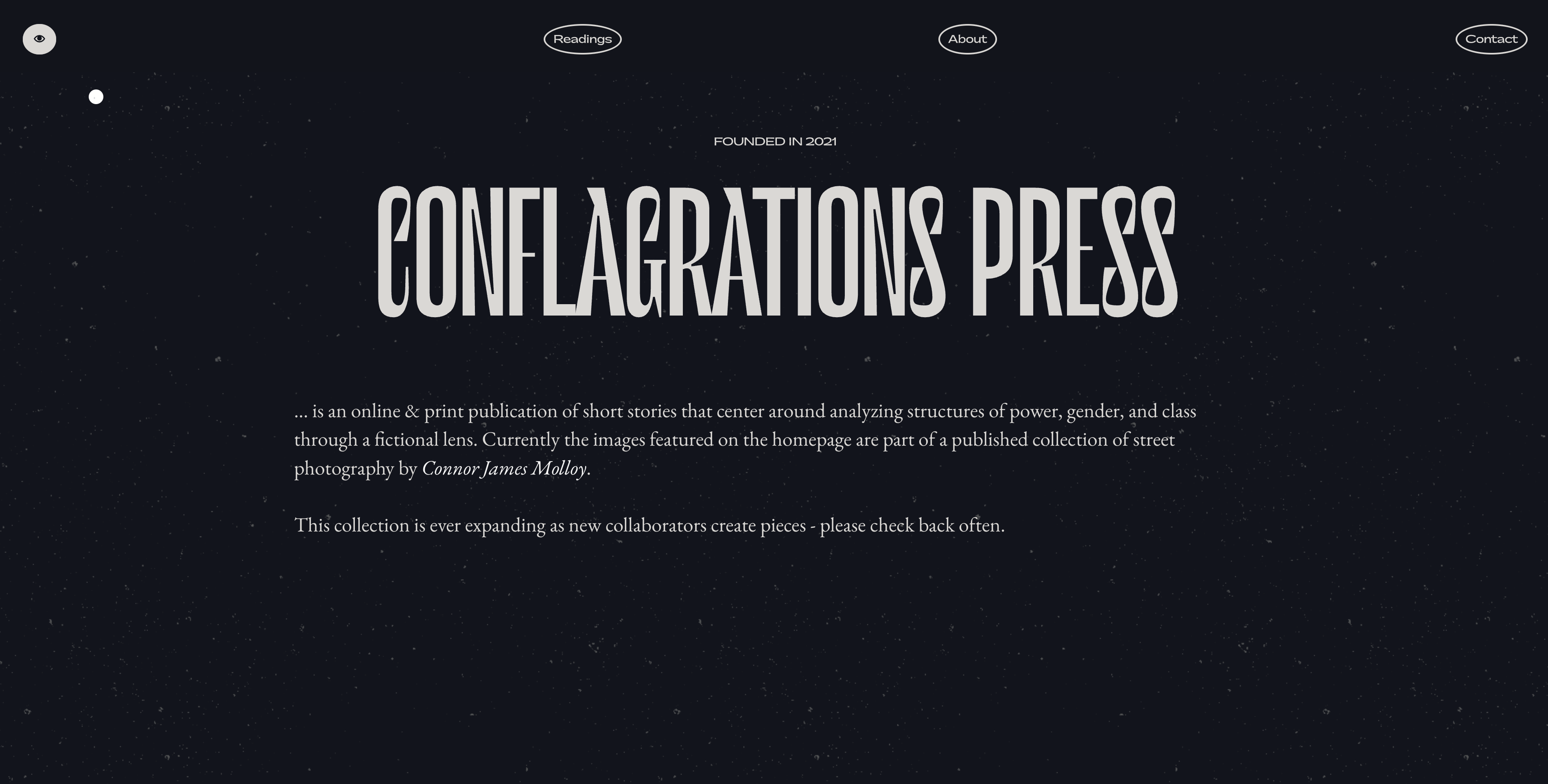 Conflagrations Press is an online and print publication of bleak short stories that center around the analysis of power structures, gender identity, and classism through a fictional lens. The photos featured on the homepage are part of a published collection of street photography by Connor James Molloy.