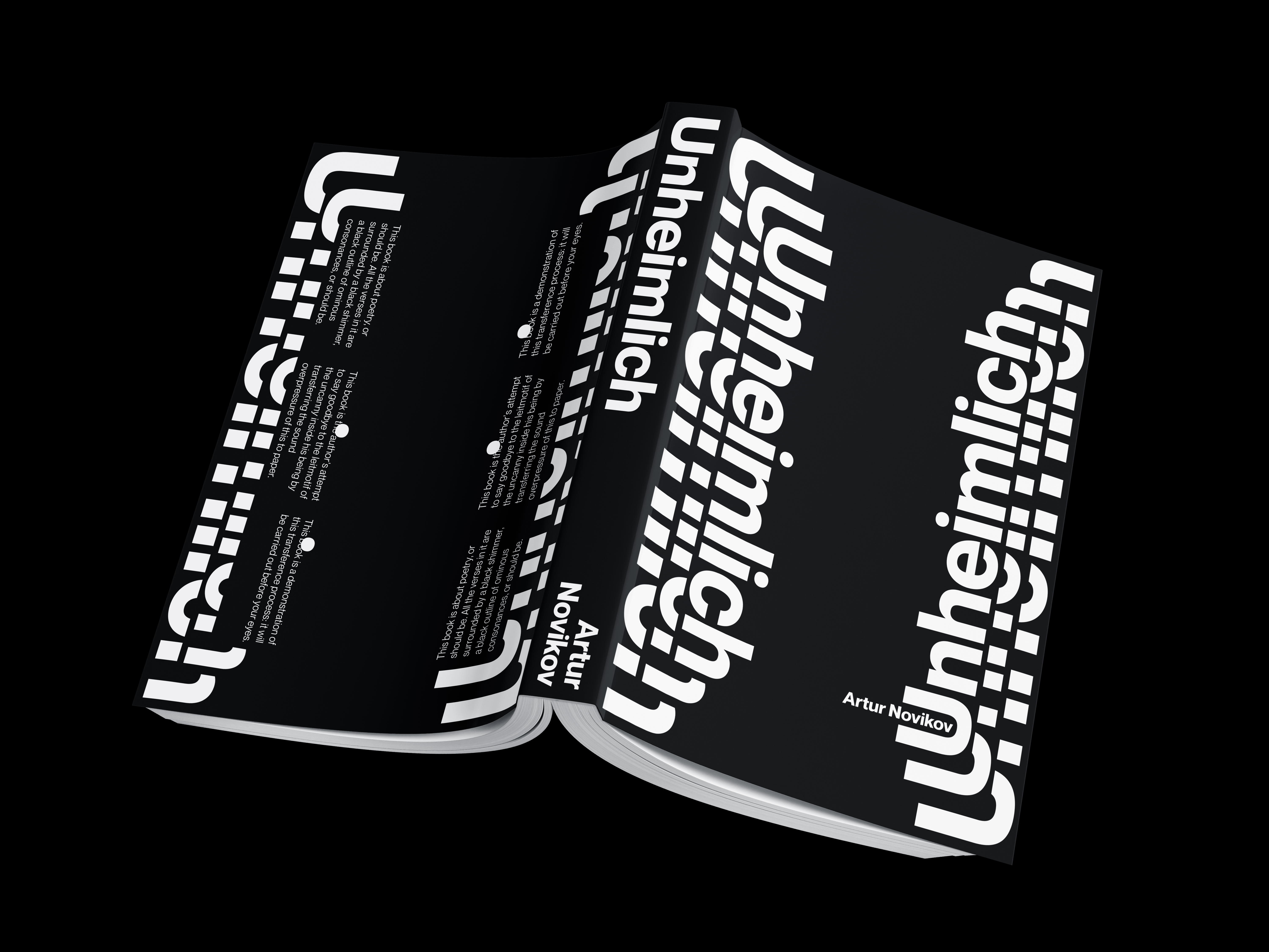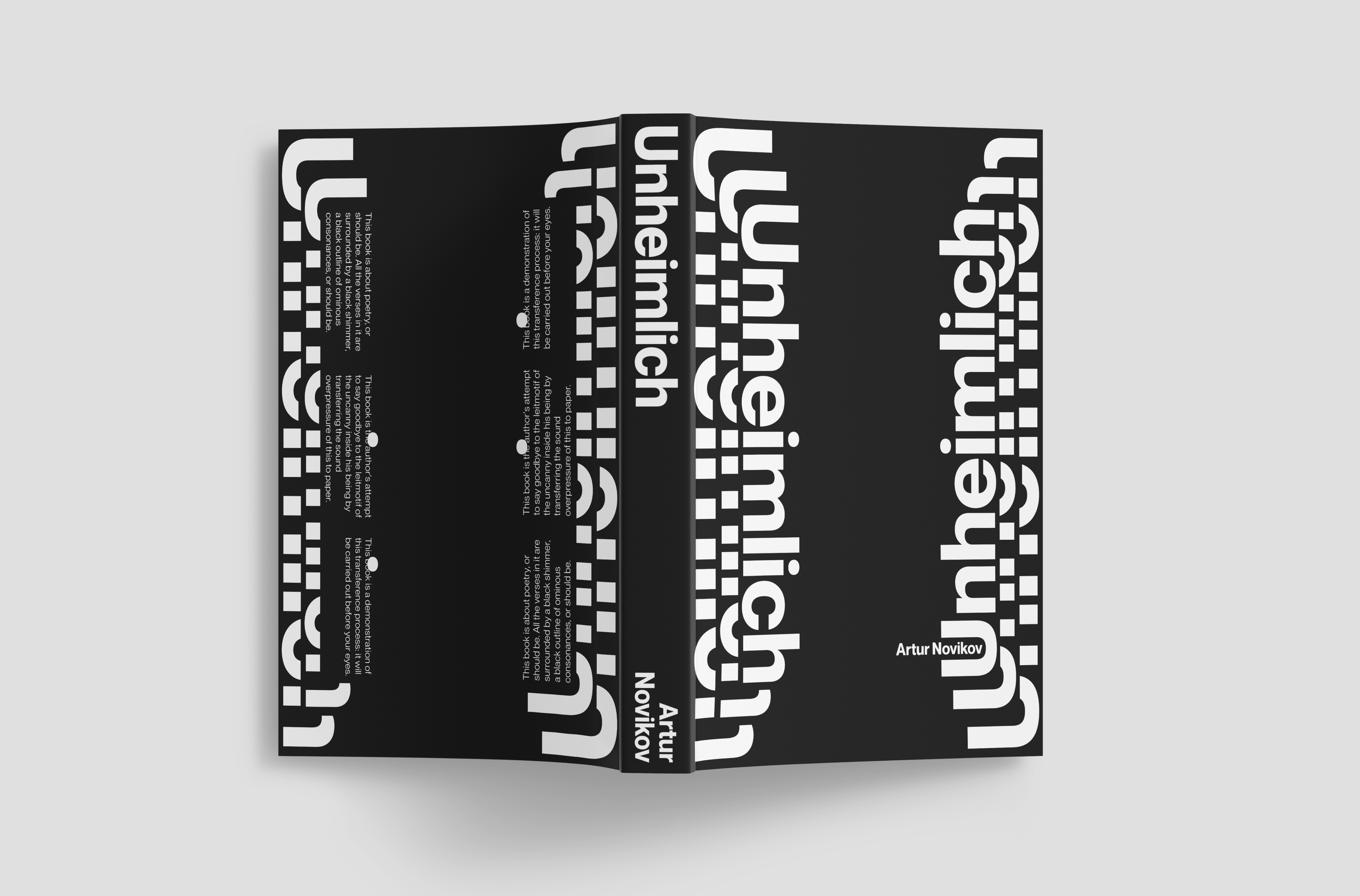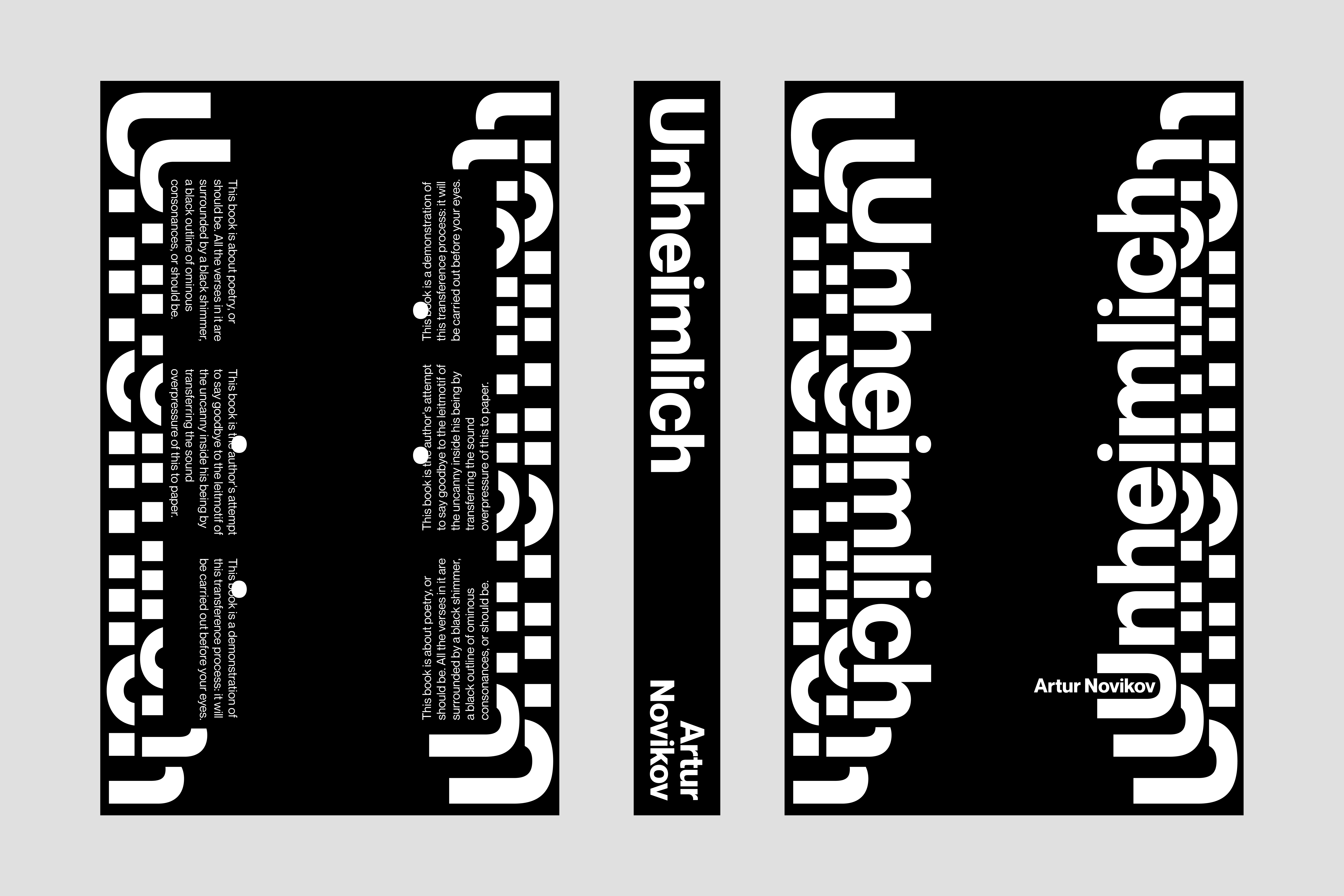 This repetition principle is expressed on the front as well as on the back cover to become one unit. The back cover inherits the points from the letter i, extracted from the front cover word “Unheimlich”. It is a reference to a poetic rhyme, when words from one line convey particles of the sounds of words from the previous one.