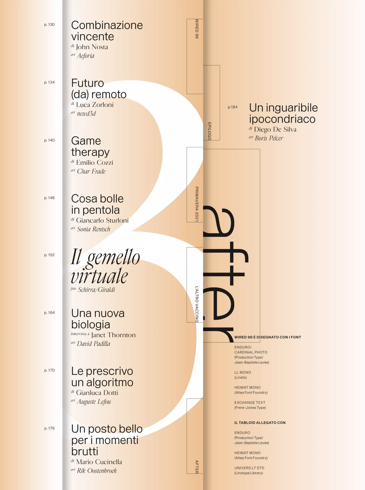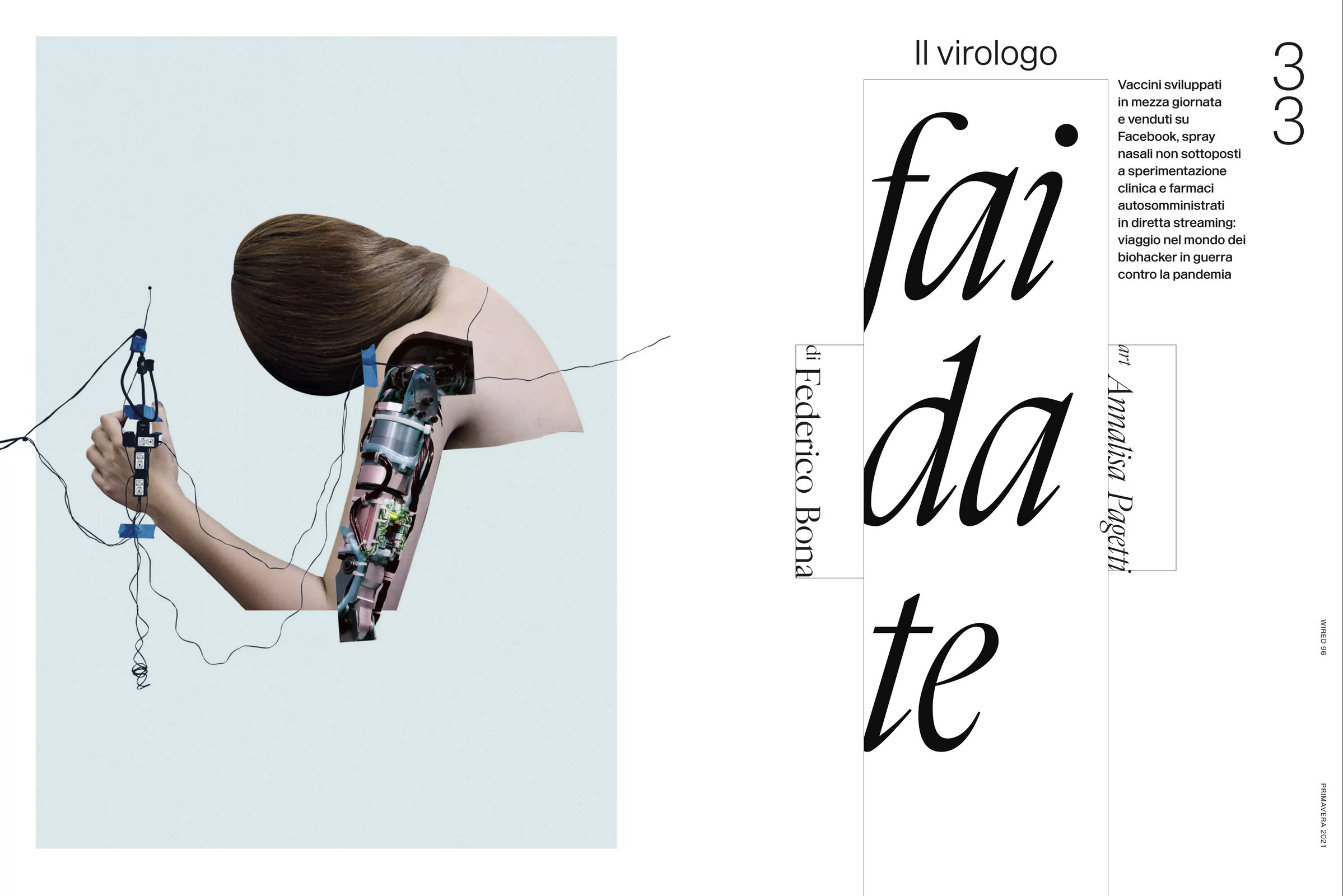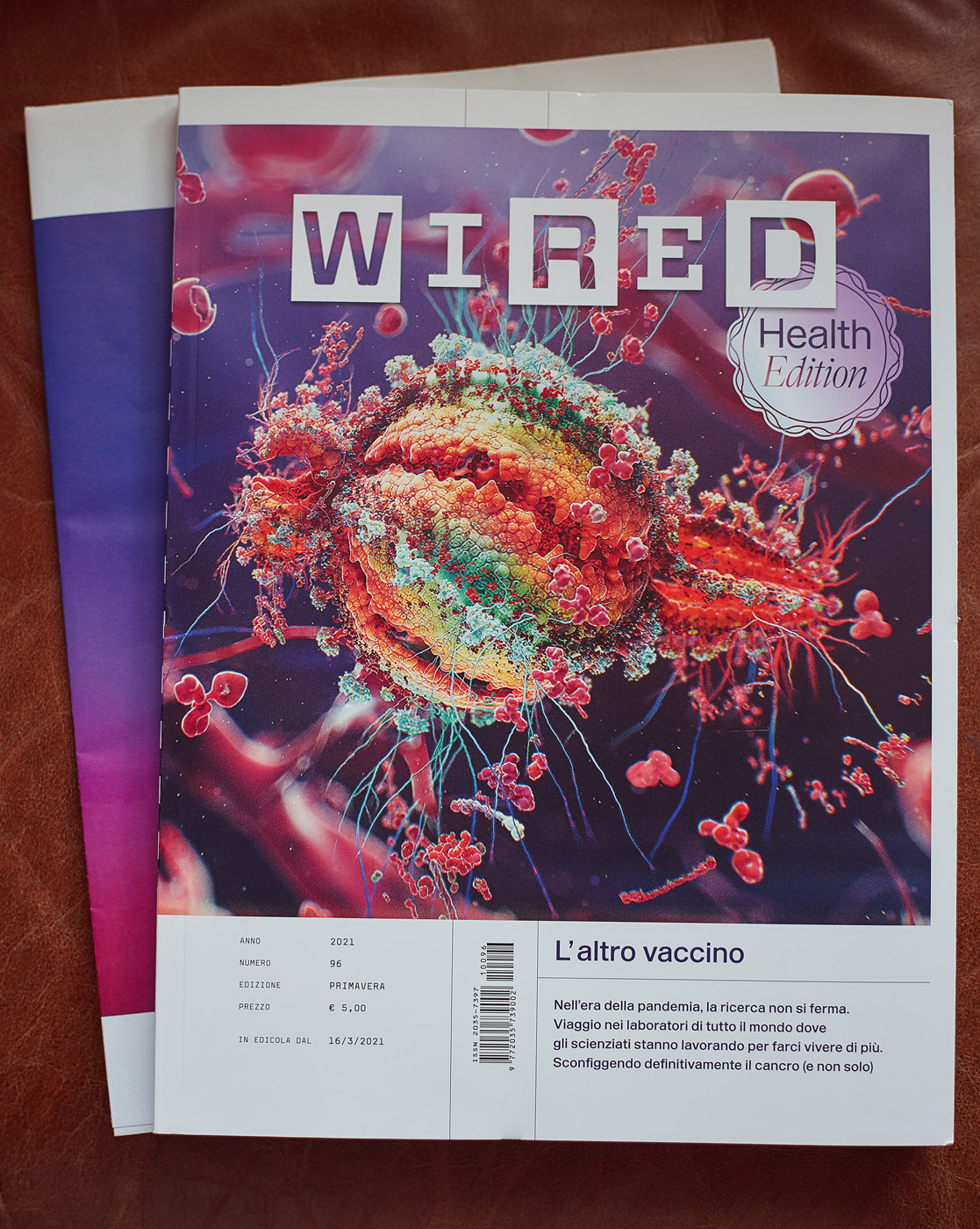 Wired Italia is a quarterly bookazine. Last year’s spring issue was entirely devoted to the topic of health, and entitled “L’altro vaccino” (“The other vaccine”). In a time dominated by the Covid-19 pandemic, medical research has not stopped. The special Health Edition has stories from laboratories around the world, of pharmaceutical companies, doctors, scientists and researchers who have moved on and continued to make breakthrough discoveries, develop drugs and cures that could save or extend our lives, and explore new horizons in medicine and biology.