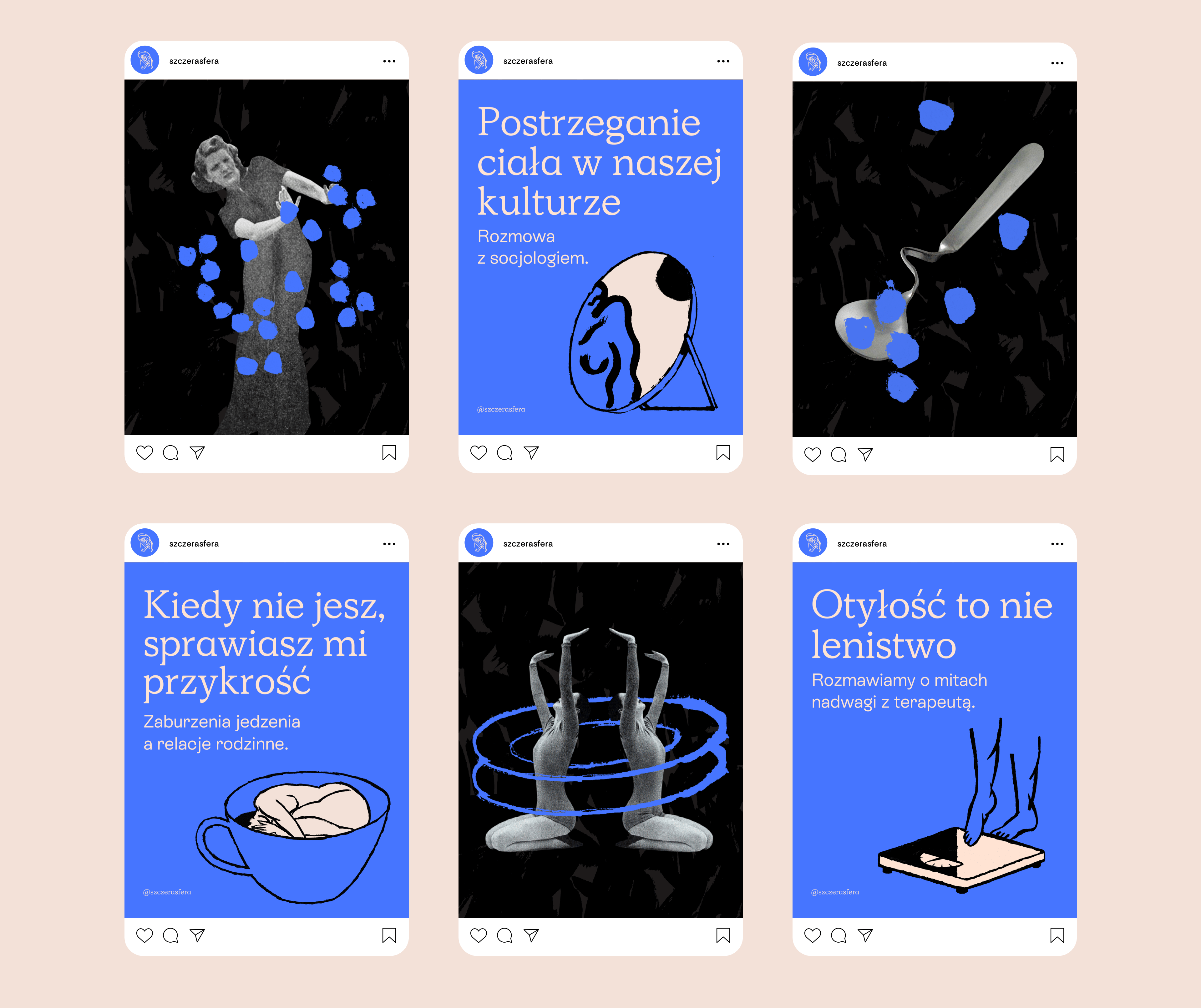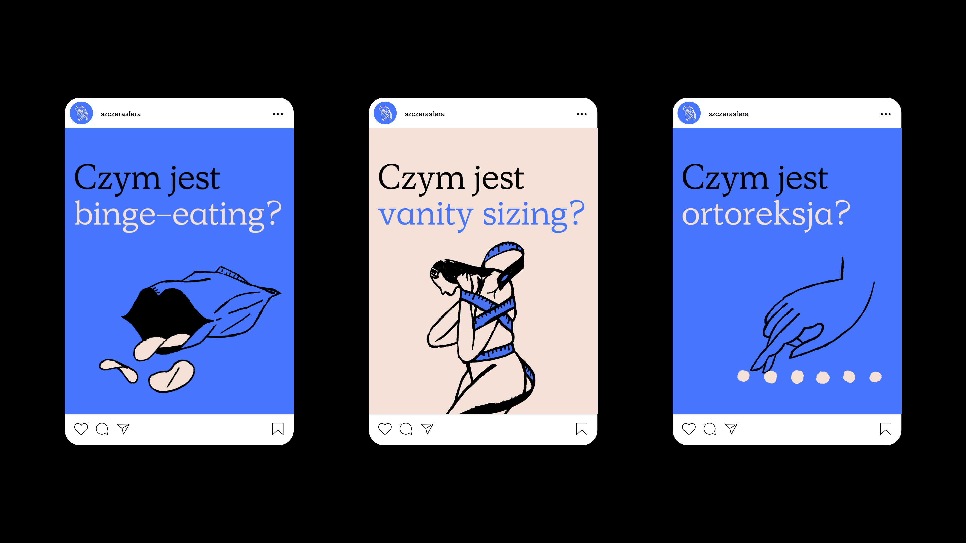 Szczera Sfera (“Honest Space”) is a Poland’s first non-profit educational project focused on eating disorders and people’s complex relationships with food. Promoting self-care and raising awareness of various mental issues connected to eating, the project challenges our social obsession with flawless looks and perfect weight. The educational approach and thoughtful questions encourage dialogue with the initiative’s Instagram followers, who are often directed towards the in-depth specialist articles published on the project’s website.