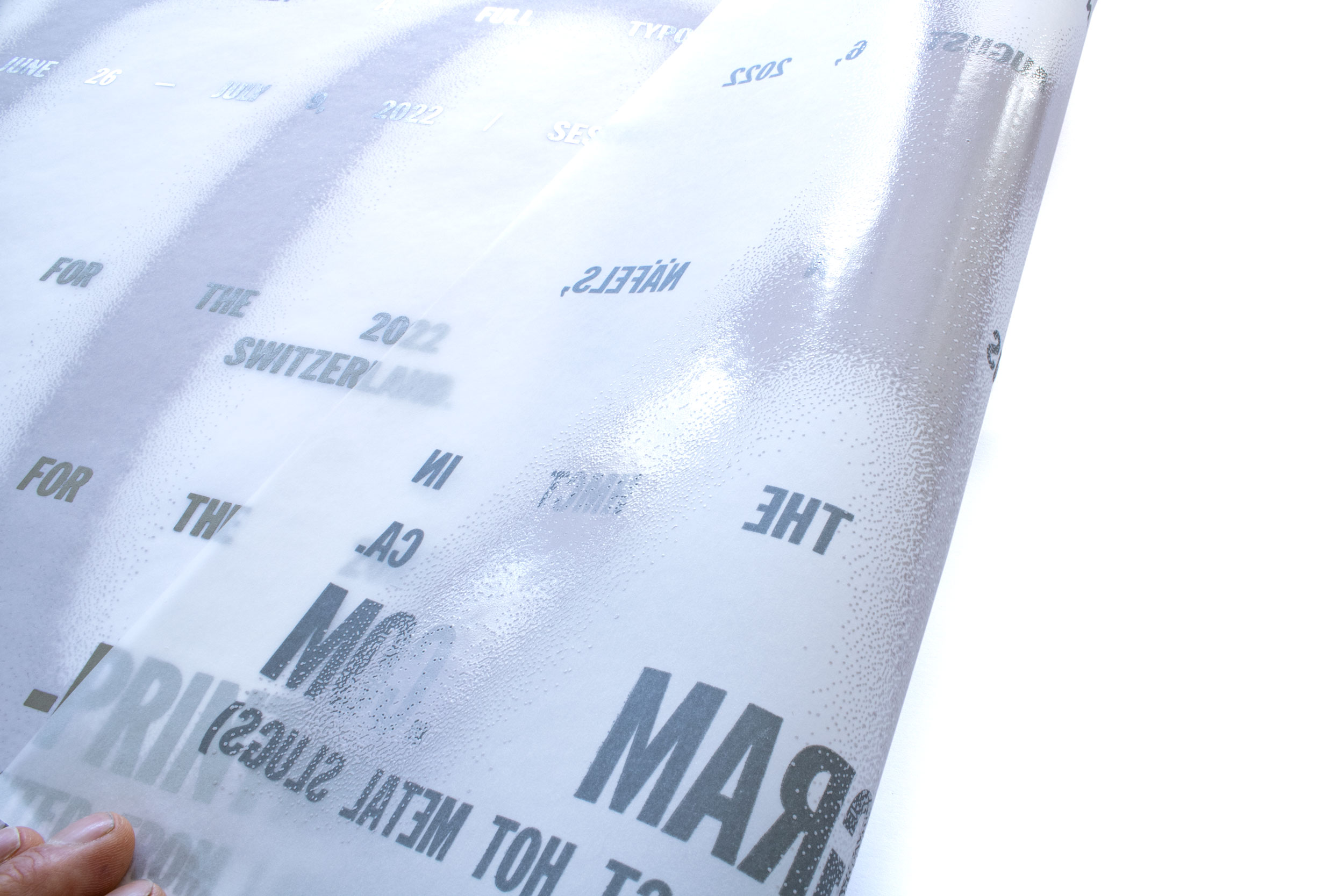 The posters have been letterpress printed back-and-front with laser-cut linoleum and freshly cast Ludlow hot metal slugs. In letterpress printing, the visual topic of unsharpness is hard do accomplish. It took me quite a while to develop the visual effect of these matte, dissolving letterforms in white-on-white.