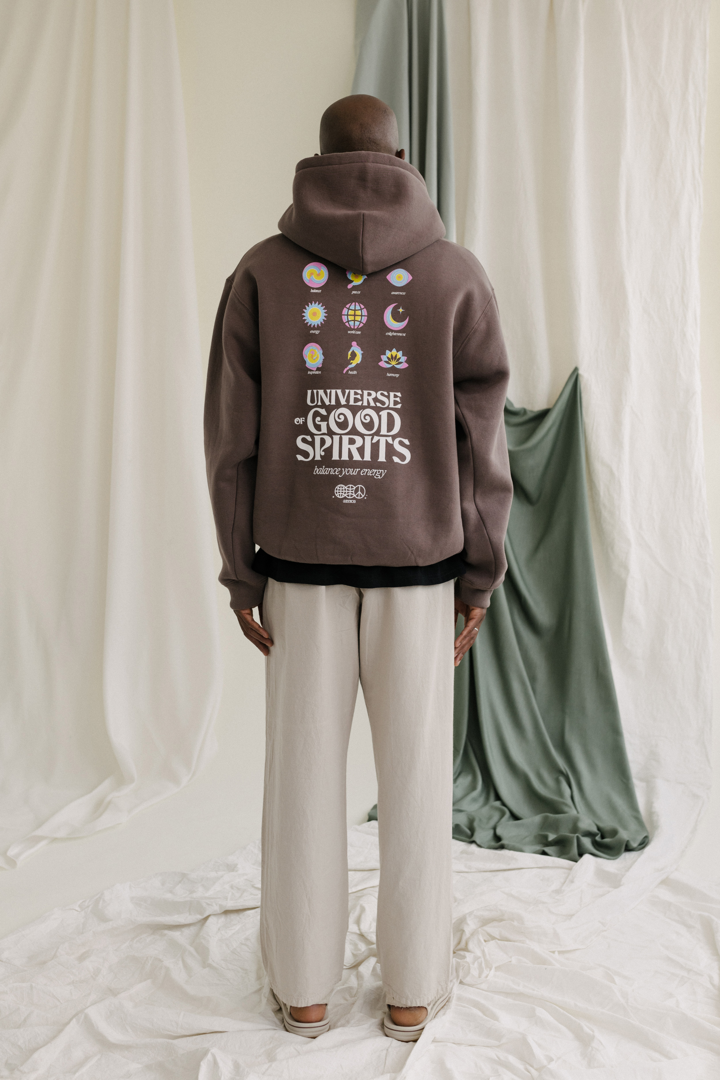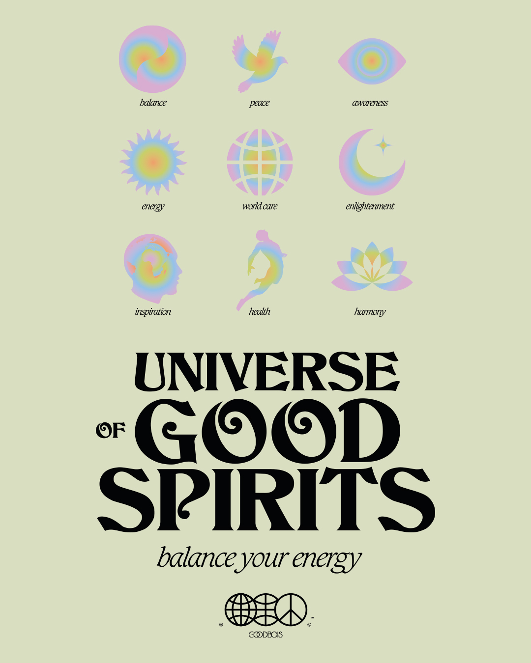 Like the round artwork on the T-shirts, the “Universe of Good Spirits” is inspired by graphics with quotes of the division of our energy and aura. The text added underneath of this artwork was set in Pragmatica, a font which has been long in use for Goodbois over the past five years.