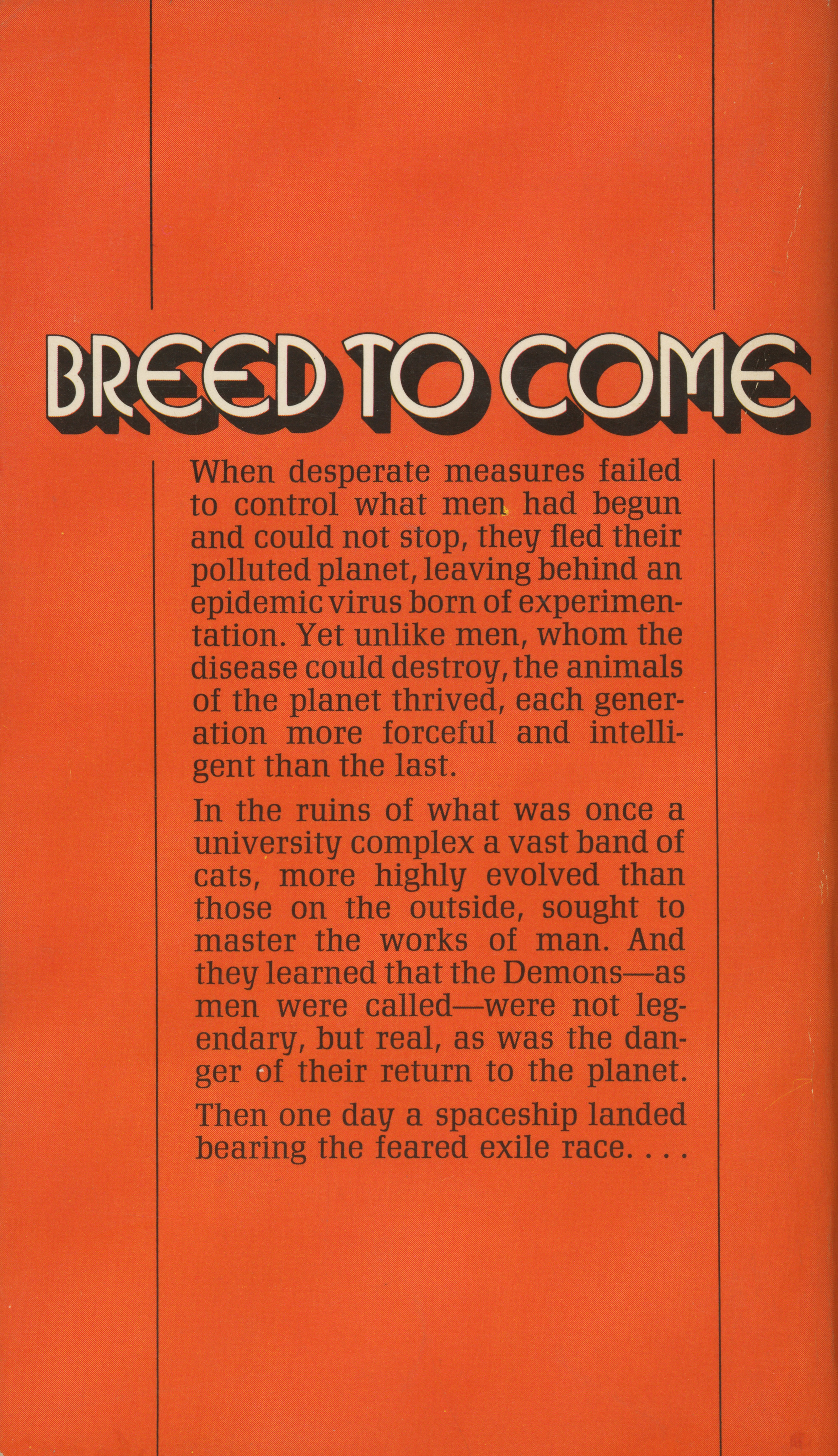 In the ruins of what was once a university complex a vast band of cats, more highly evolved than those on the outside, sought to master the works of man. And they learned that the Demons – as men were called – were not legendary, but real, as was the danger of their return to the planet.