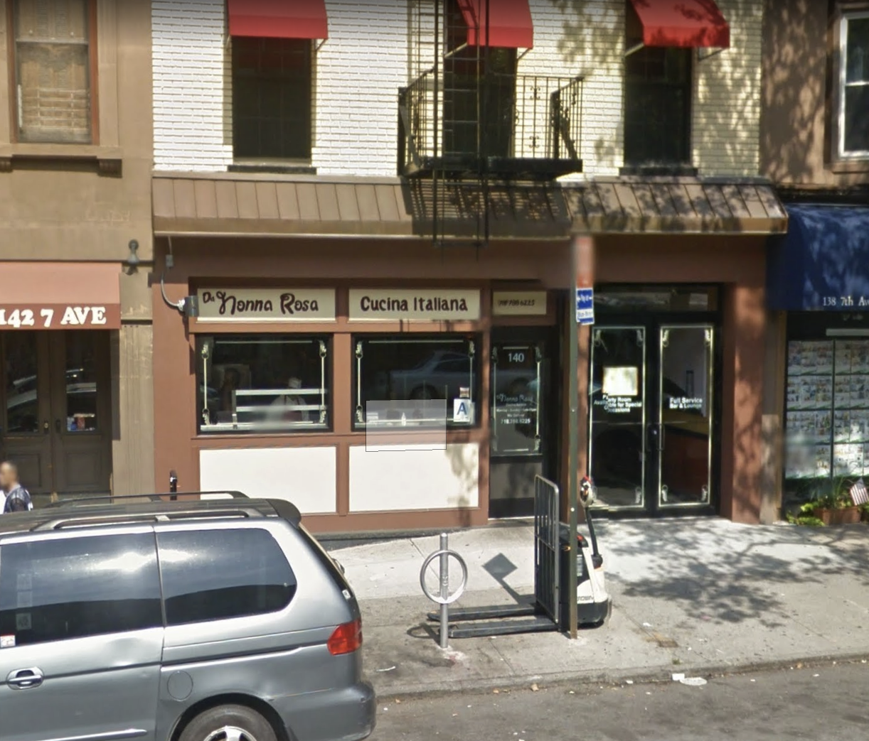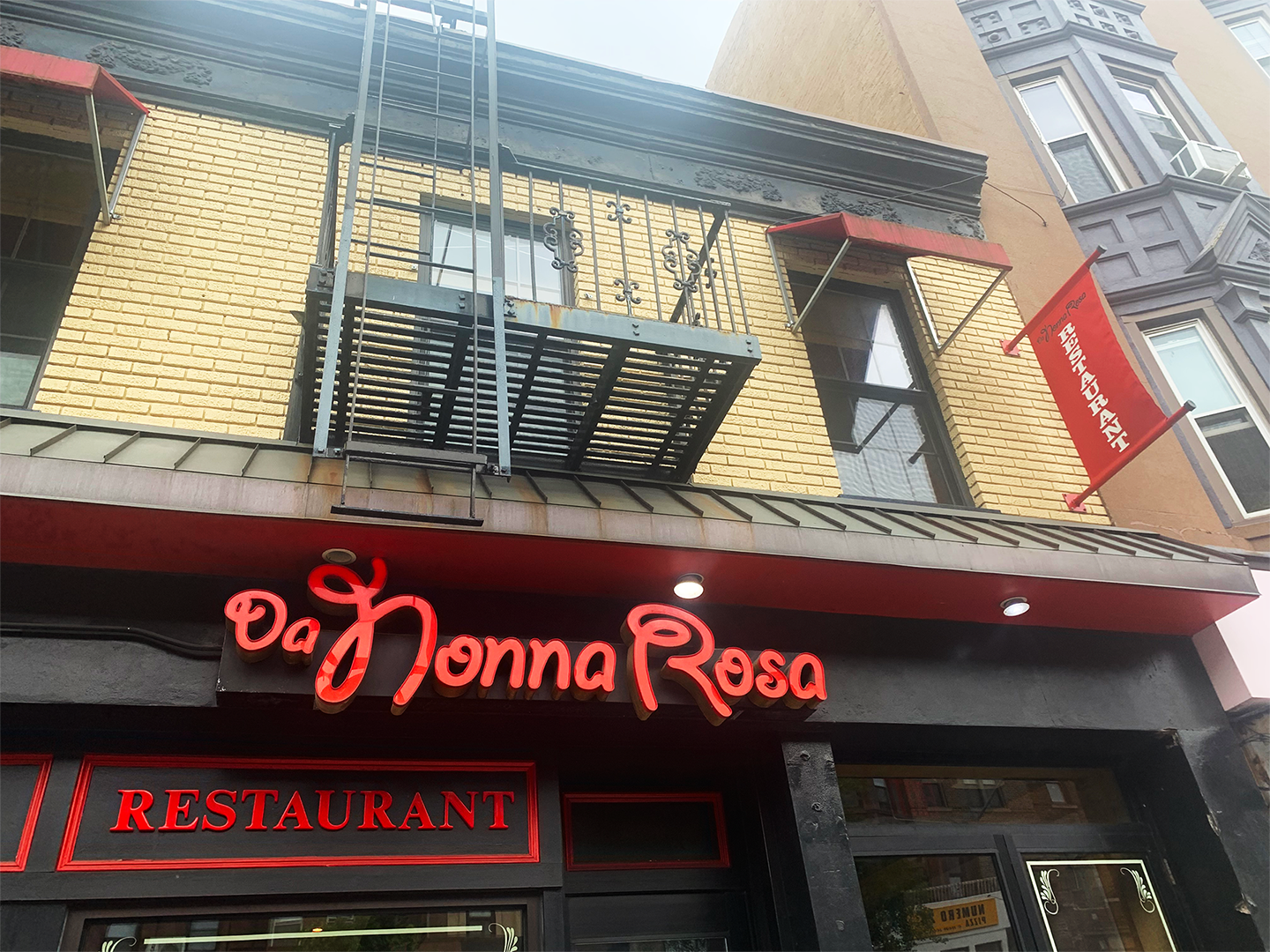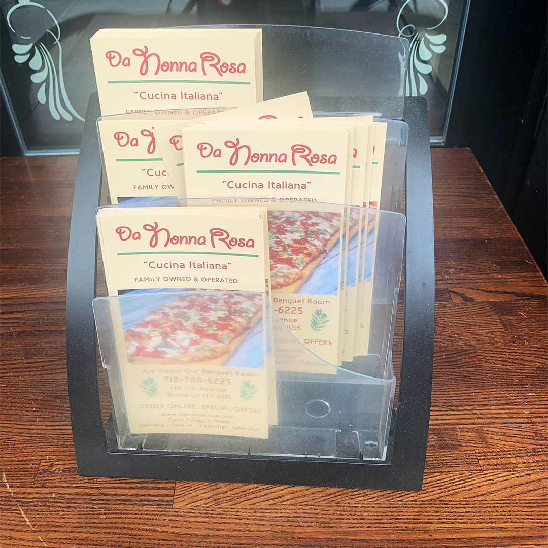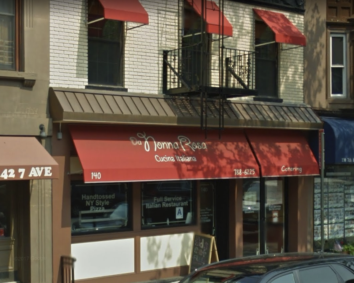 Da Nonna Rosa, an Italian restaurant and banquet hall, located on 7th Avenue in Park Slope, Brooklyn, opened its doors in 2011. A Google Street View snapshot from around the time of its opening shows the original Giddyup logo printed in white on a red canvas awning. At some point within the following two years, the sign was upgraded to backlit raised acrylic letters, featuring faux bold Giddyup. The menus, window decals, and floor mats still feature the logo in its original weight. The website features a stroked version of the logo with a glow effect, seemingly an illustration of the exterior sign. The website also features a 3D scan of the restaurant interior for anyone interested in paying Da Nonna Rosa a visit in virtual reality.