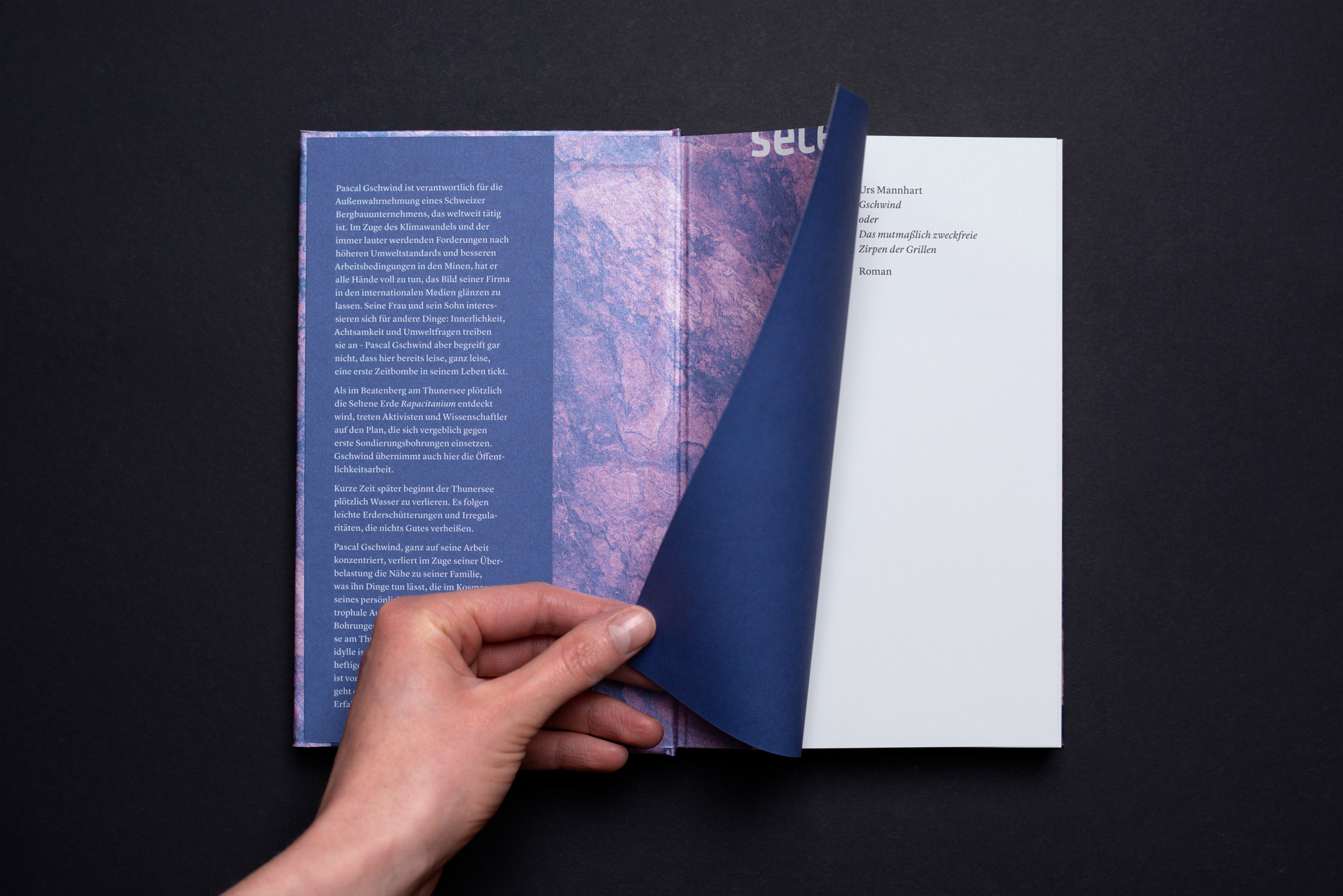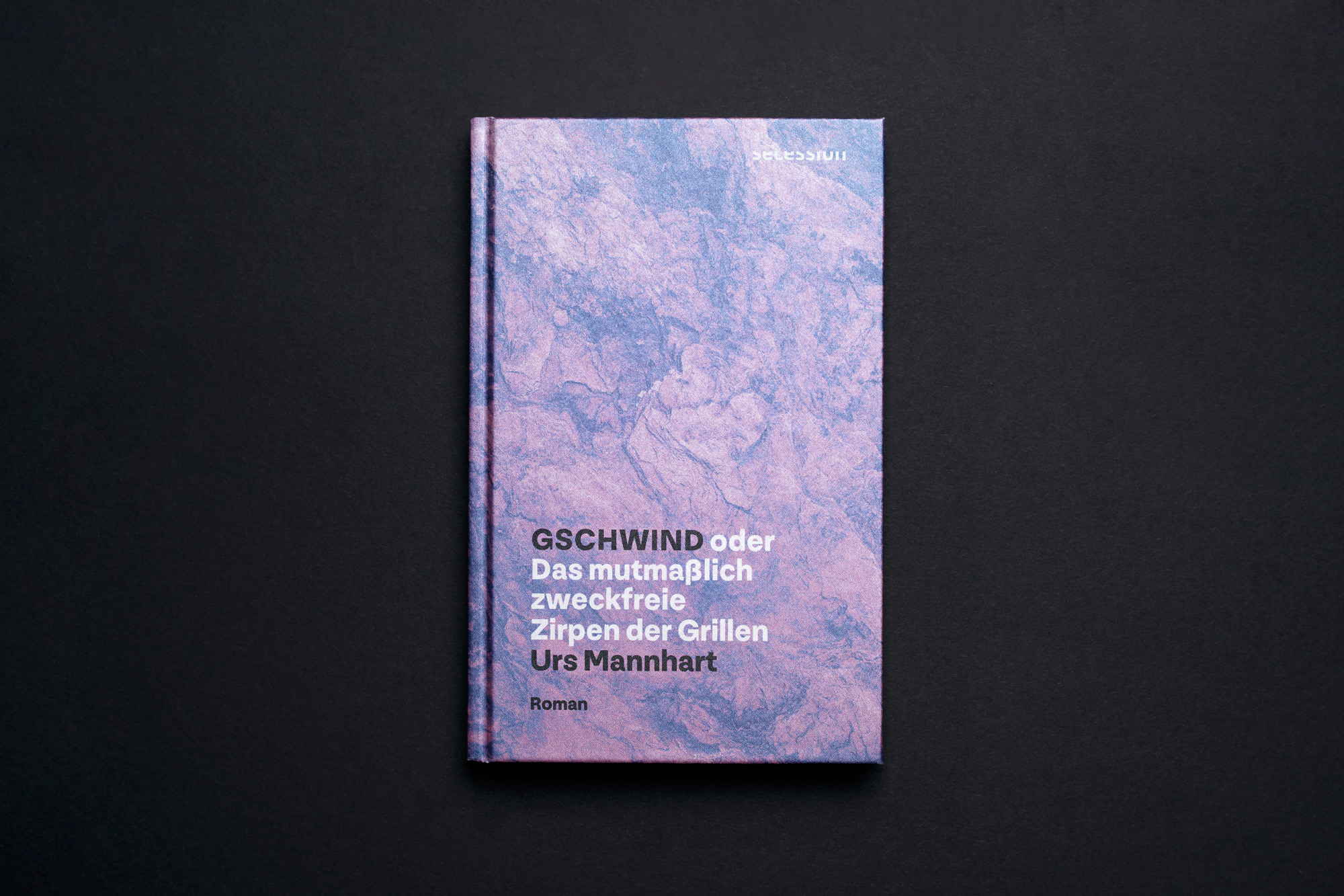 The novel GSCHWIND oder Das mutmaßlich zweckfreie Zirpen der Grillen (“GSCHWIND or the presumably purposeless chirping of crickets”) was written by Urs Mannhart and published by Secession Verlag in Berlin in 2021. Design by Julie Heumüller with typesetting by Eva Mutter and production by Daniel Klotz, Die Lettertypen. Paper cover (binding): f.colour metallic by Schabert.