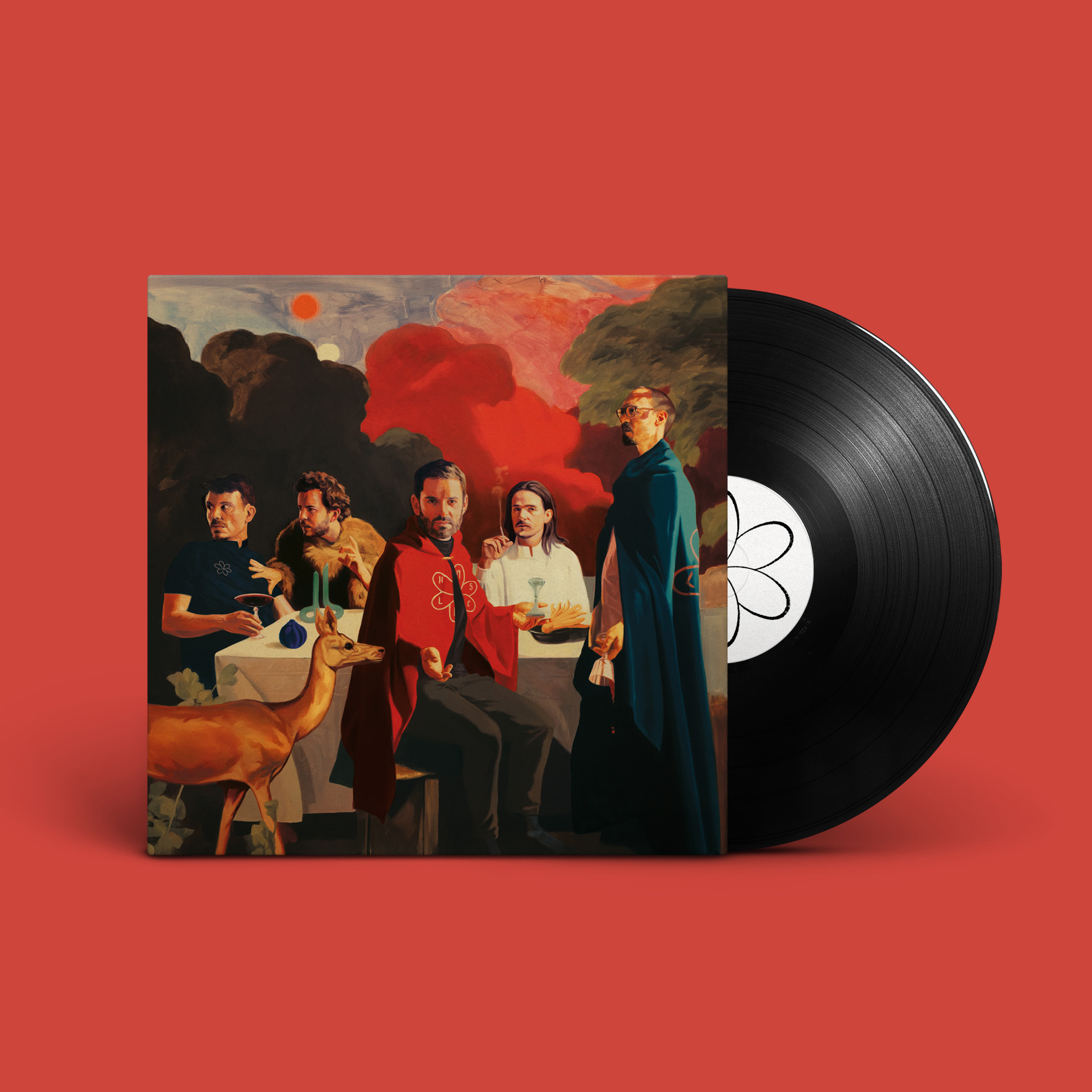 We selected New Gothic Textura because we wanted that medieval and esoteric look. The wine bottle is part of the merch, and connects with the eating and drinking scene of the painting. Jordi Llorens, a natural wine maker from Catalonia, made the wine driven by the music of the album.