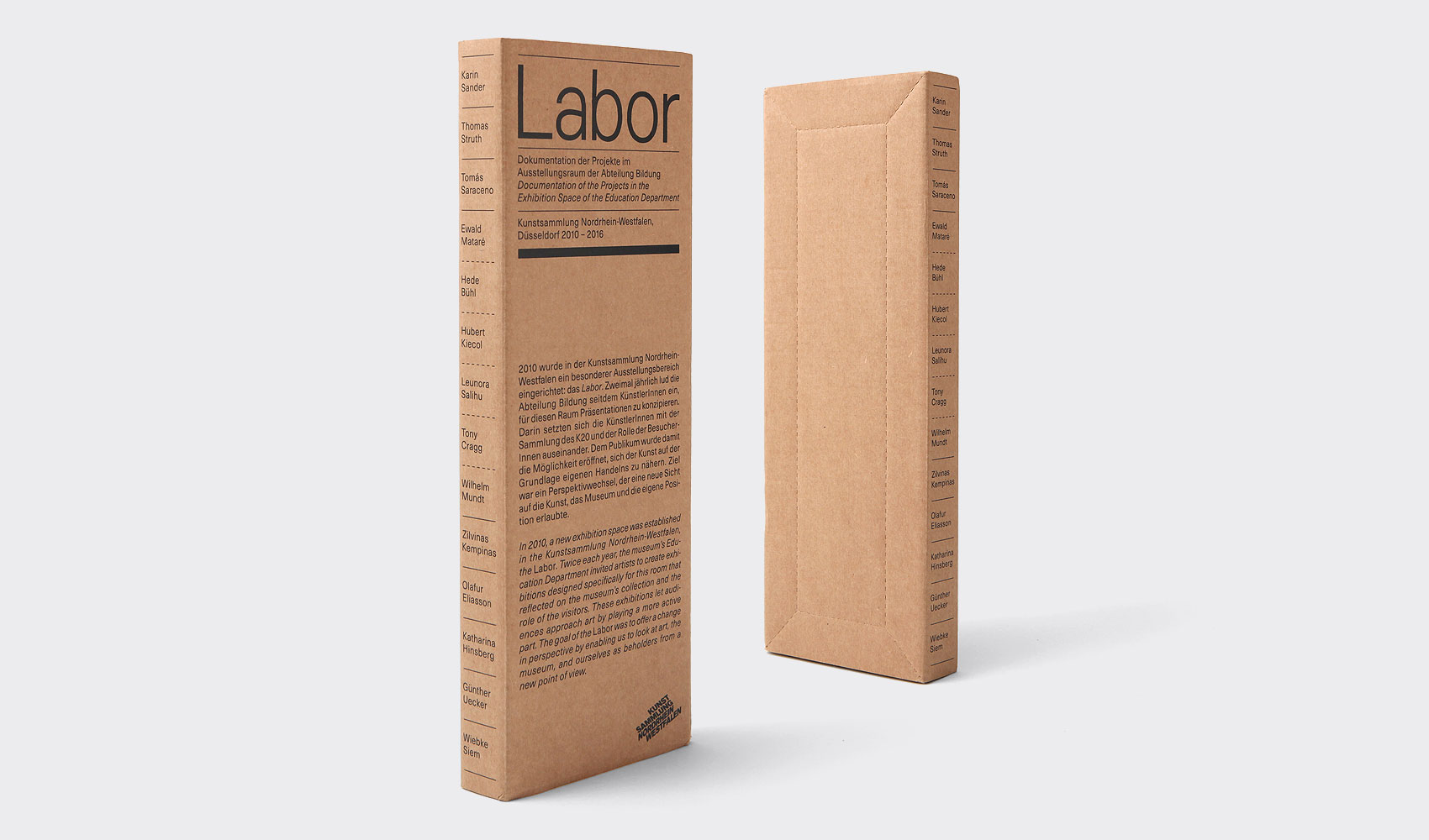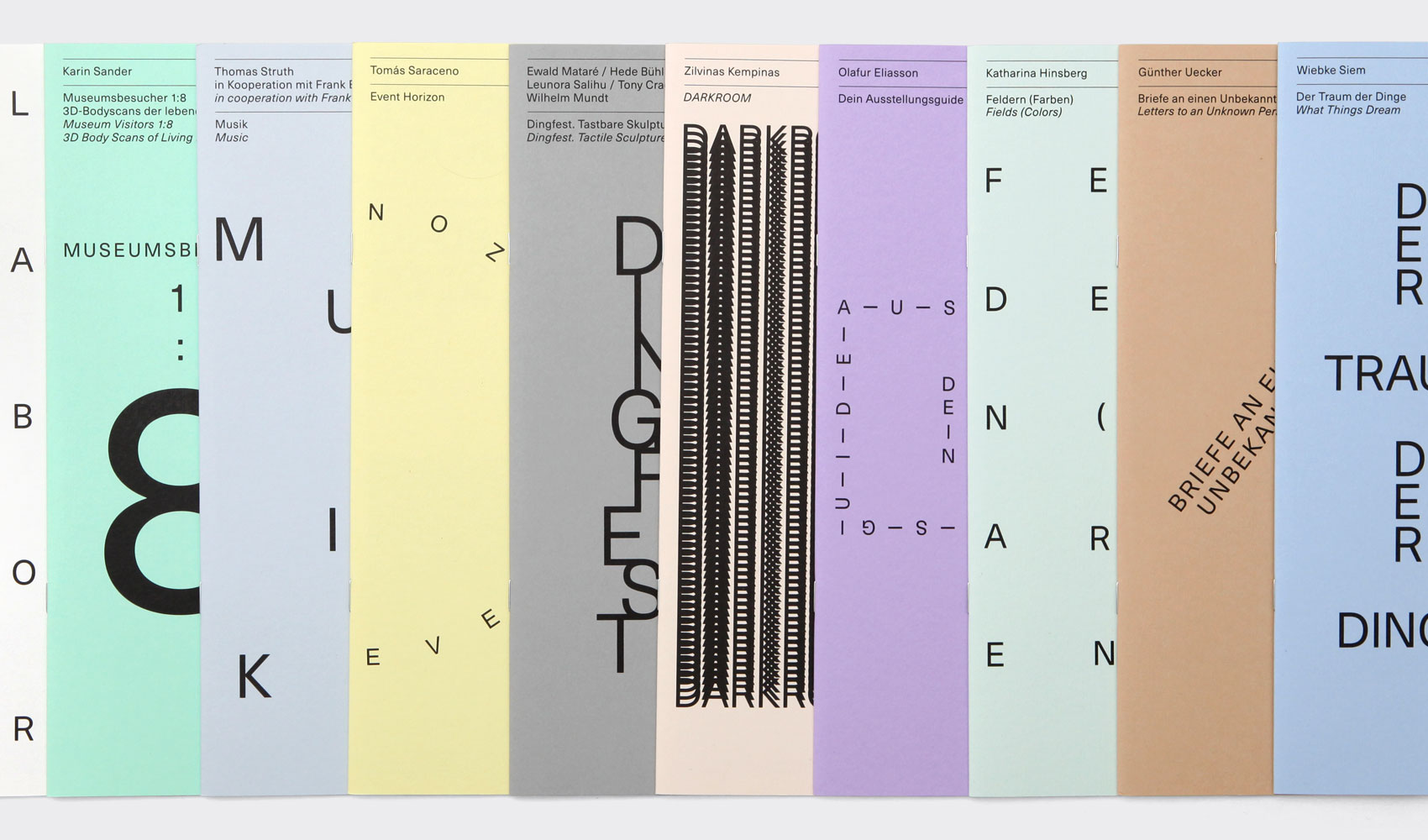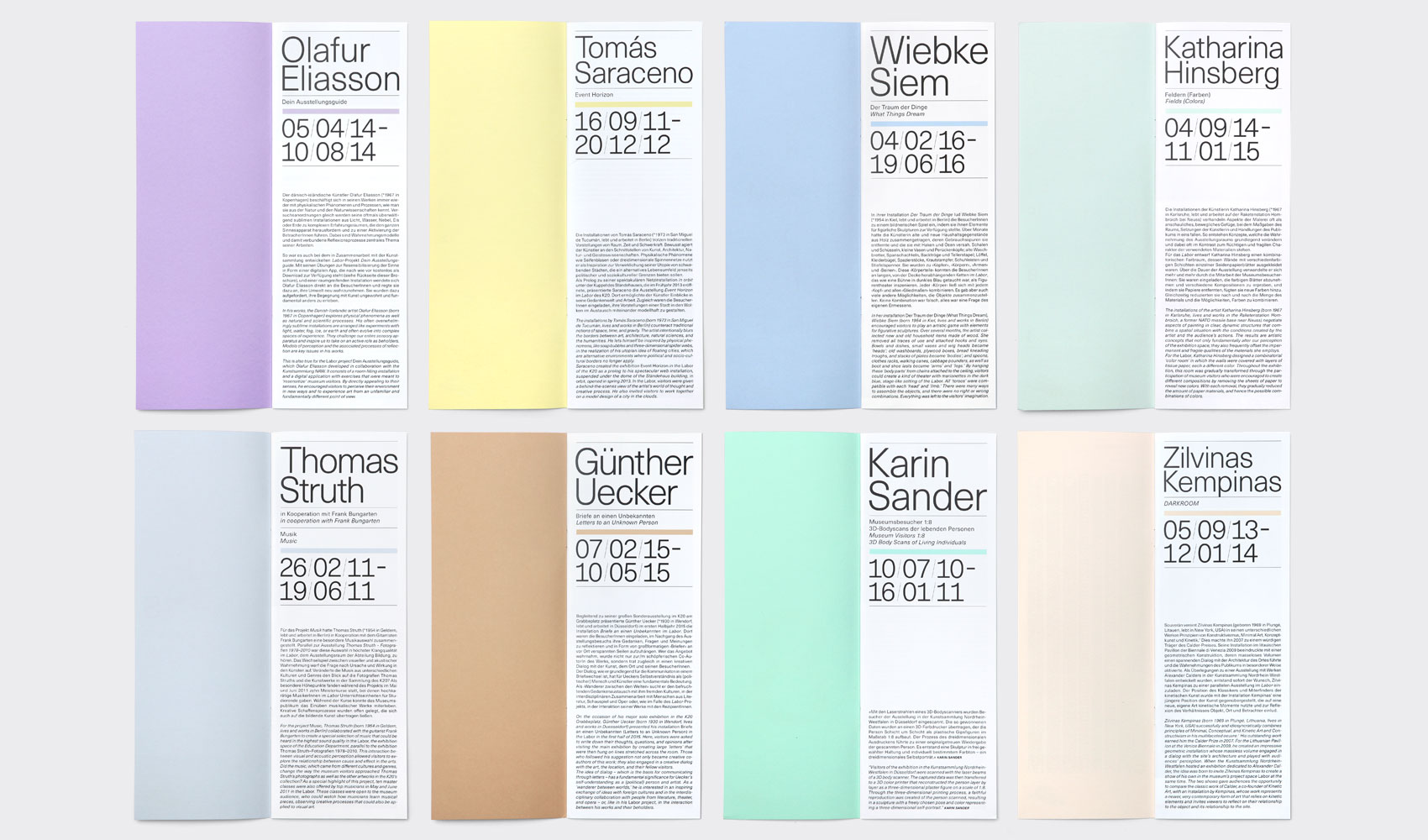 Labor (read as laboratory in German) was a project at the Kunstsammlung Nordrhein-Westfalen in Dusseldorf that spanned between 2010 and 2016. The initiative gave a myriad of artists, including Olafur Eliasson and Thomas Struth, a long narrow exhibition space to interpret in their own way. To document the diversity of approaches and outcomes, we produced with the gallery a boxed series of publications that showcase each artist’s contribution. The proportions of the publication matched the narrow proportions of the exhibition space. Each cover was printed on a different pastel paper stock and featured an interpretive typographic composition relaying the artist’s title. We chose Neue Haas Unica for all copy, because of its neutral and somewhat clinical nature, a reference to the Laboratory.