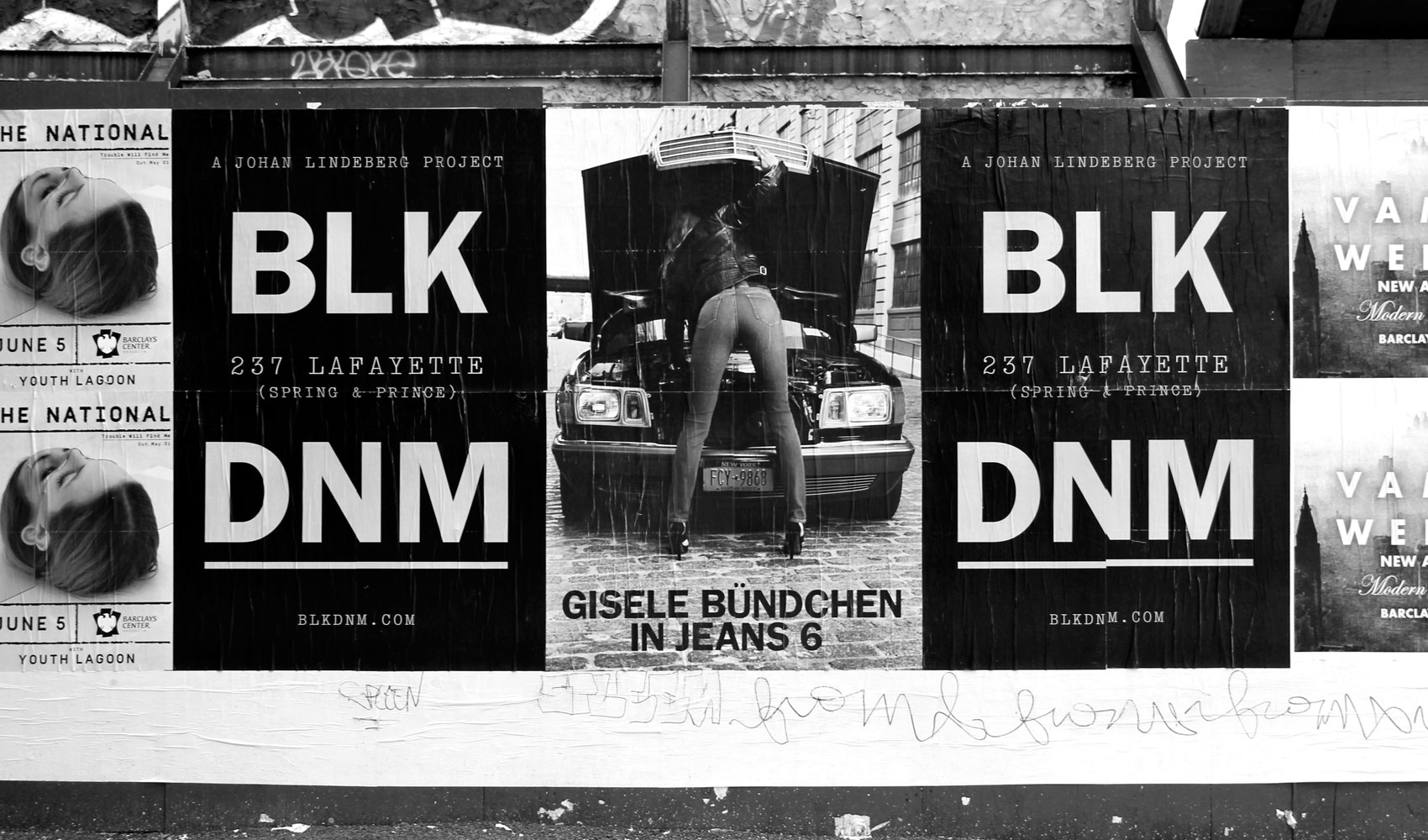 Our design approach was aiming for bold and memorable. Even though our work on these campaigns spanned five years or so, the format was deliberately repetitive. A checkerboard of posters that found the ever-changing imagery sandwiched between a never-changing black poster that said BLK DNM boldly in URW Franklin Gothic. This repetitive nature made the brand very recognizable to many New Yorkers who otherwise would have had no knowledge or interest in the brand, but still were aware of its presence. Franklin Gothic was chosen for the brand identity because it is unique in being one of the few established sans serifs that has a higher contrast—which we knew would give it a visual distinction among the glut of low contrast sans of that period. It’s also a New York typeface through and through. A typographic voice for MoMA, The New York Times, and so many other New York institutions, it has a kind of beautiful ugliness, which we think totally fits to perfect imperfection of the city.
