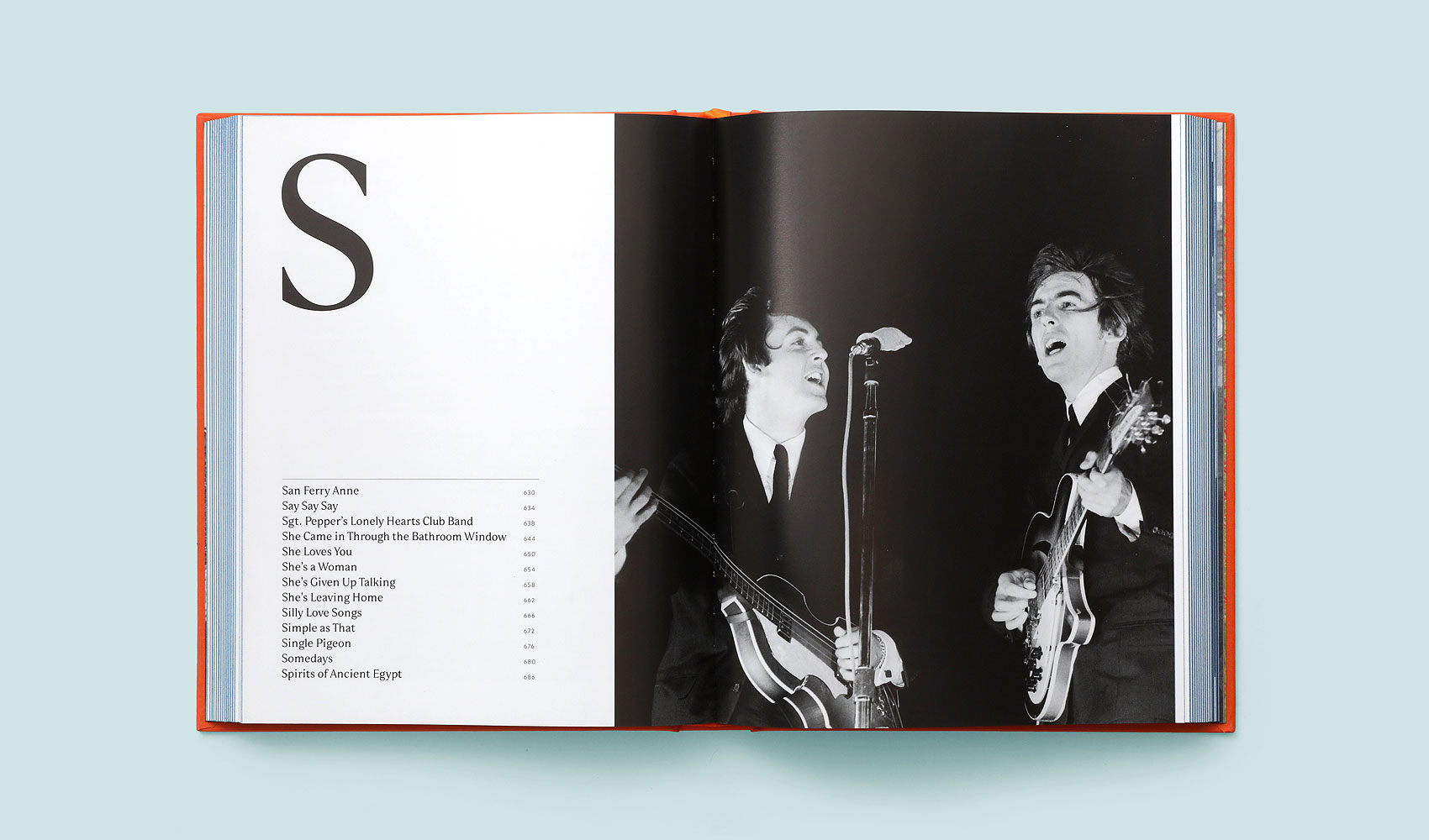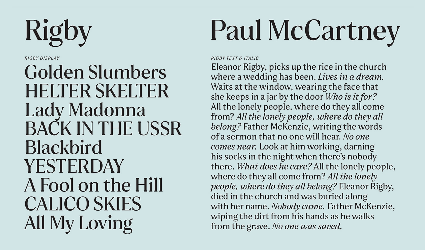 We generally try to incorporate a bespoke typeface into our projects, and this seemed like a good opportunity to design something exclusive for this project. The typeface came about via a stack of our sketched letterforms that had been sitting in a drawer for many years. We had a serif in mind that we wanted to produce but never had the opportunity to finish. A high contrast face with subtle flared serifs and hooked terminals. After designing a beta version of the face, and getting the approval from McCartney and his team, we worked with Omnibus to finalize the design and build out a small family of display and text styles to use throughout the books. This typeface, dubbed Rigby, after the first Beatles melody I can remember listening to, was paired with the lovely Mallory from Tobias Frere-Jones.