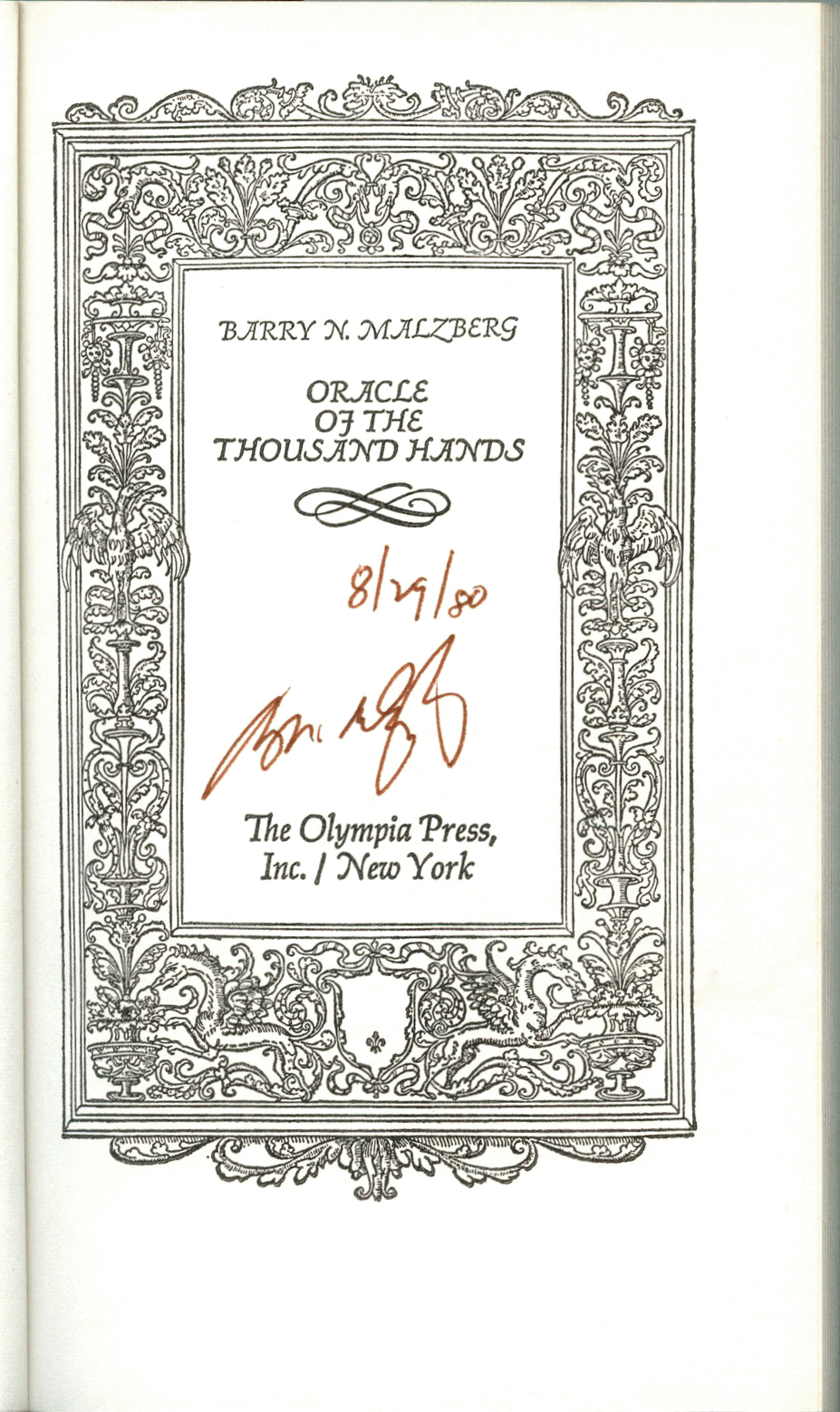 A two-color use of Hermann Zapf’s ornamented Saphir, paired with Bodoni Black (roman caps and italic) and an ominous Rorschach test, for the jacket of Oracle of the Thousand Hands. This edition of the early novel by Barry N. Malzberg was “published by arrangement with the Traveller’s Companion, Inc. and the Olympia Press, Inc.” and “has been especially designed and bound for the members of the Olympia Book Society”.