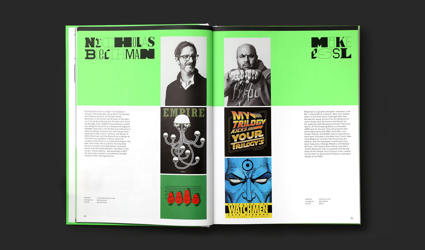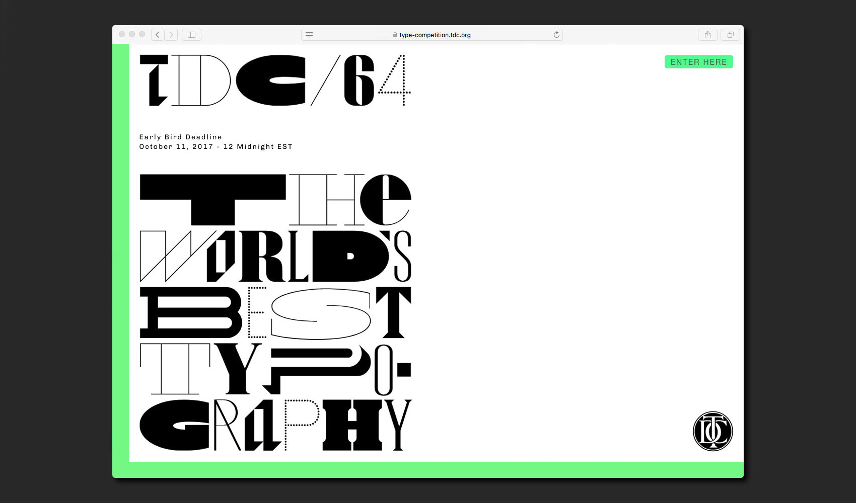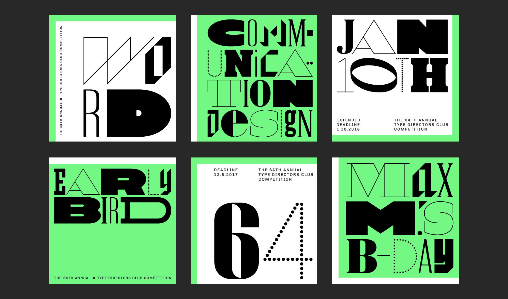 When we were asked in 2018 to design an identity for the Type Director’s Club (TDC) prestigious annual competition, we initially proposed to not use any typefaces at all in the Club’s communications—instead handwriting everything. We were told to go back to the drawing board, and what we proposed instead was to resurrect a dozen abandoned typefaces that we had designed over the years for various clients. We wanted to break these apart and reassemble them as a single typographic voice in a face we called Cast of Characters. It was an exciting exercise for us. Each of the original typefaces had been crafted in the context of a certain function, aligned to a specific client project, and much care had been given to the relationship between the letterforms within each face. To exorcise the context for each face and juxtapose them with random association gave each typeface an unexpected new life. For the TDC we wanted the visual identity system to begin with the fundamental color palette of type design (black and white) and then introduced a bright neon green (Pantone 903) that would allow us to slice up layouts, frame compositions, and add visual emphasis and hierarchy on both digital and physical applications. Cast of Characters is paired with Chivo for text.