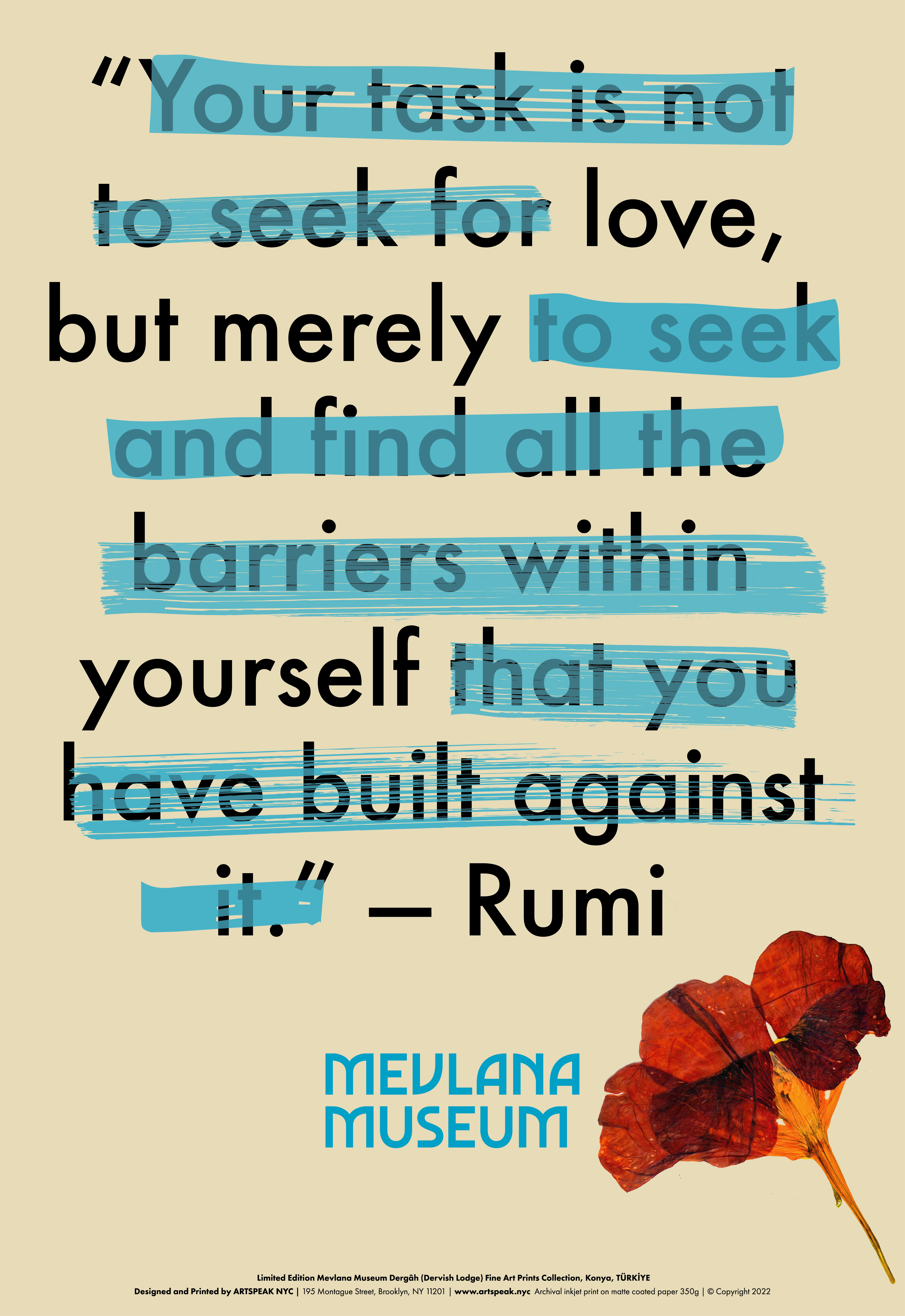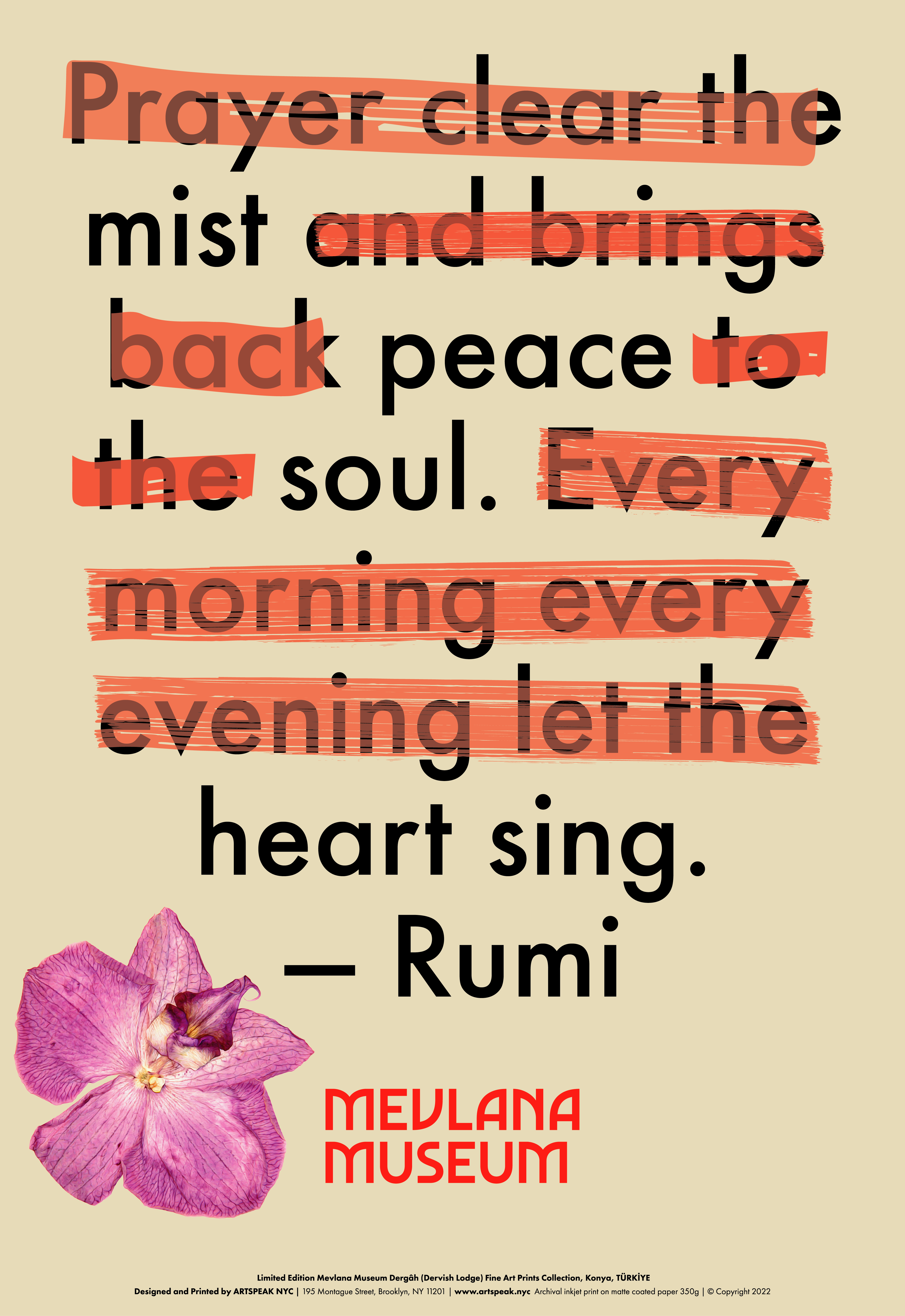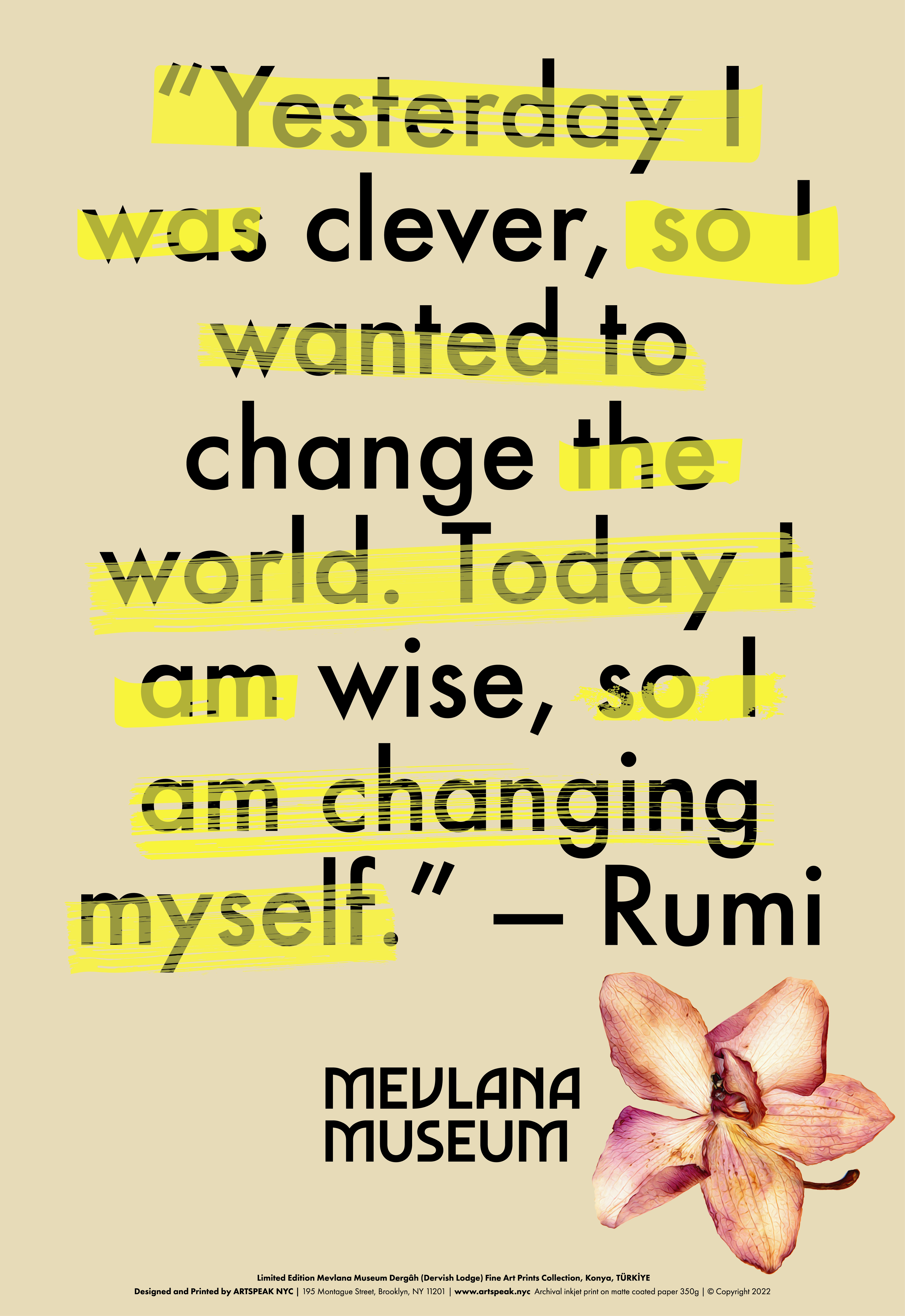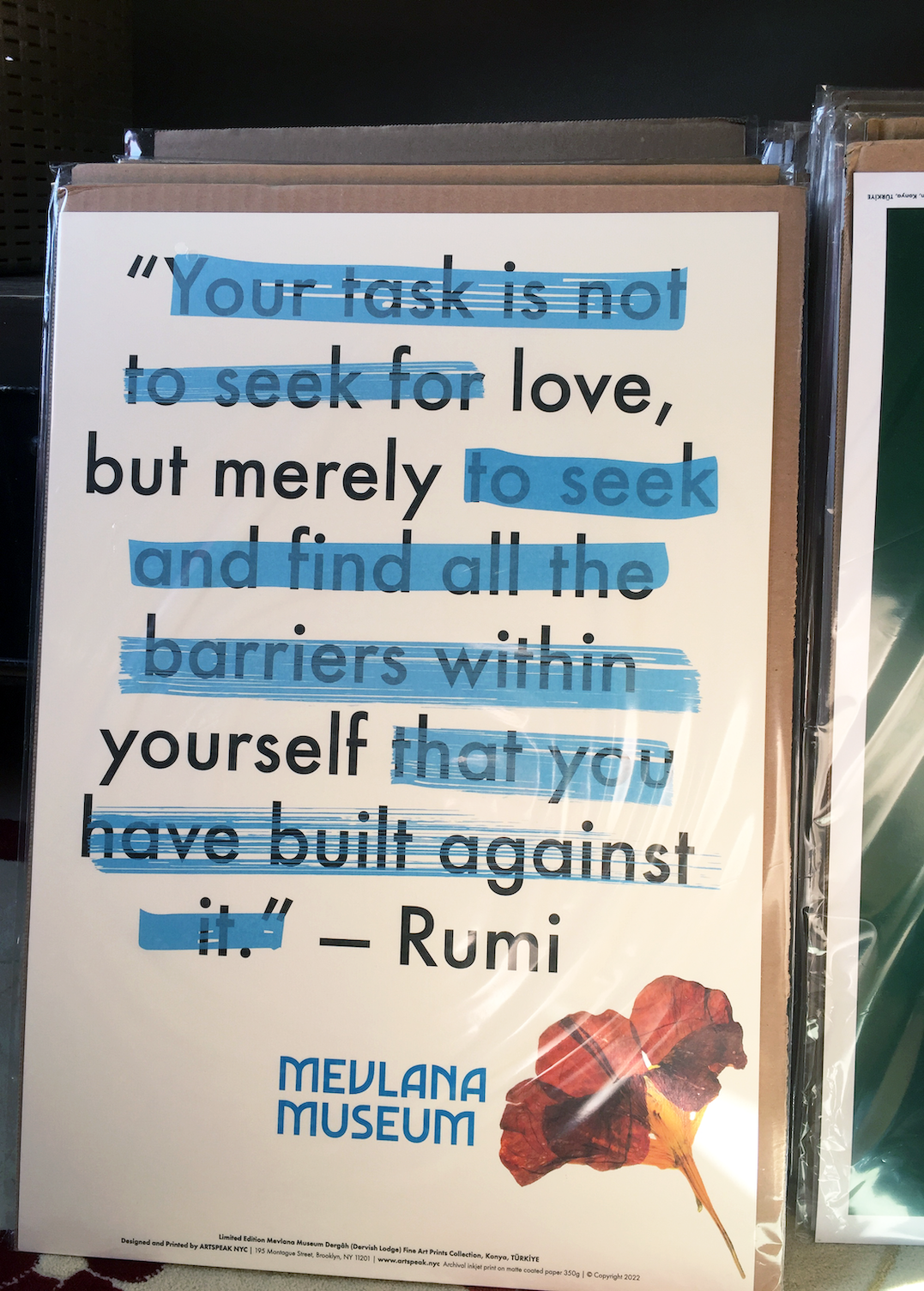 Futura in use for a poster series (vintage book style) for the Mevlâna Museum in Konya, Türkiye, showing some favorite Rumi quotes. The museum is also the mausoleum of Jalāl ad-Dīn Muhammad Rūmī, a Persian Sufi mystic, and also the dervish lodge (“tekke”) of the Mevlevi order, better known as the whirling dervishes.