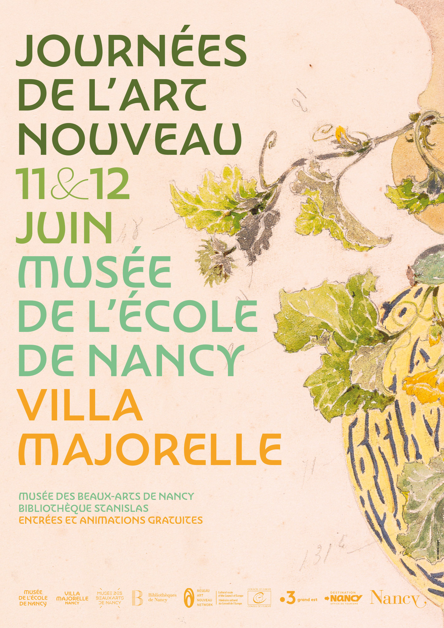 The visual identity and graphic design for the Musée de l’École de Nancy, the Art Nouveau museum in France, was designed by Lab.Leblond.Tytgat in 2018. Their custom typeface, Nouveau, was designed by Jérôme Knebusch with Philippe Tytgat. The typeface family was published as a retail typeface in six styles (Nouveau Crocus, Dahlia, Gingko, Nenuphar, Rose, Thistle) and five weights (Hair to Medium) by Poem in May 2022. A variable font assembles all styles in one. In the communication of the museum, Nouveau is paired with Marat by Ludwig Übele.